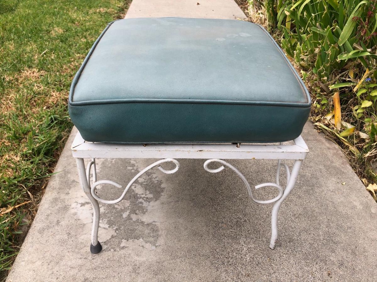 White wrought iron foot stool. Comes with cushion. Good outdoor condition.