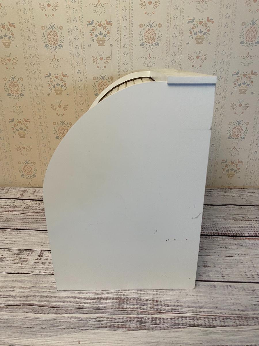 White roll top desk organizer. Multiple drawers and slots to keep your desk clutter free. Not very big, water bottle for size. Good condition, but dusty.