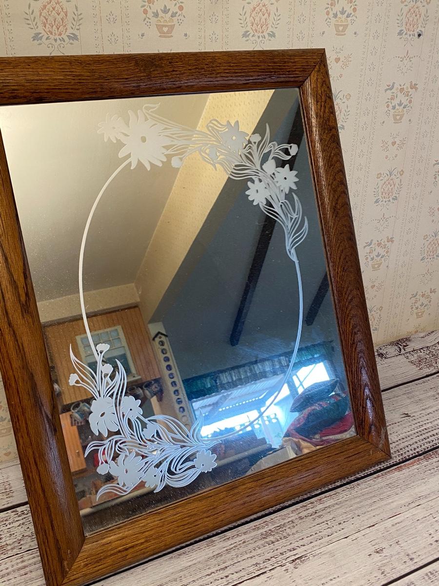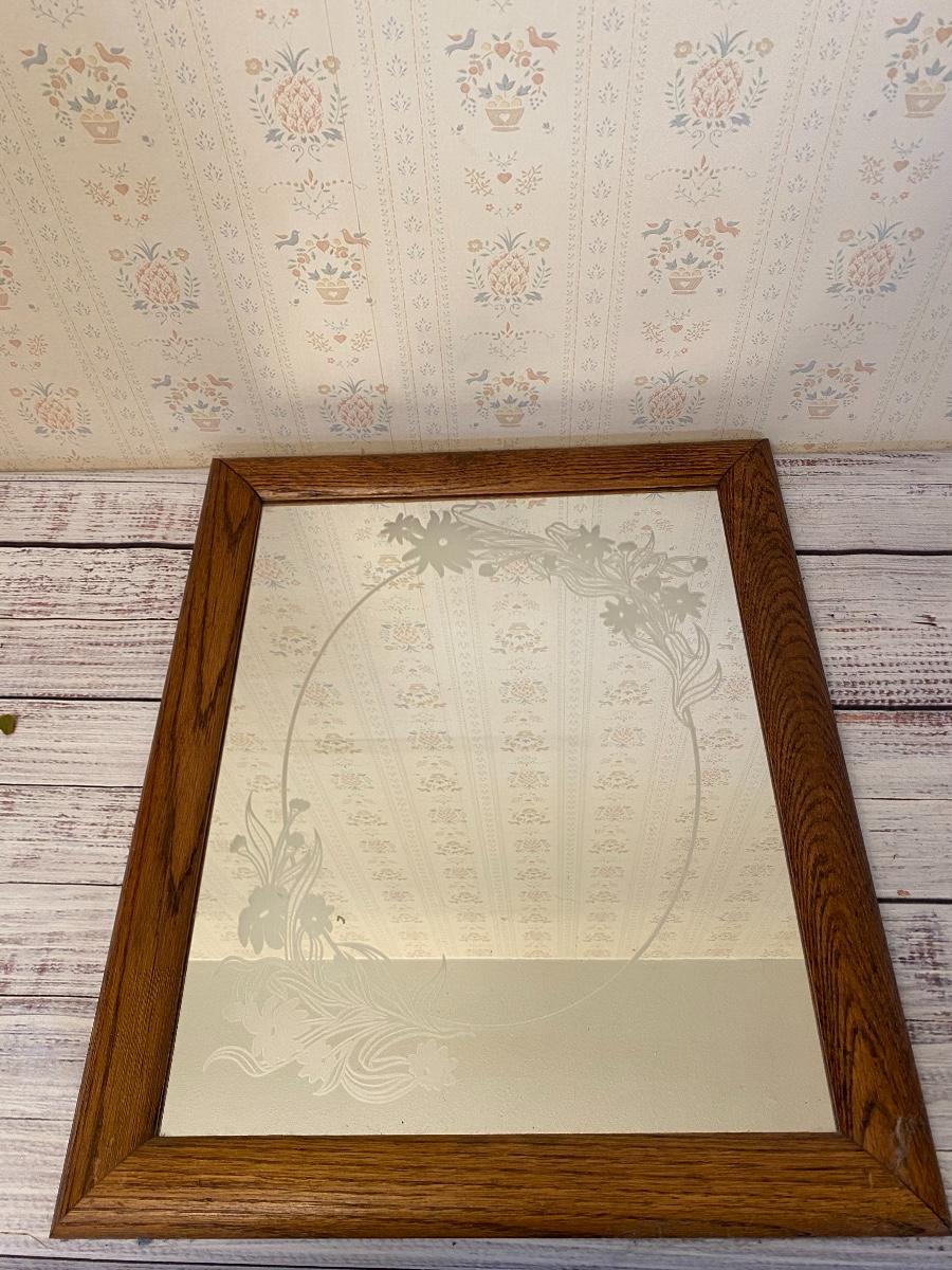 Retro frosted floral wall mirror. Wood framed mirror, in good condition. Under 24".