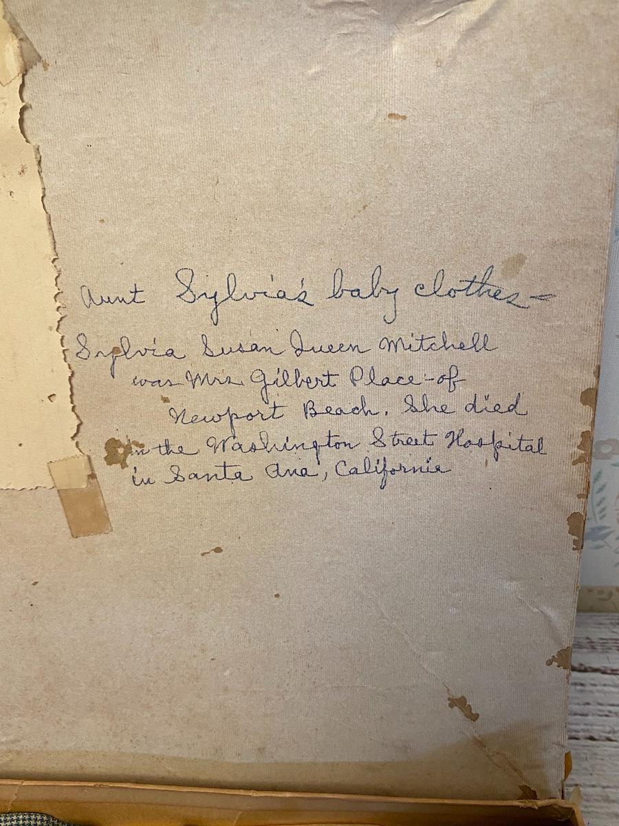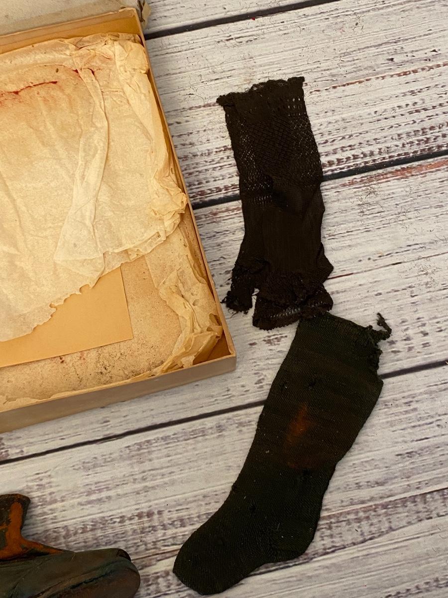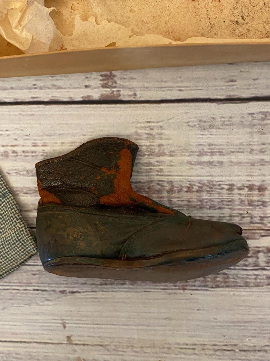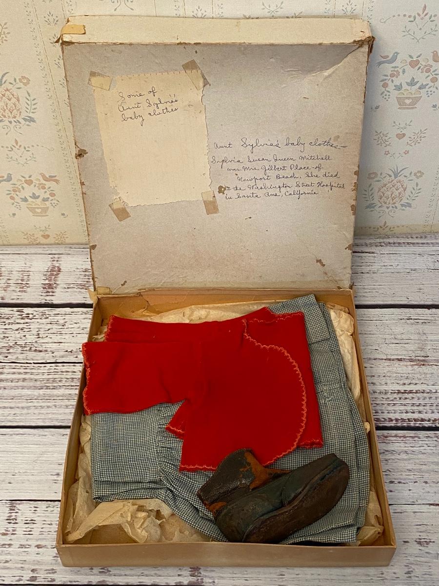 Antique baby clothing. Note on box is info on who they once belonged to. Includes a shoe, socks, sweater and dress. Antique worn condition, there is moth holes and material is old.