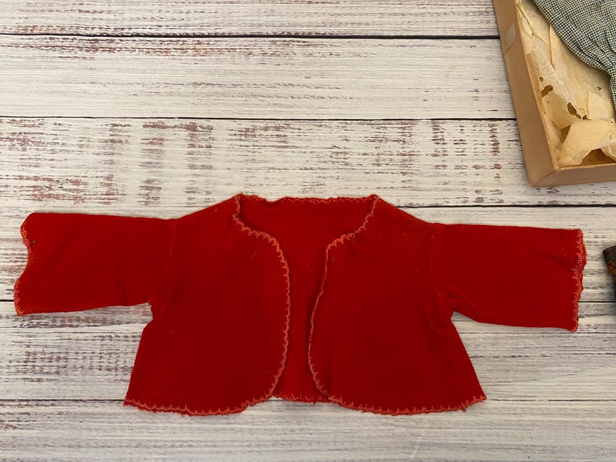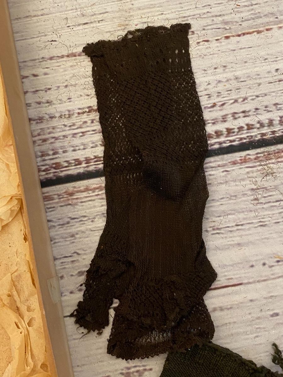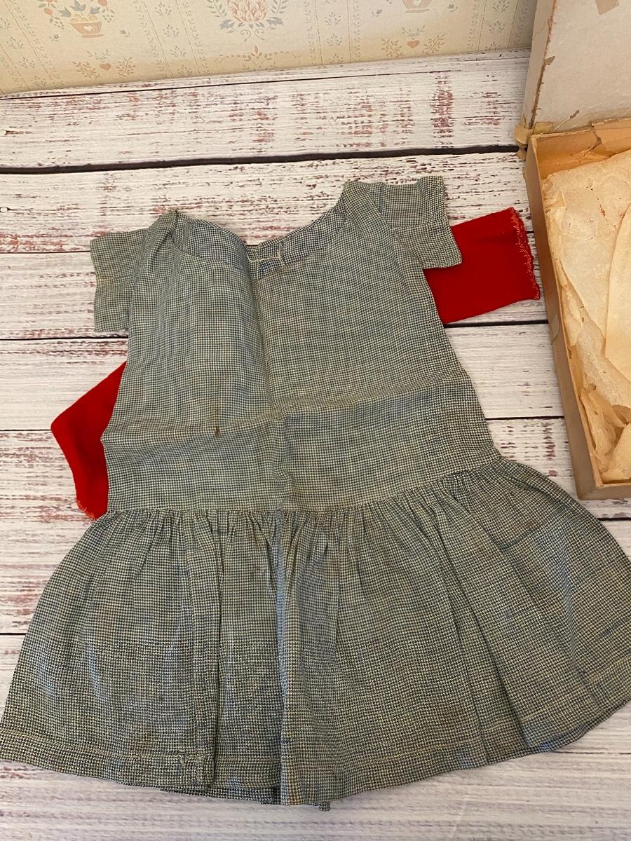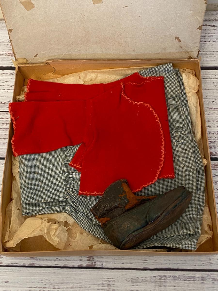 Antique baby clothing. Note on box is info on who they once belonged to. Includes a shoe, socks, sweater and dress. Antique worn condition, there is moth holes and material is old.