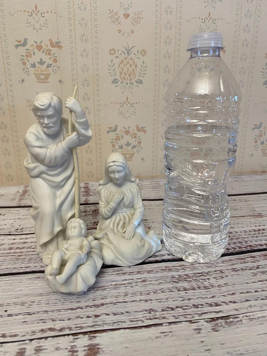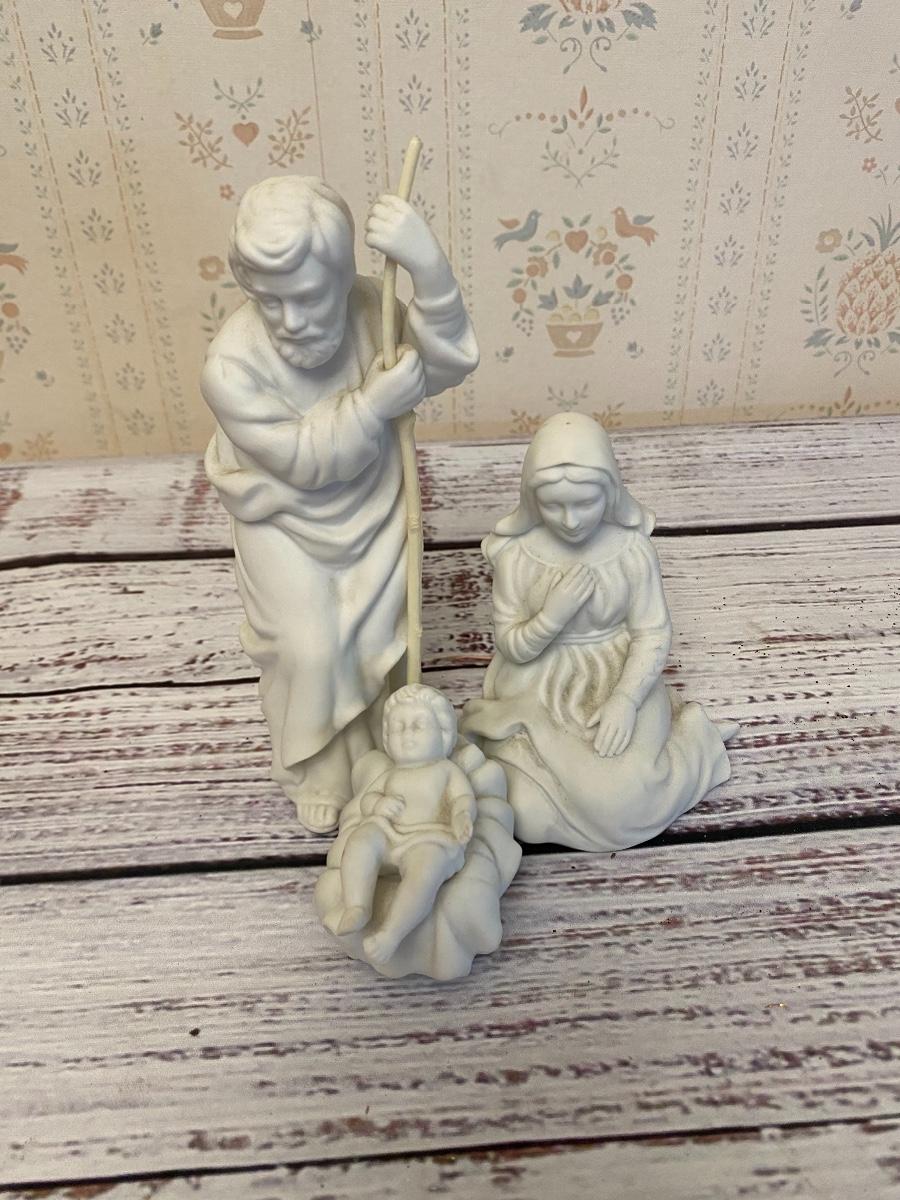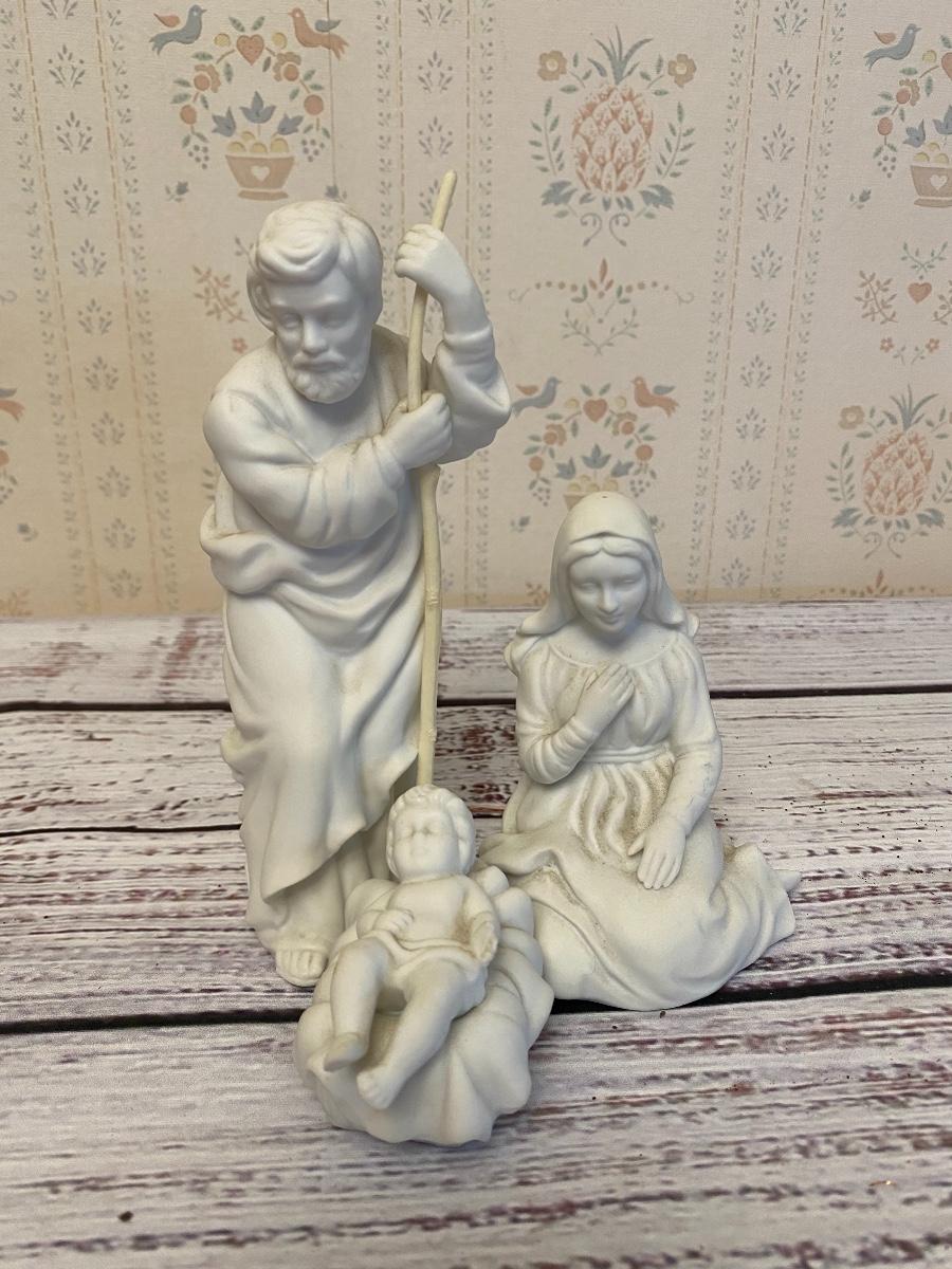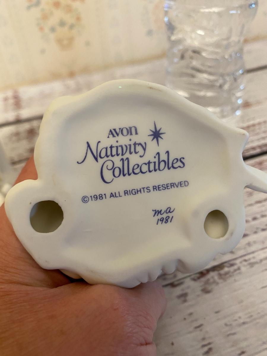 Three piece nativity figurines From Avon. Nativity Collectibles released in 1981, set includes Baby Jesus, Mary, and Joseph. In good condition.