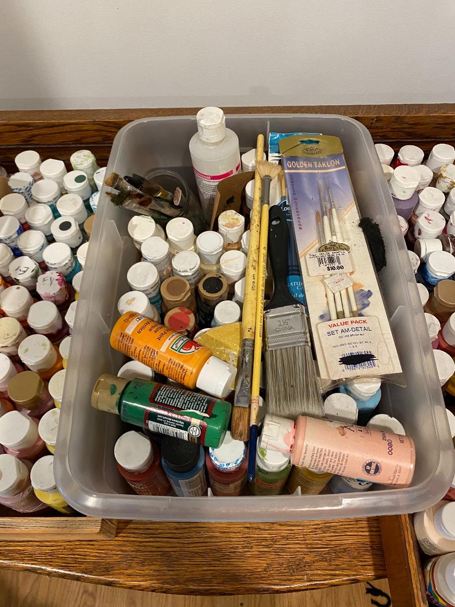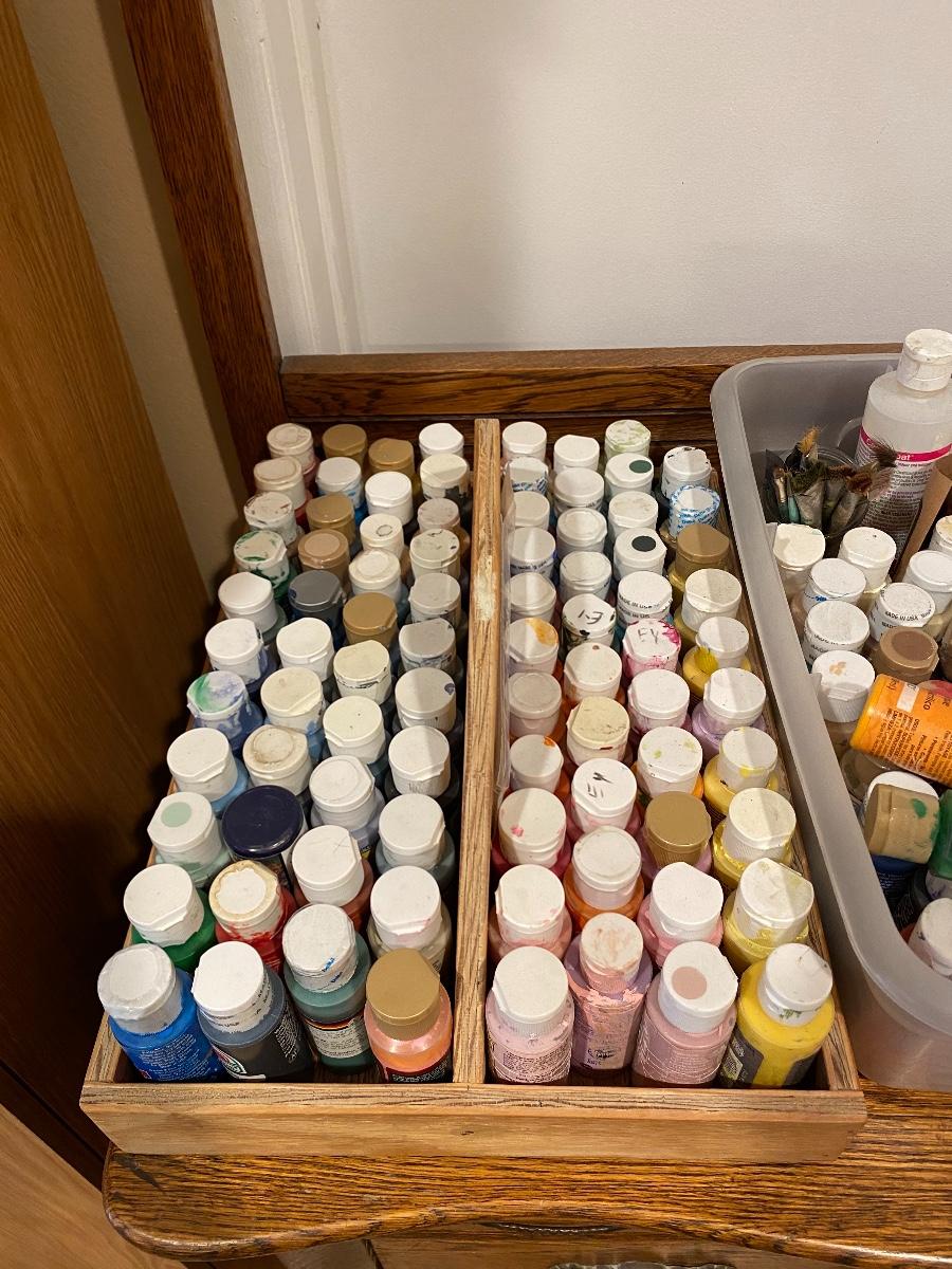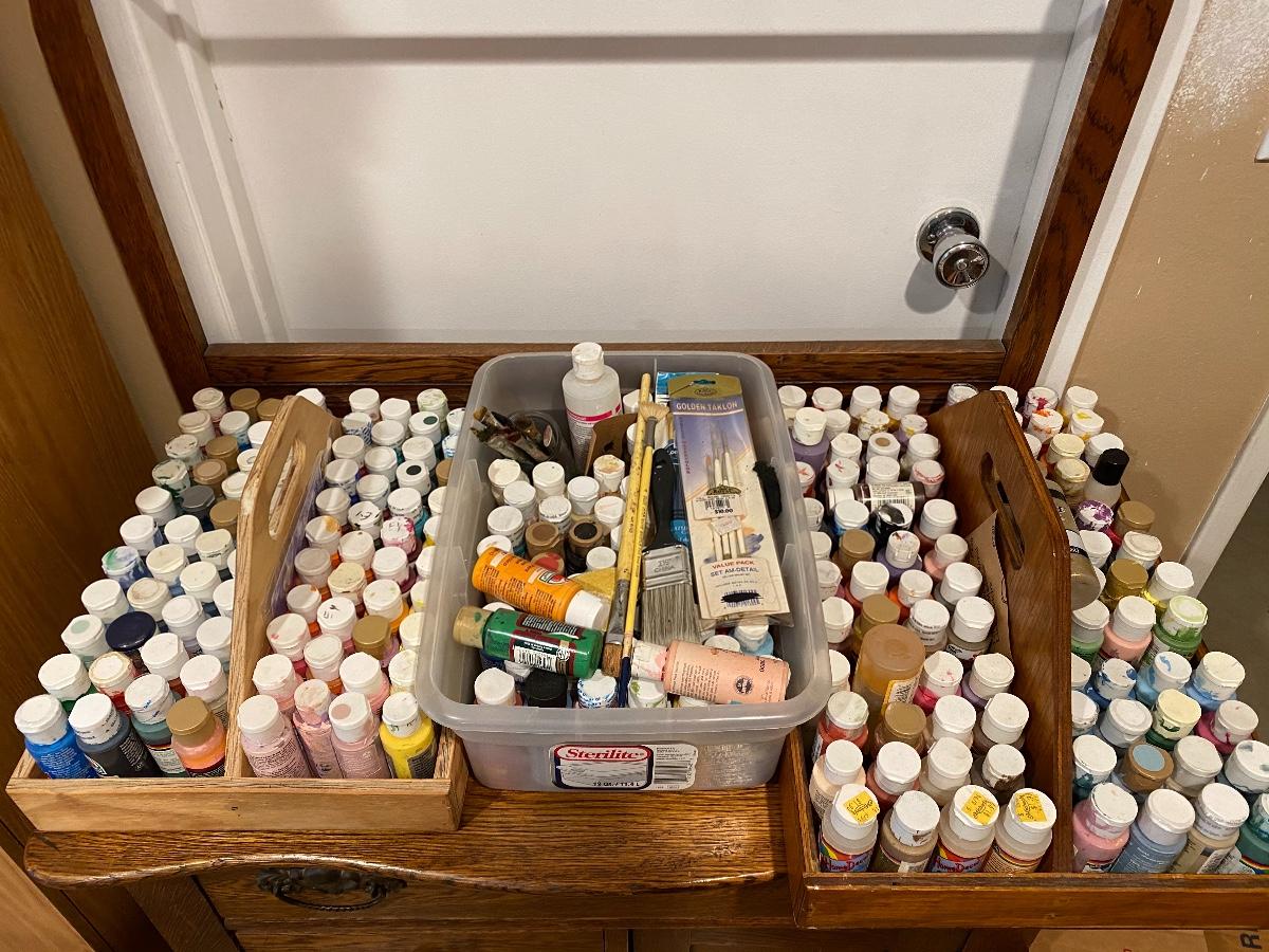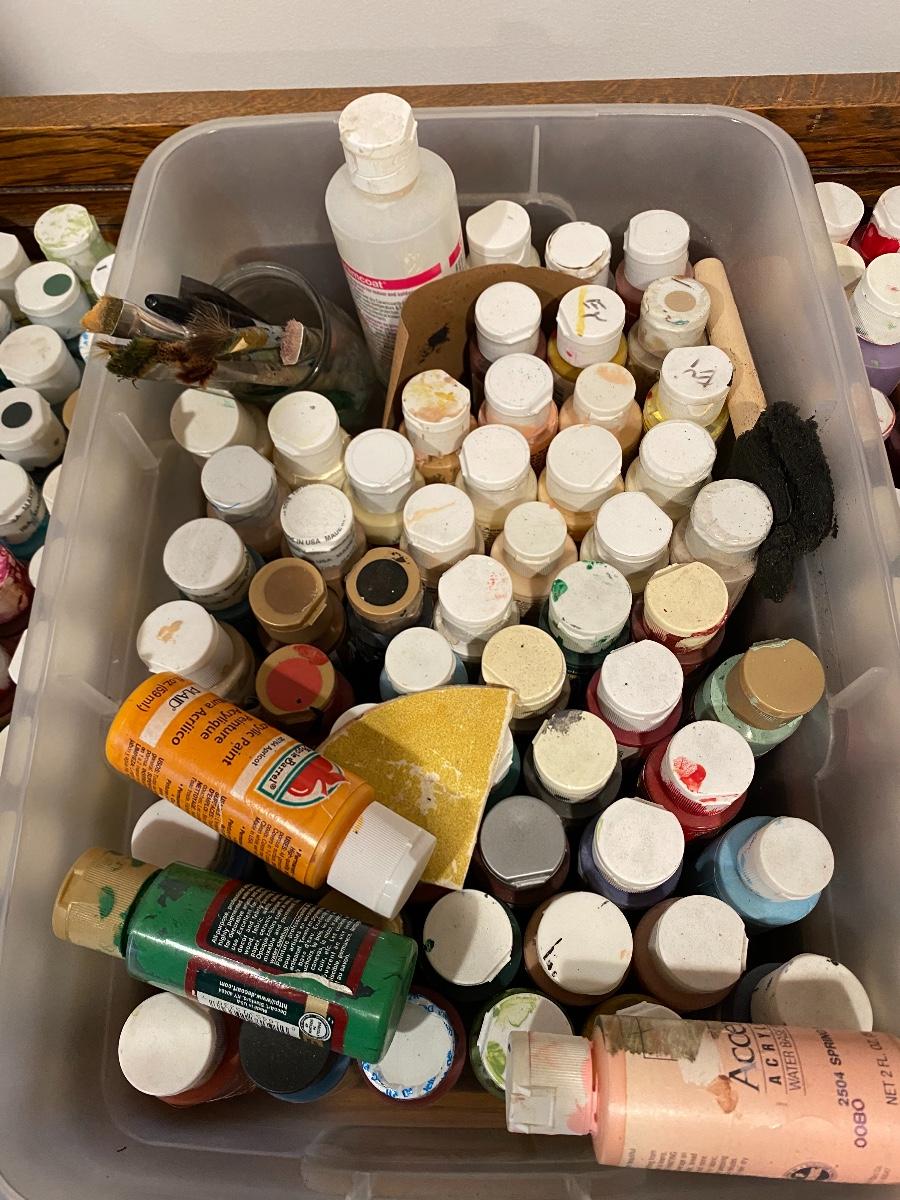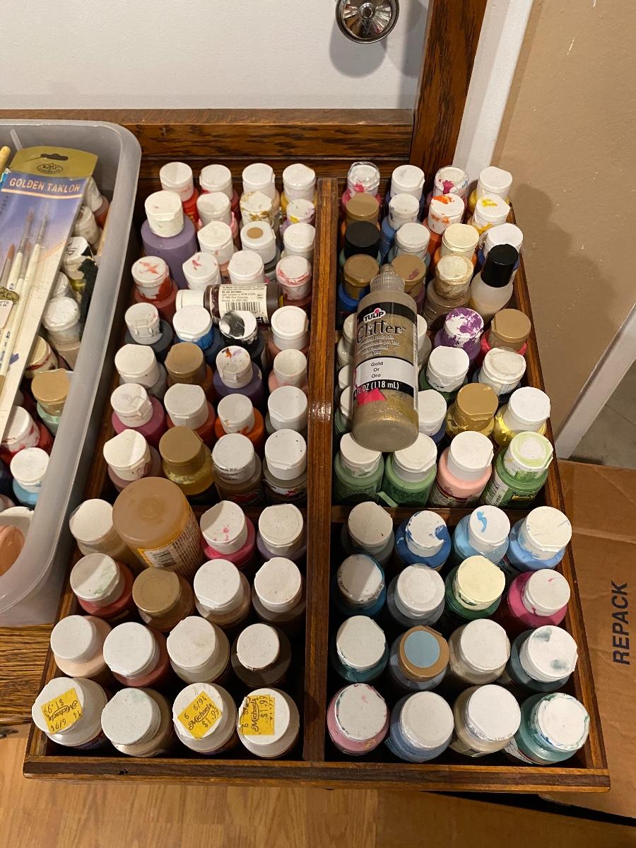 Huge lot of craft paints. Rainbow of colors, some bottles sealed most at various levels of fullness. Come with two wood carry tray totes and plastic box with paints and variety of brushes.
