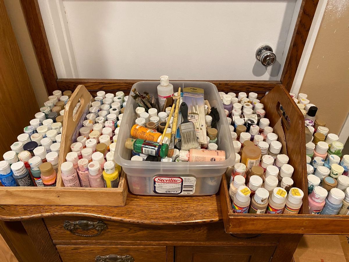 Huge Lot of Craft Paints with Brushes & Wood Carry Trays