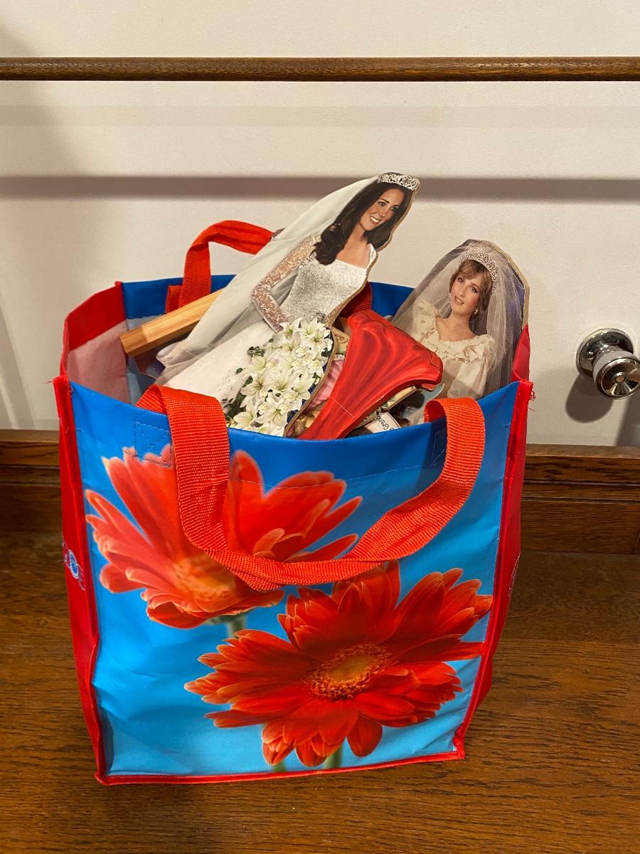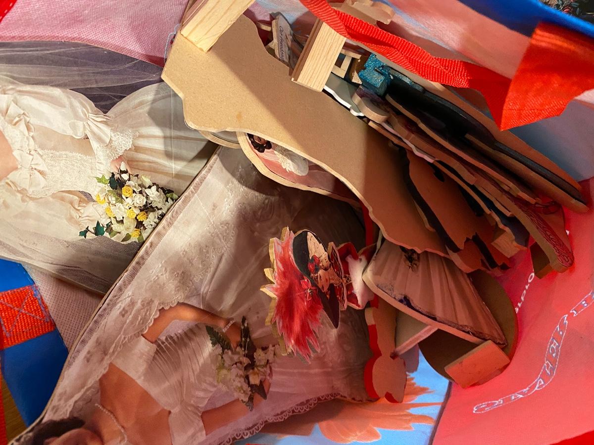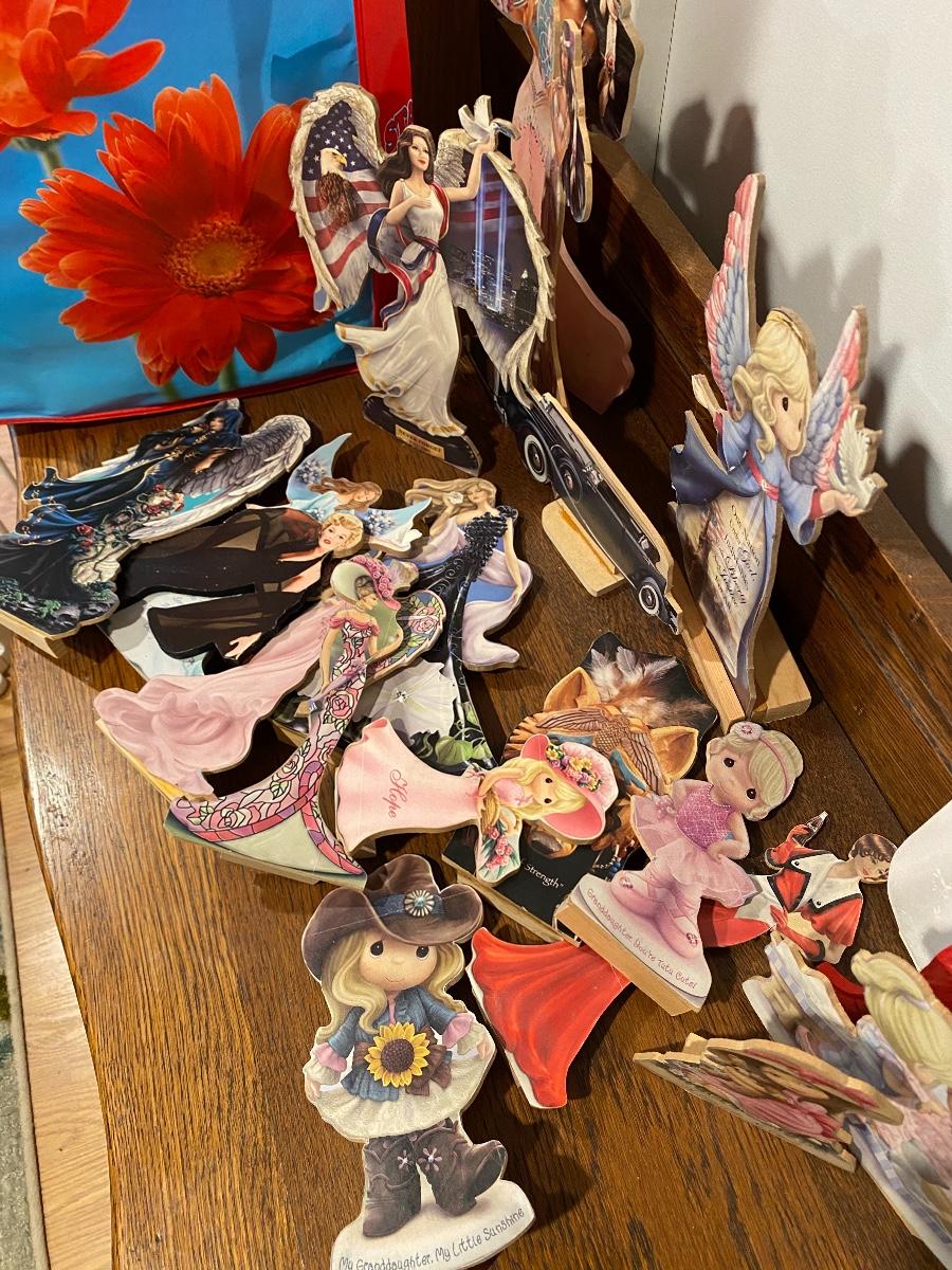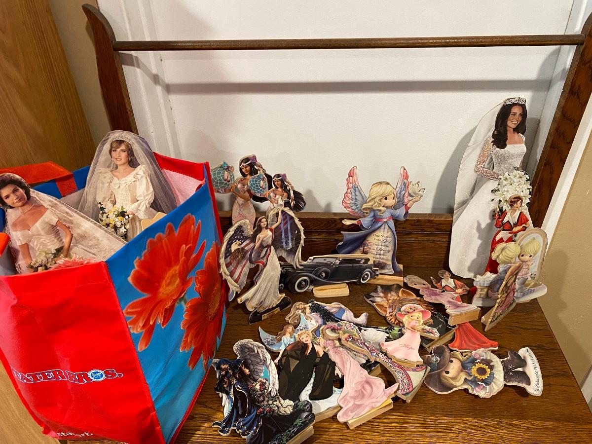 Bag full of hand made wood cut outs. Decoupaged image cut outs on wood. Mix of images like angels, Precious Moments, & Princesses. Reusable bag is full.
