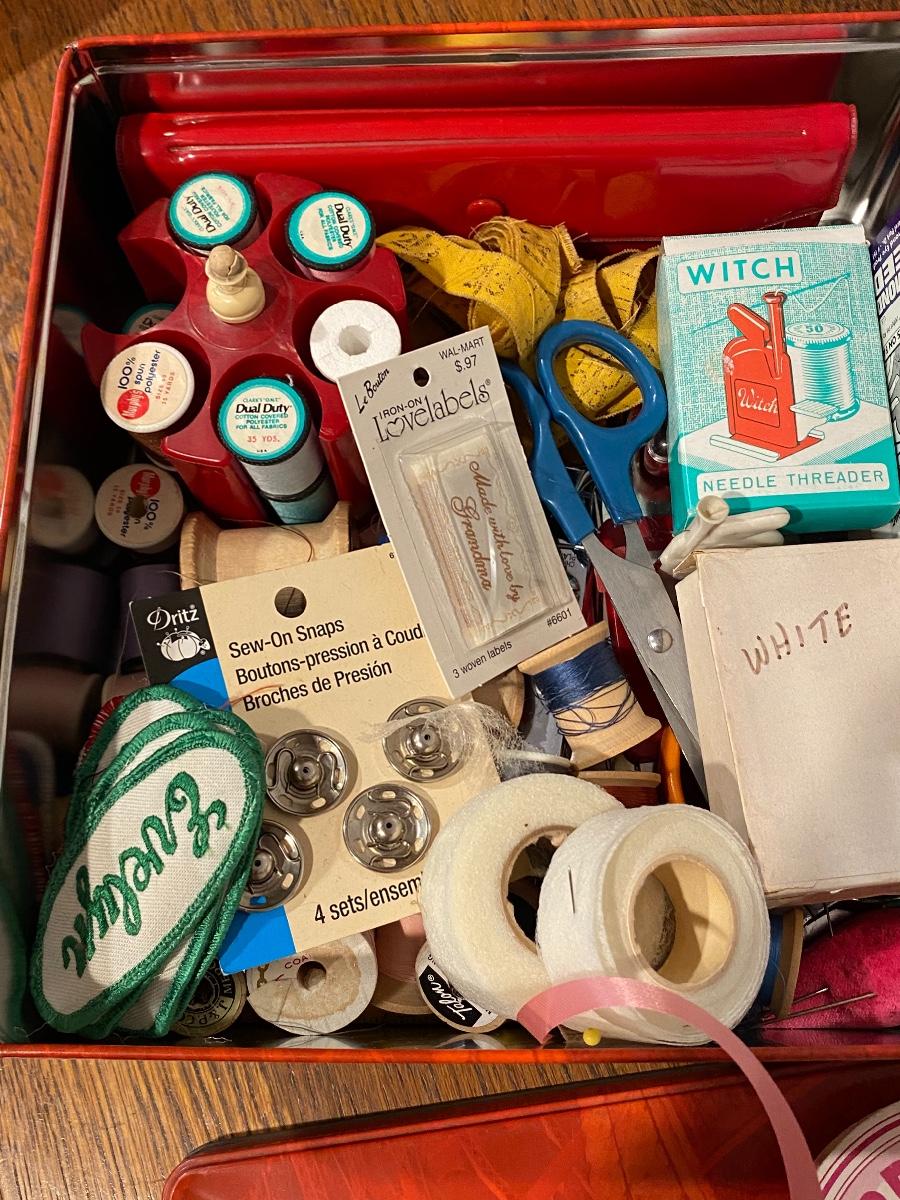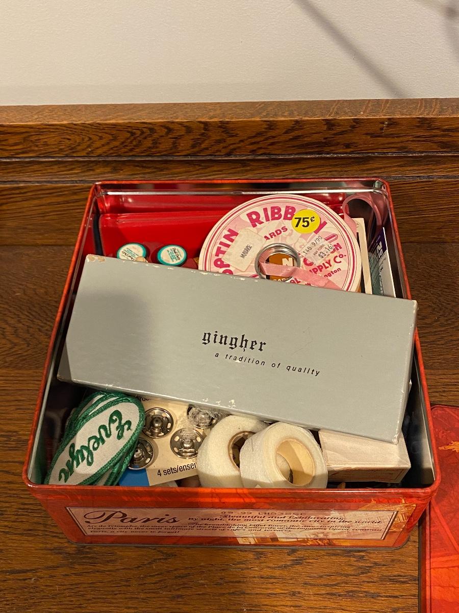 Tin of Sewing Notions, Accessories, and Gingher Scissors