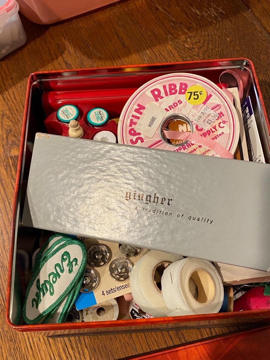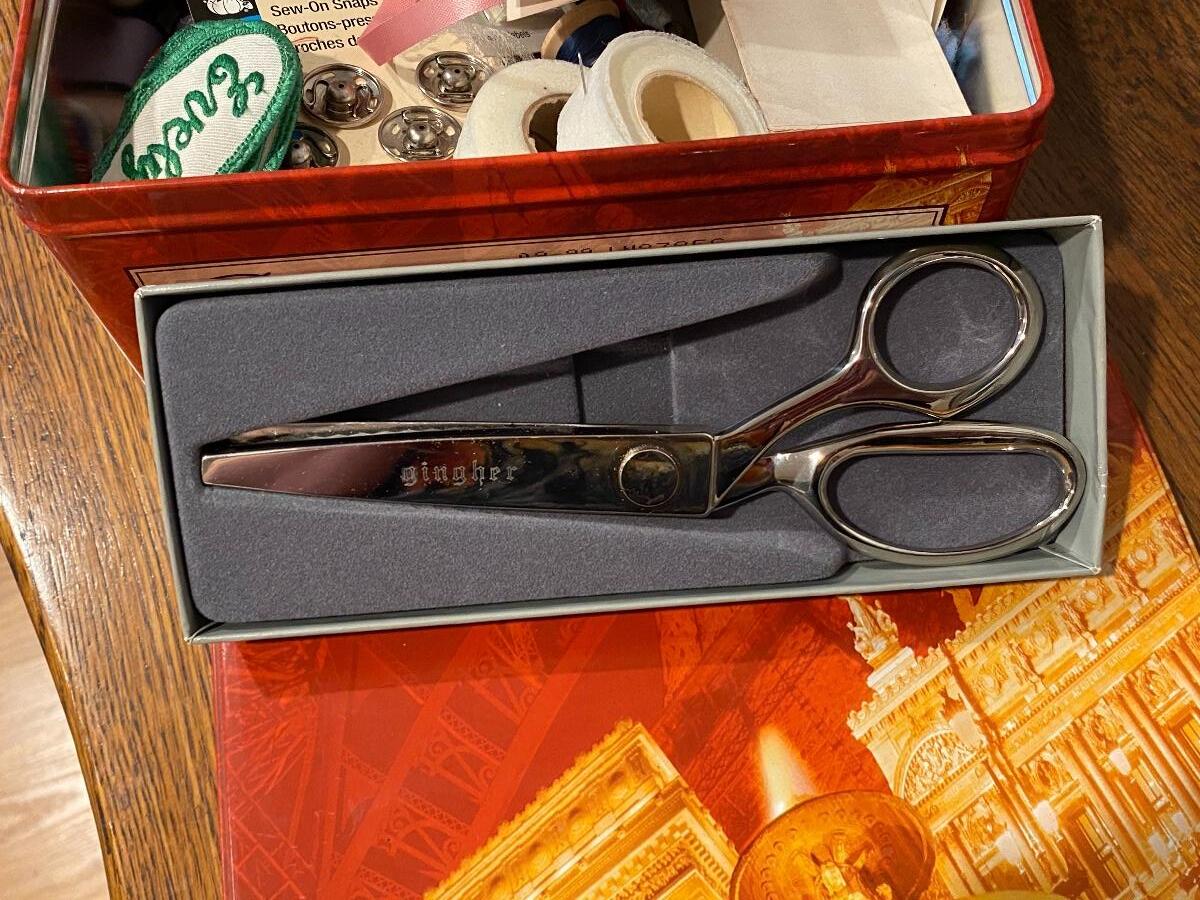 Tin with a mix of sewing notions and accessories. Included is a nice pair of Gingher pinking shears in original box,