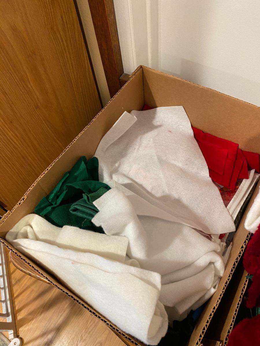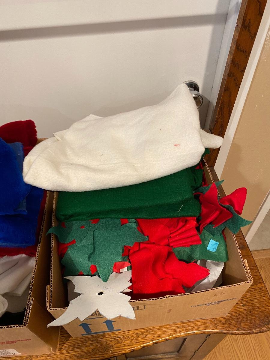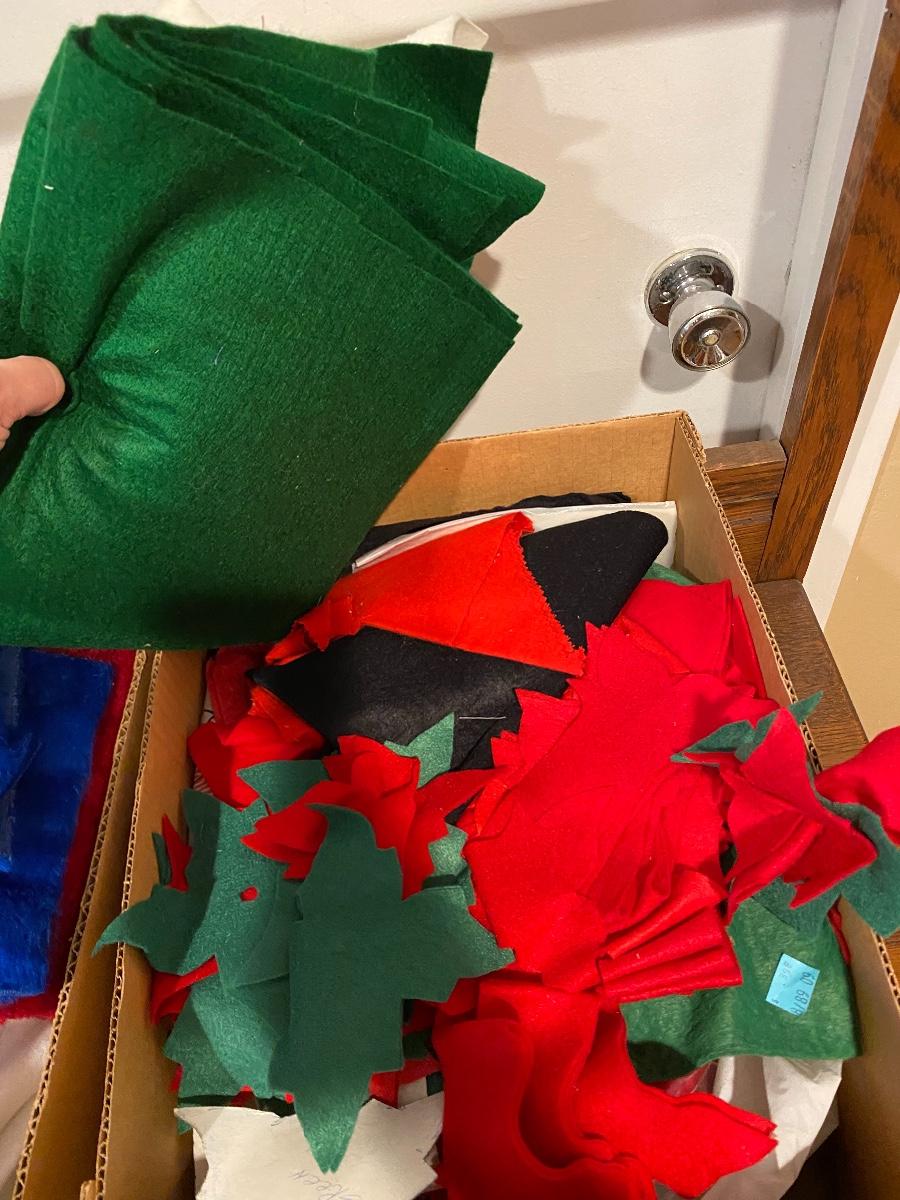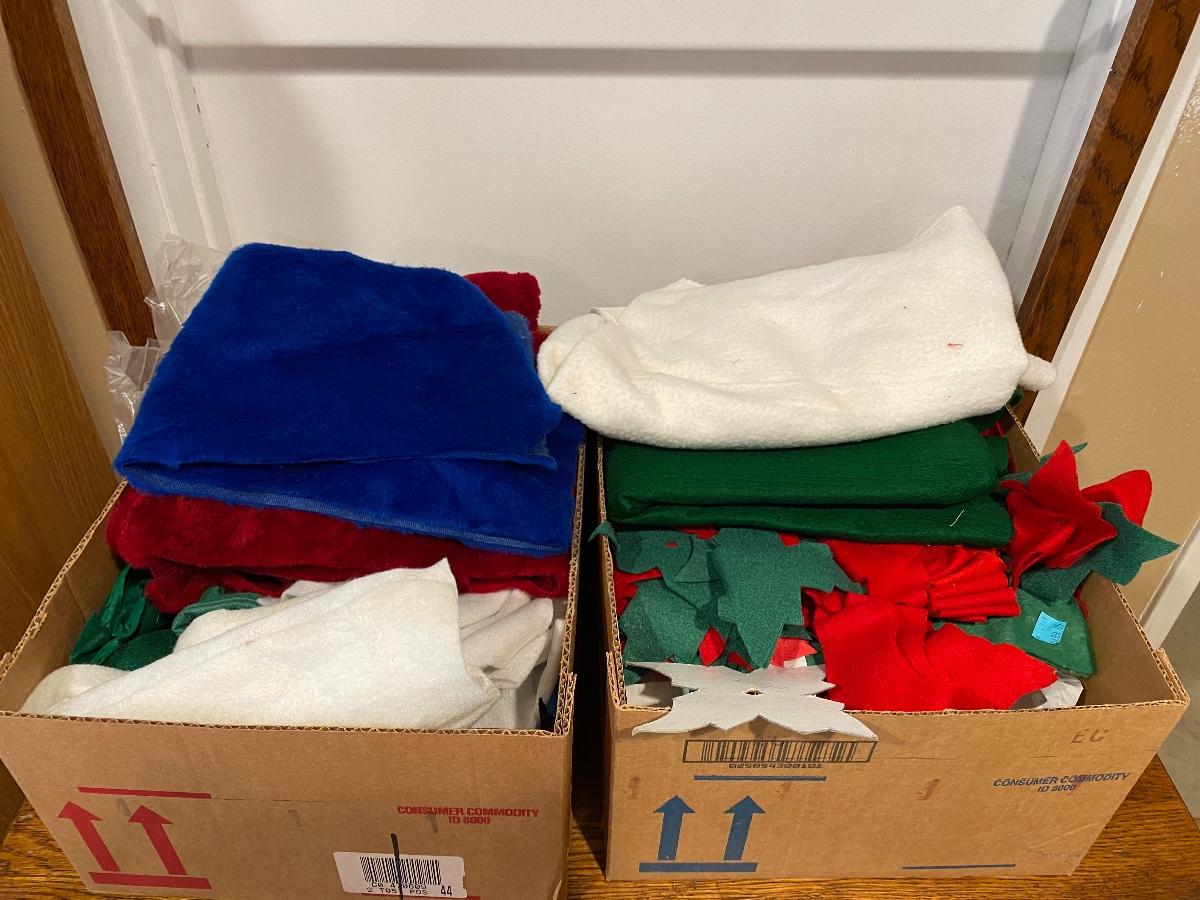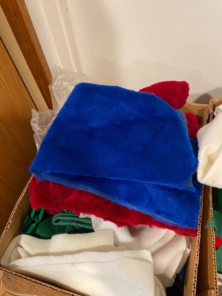 Two boxes full of felt and faux fur. Faux fur in white, burgundy, and royal blue. Felt is in red, green, white, and black. Some of the felt is cut for an unfinished project but there is still some large pieces.