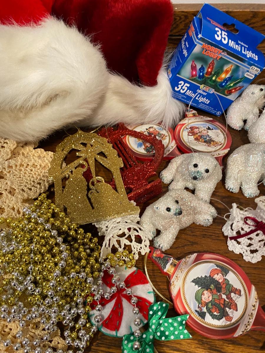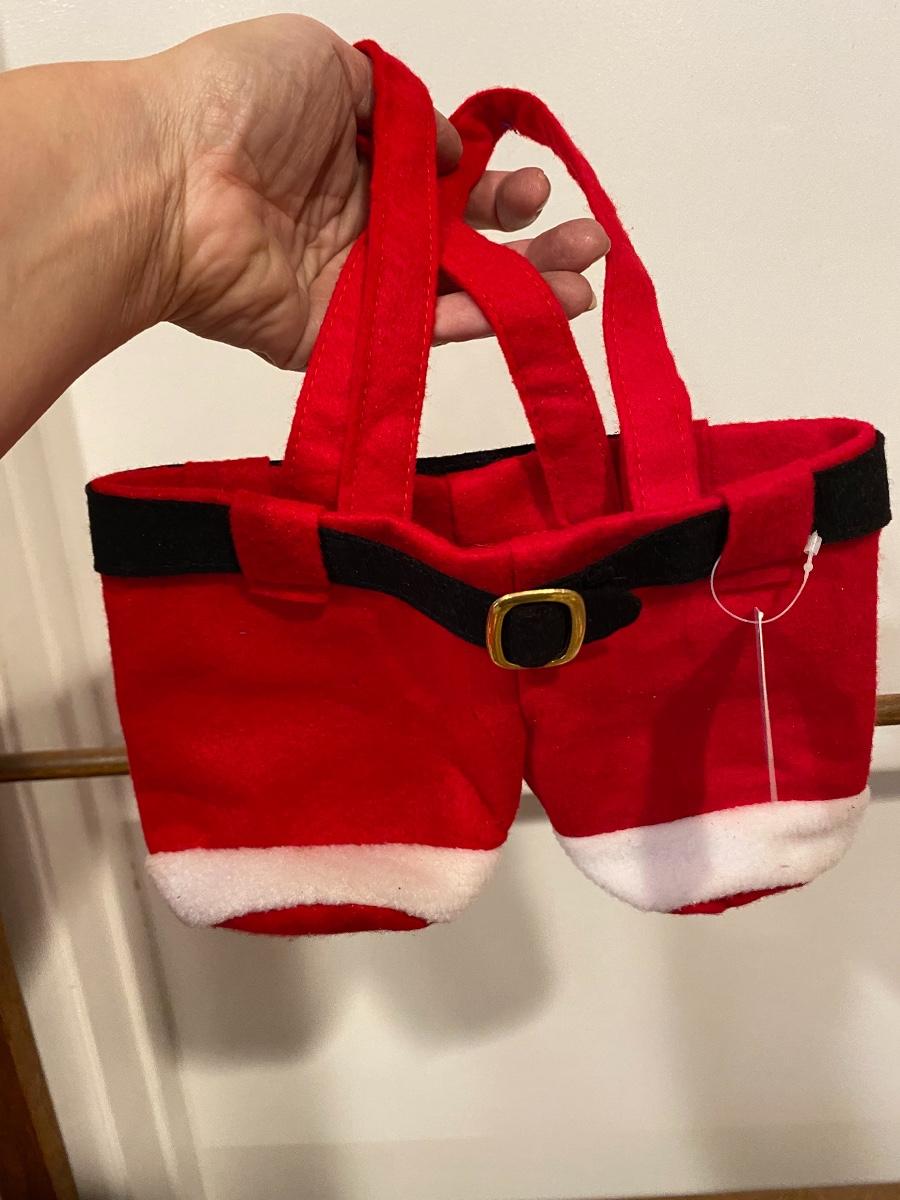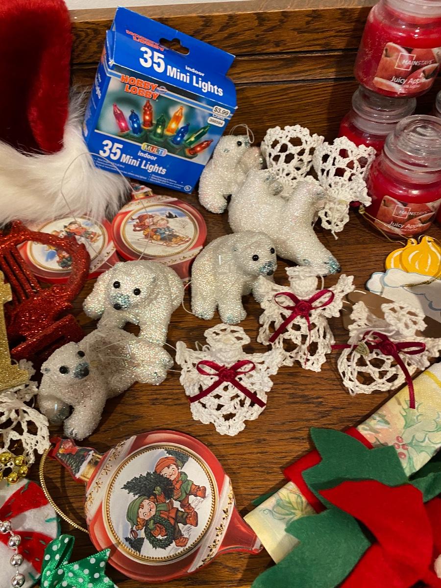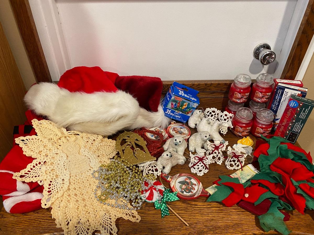 Mixed lot of Christmas holiday decor and ornaments. Candles are unused. The Santa pants are gift bags. Homemade felt holly & poinsettia napkin holders.