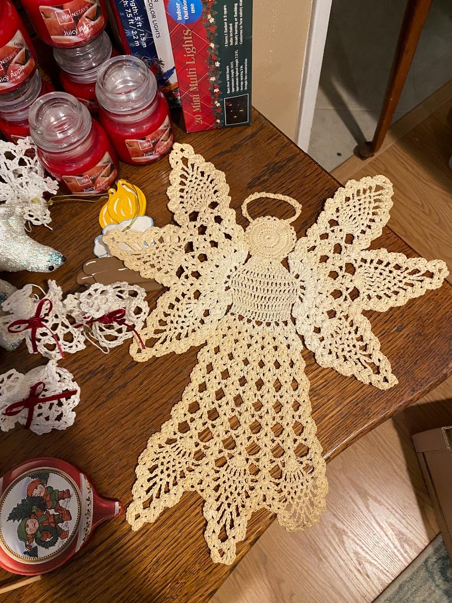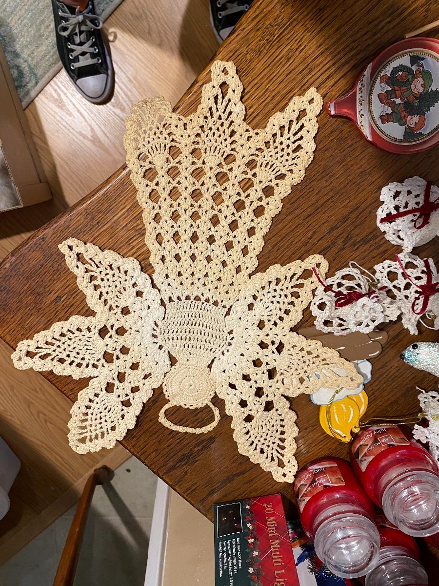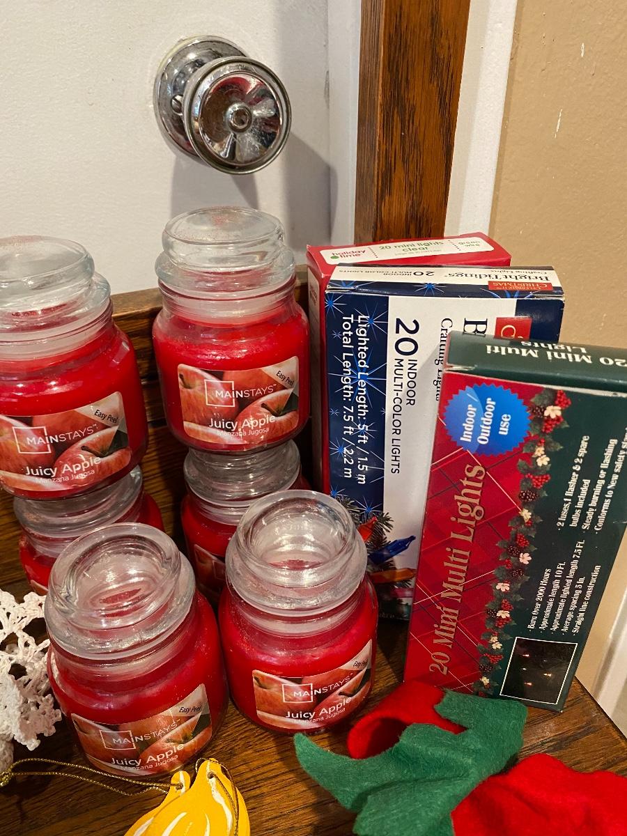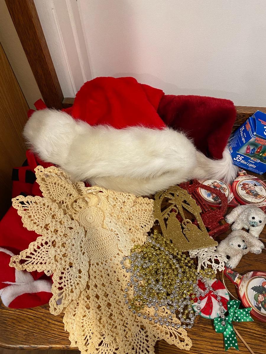 Mixed lot of Christmas holiday decor and ornaments. Candles are unused. The Santa pants are gift bags. Homemade felt holly & poinsettia napkin holders.