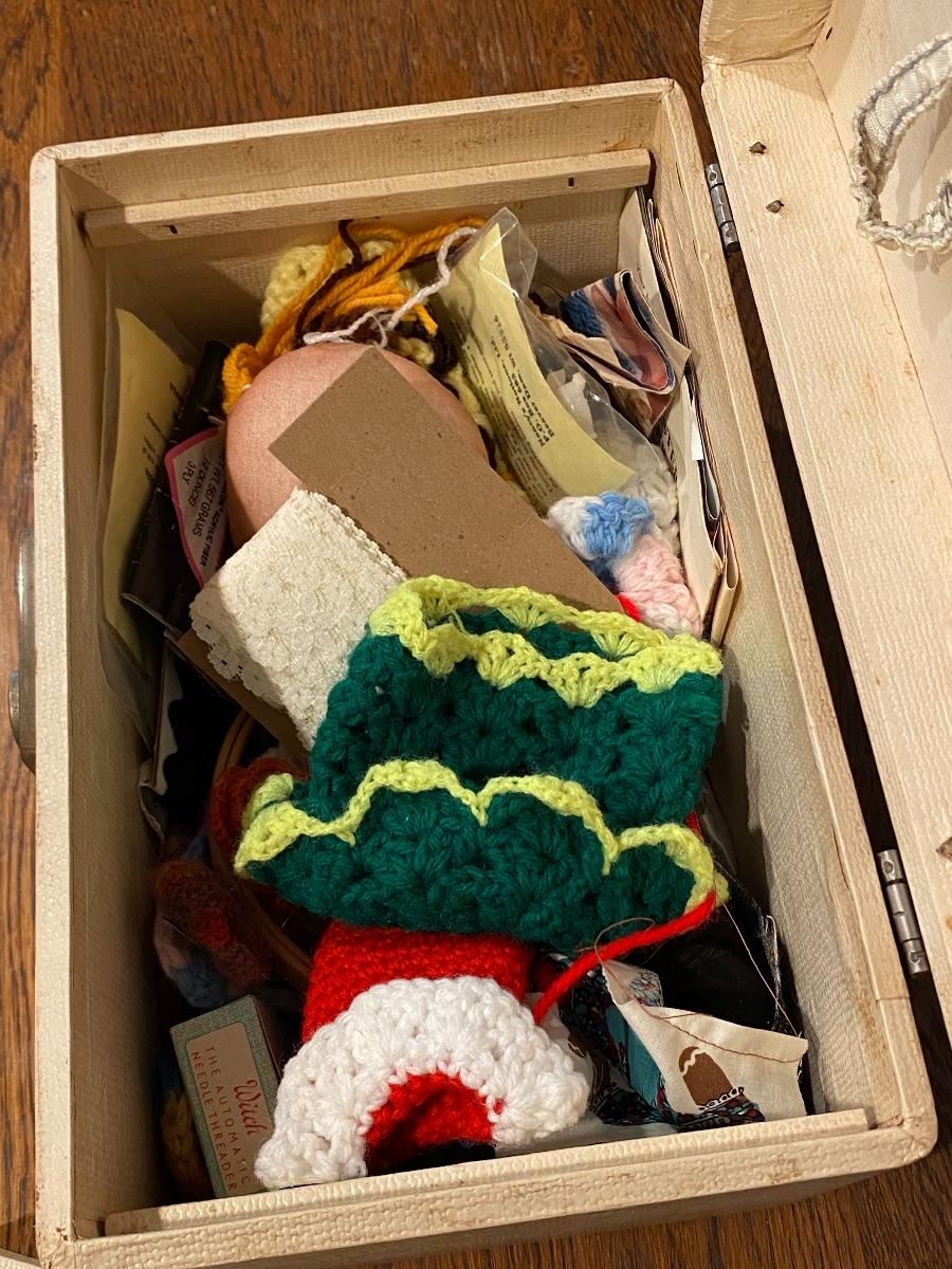 Vintage Off White Train Case Sewing Box with Notions & Accessories