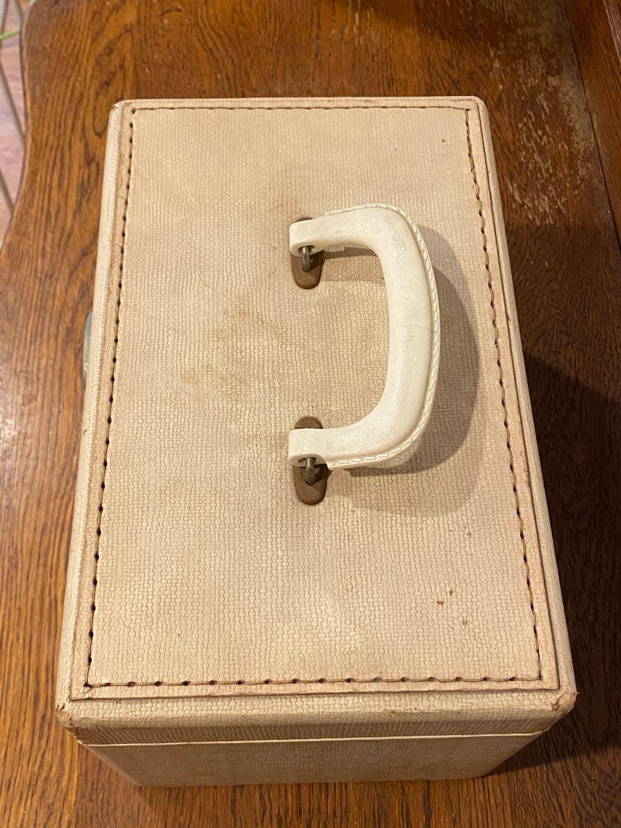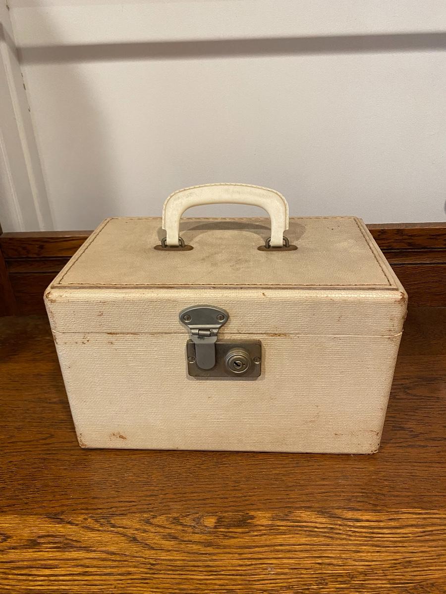 Small vintage off white train case style sewing box. Has lift out tray inside. Mixed notions and accessories included. Box is a bit dirty and worn from age but latch opens easy, hinges and handle in good condition.