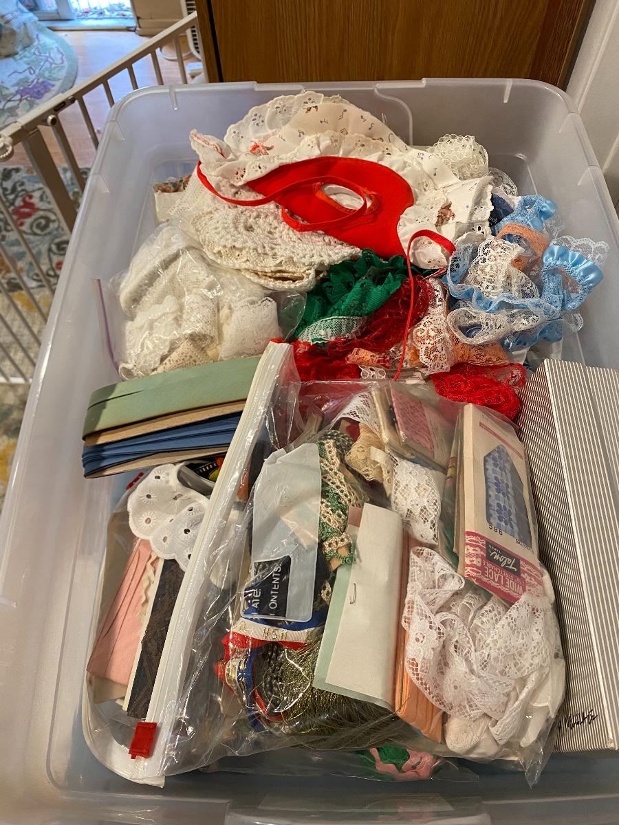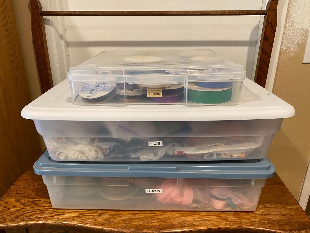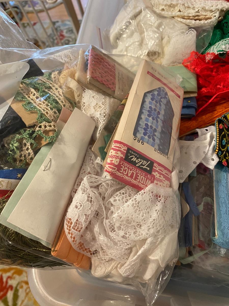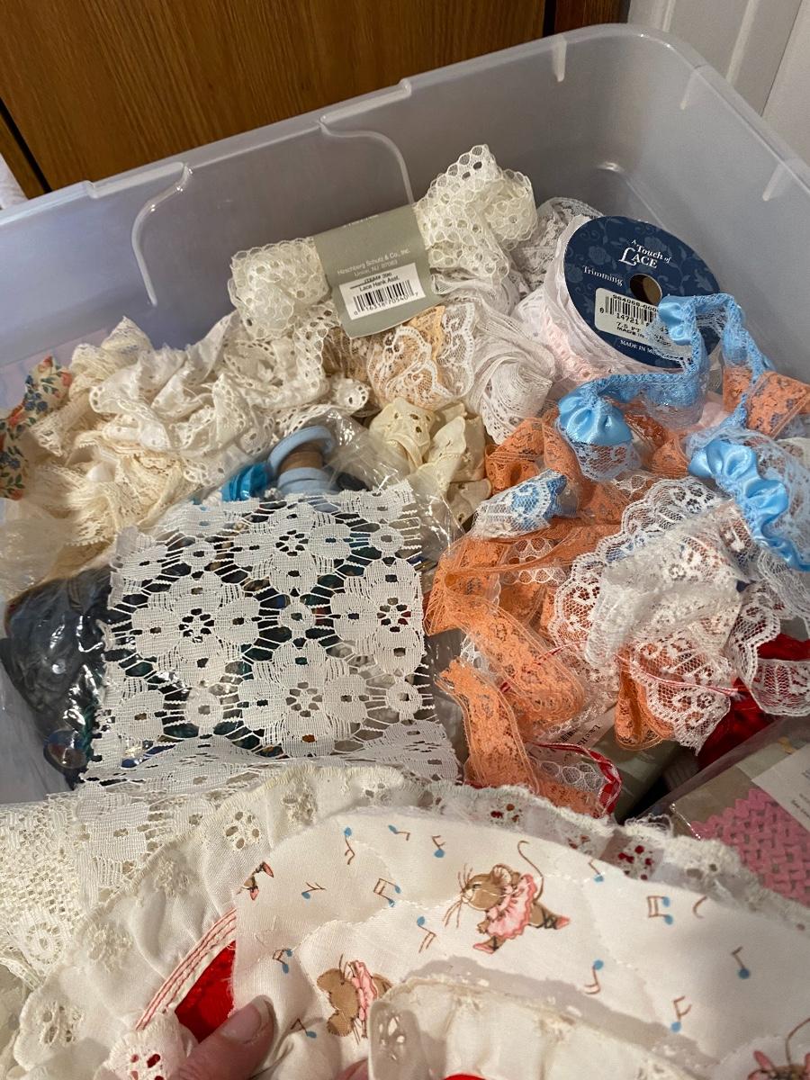 Three bins filled with a variety of lace and ribbon spools. Different colors and styles. Bins included.