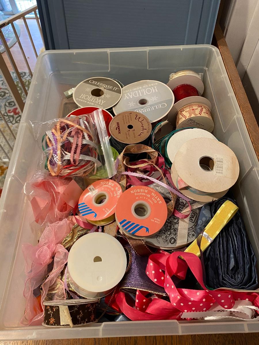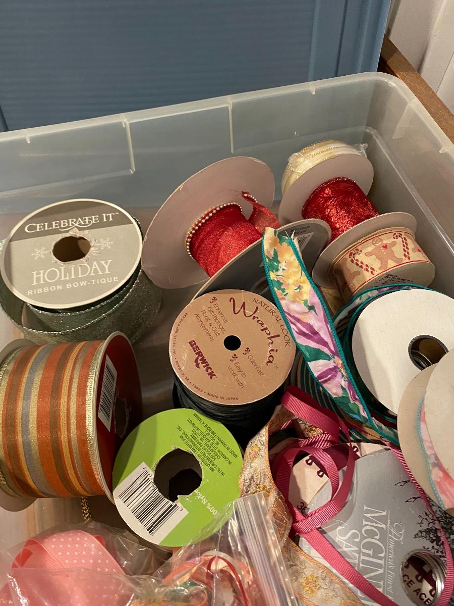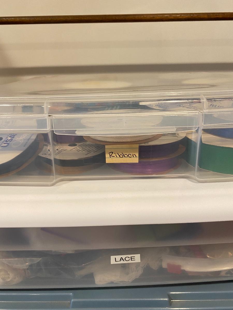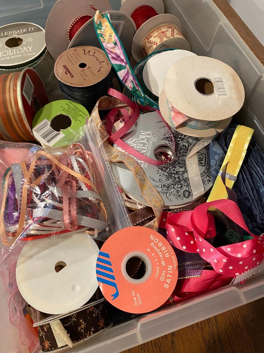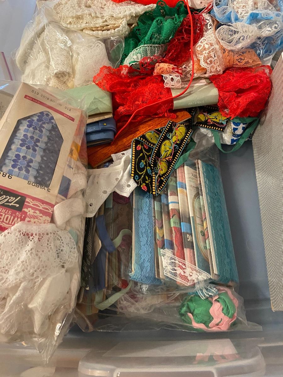 Three bins filled with a variety of lace and ribbon spools. Different colors and styles. Bins included.