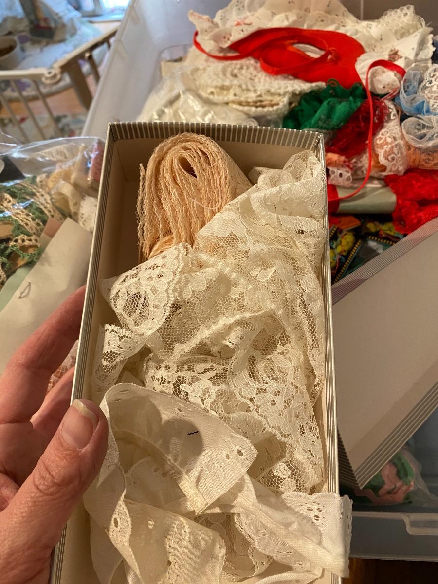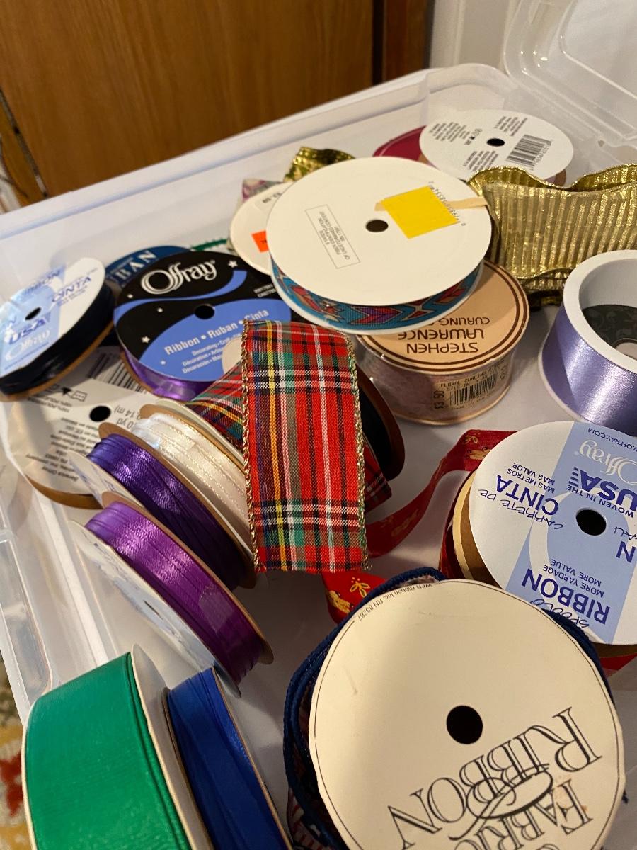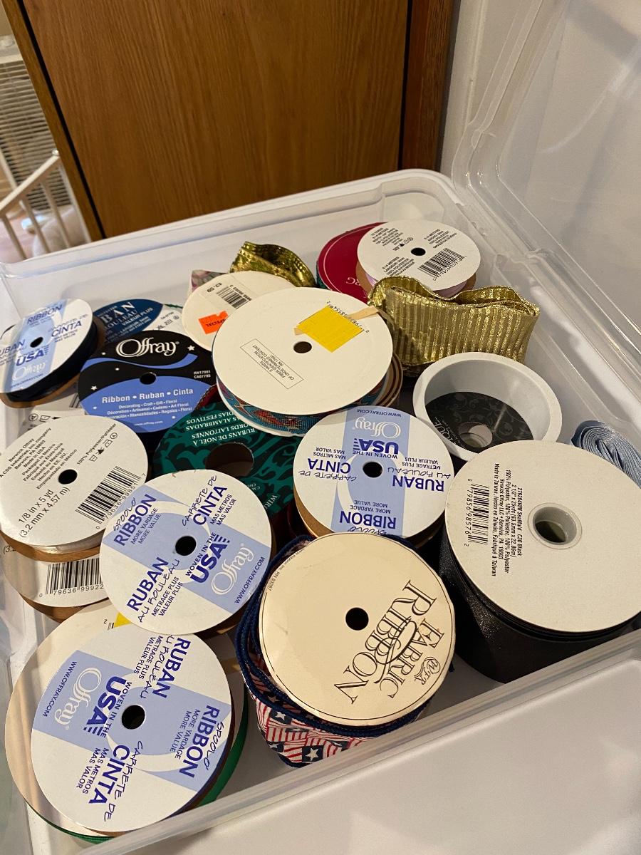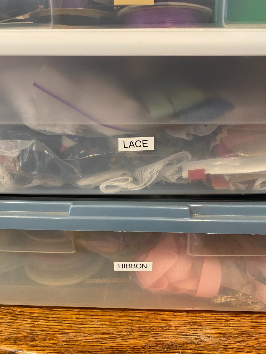 Three bins filled with a variety of lace and ribbon spools. Different colors and styles. Bins included.