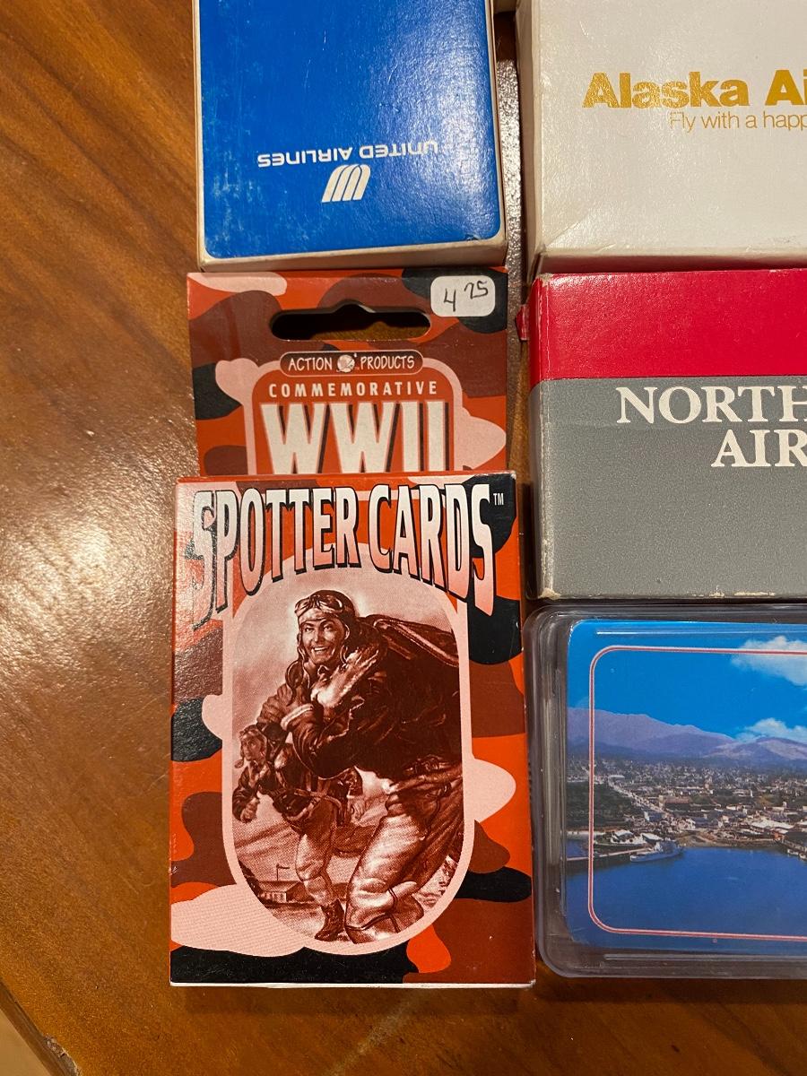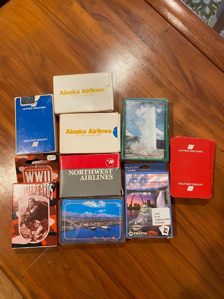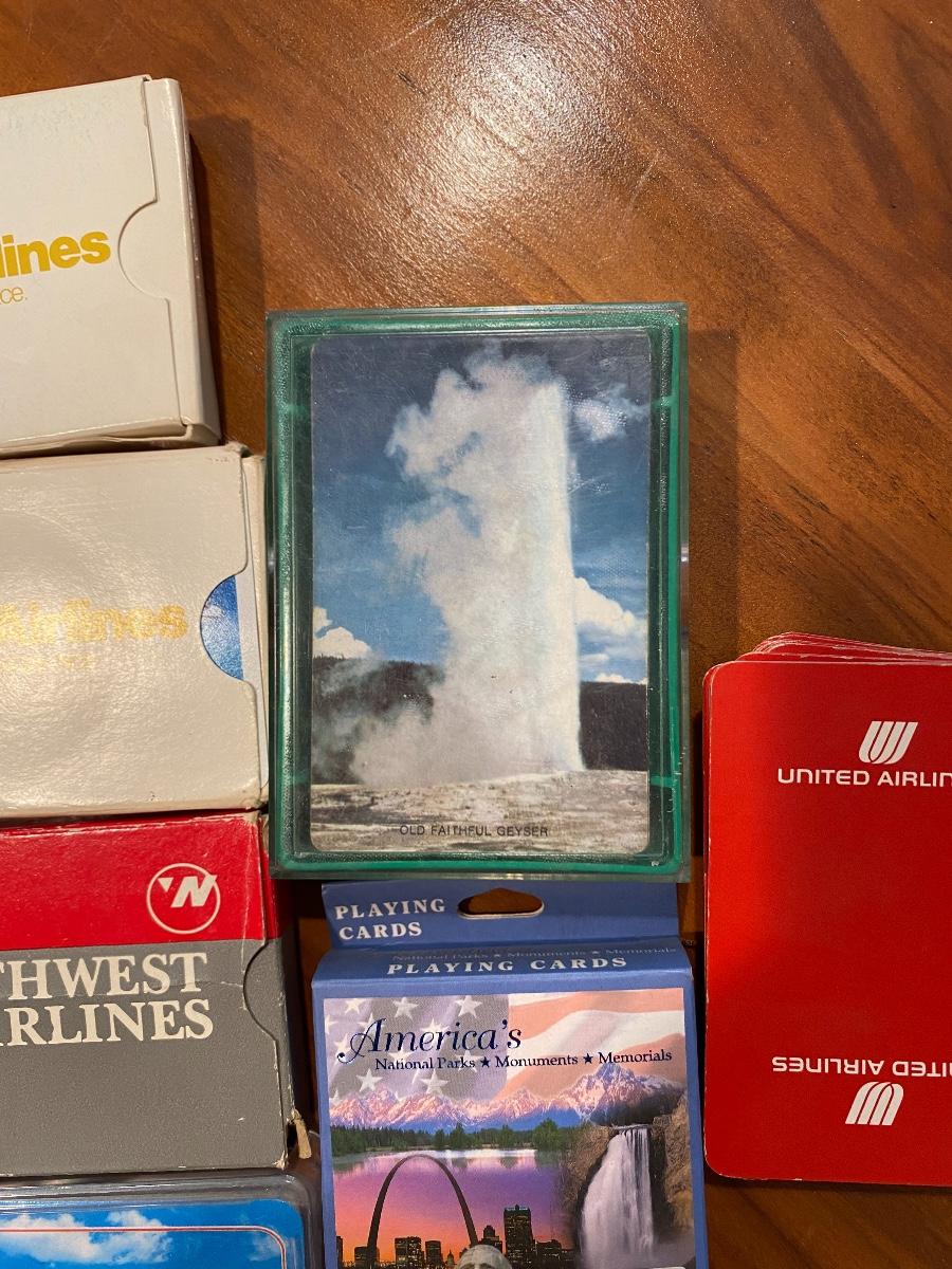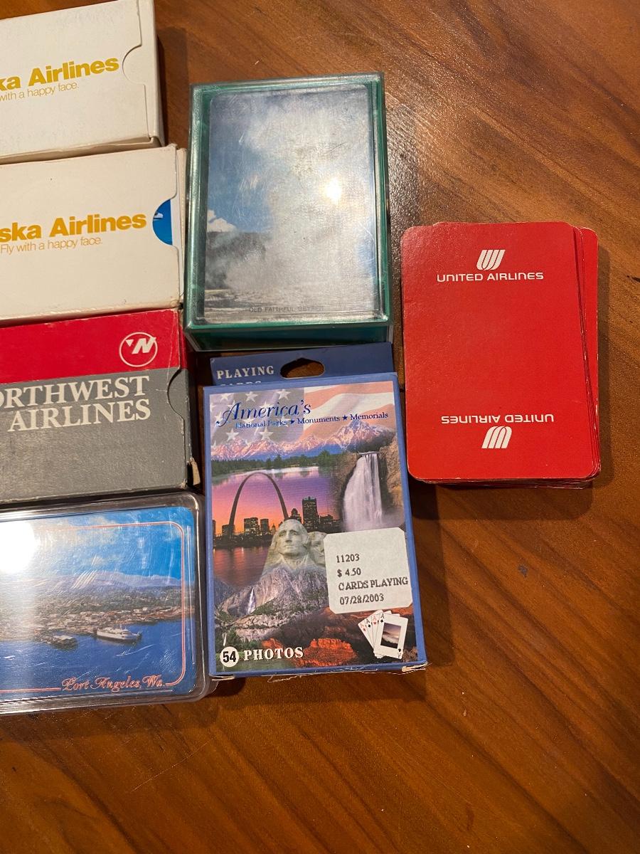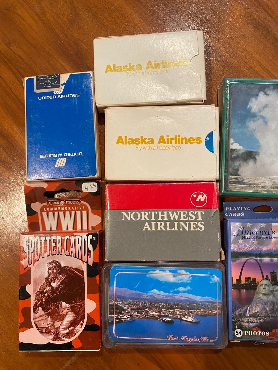 Lot of novelty souvenir and airline playing cards. Some sets are open.