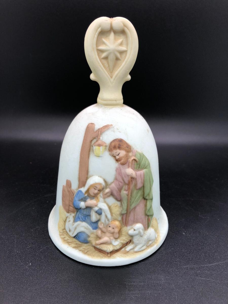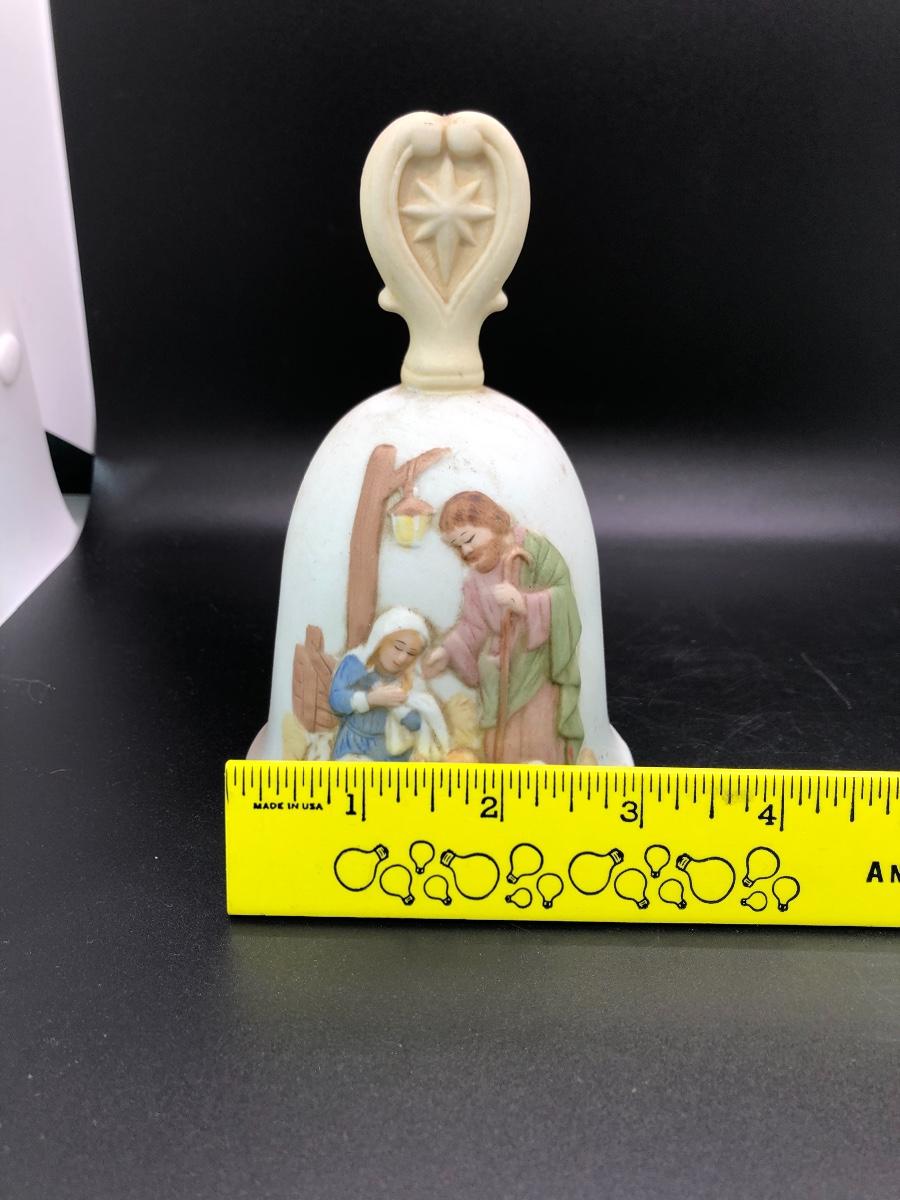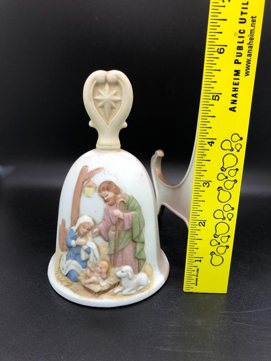 Ceramic Christmas holiday bell features a Nativity scene on one side. Under 6" size.