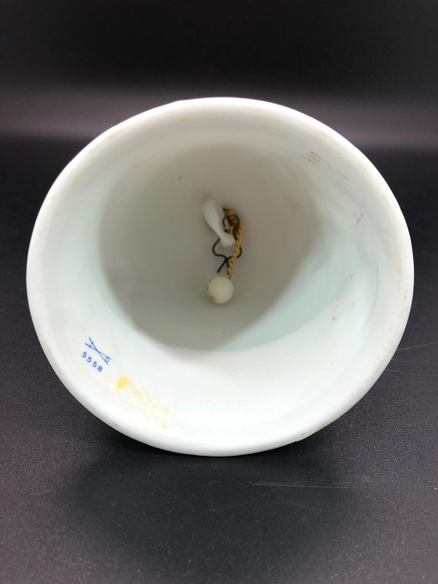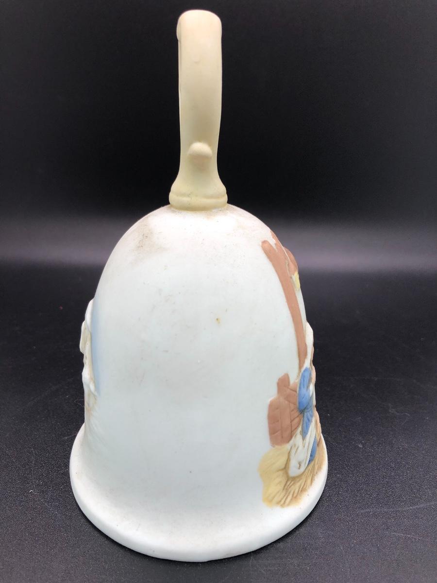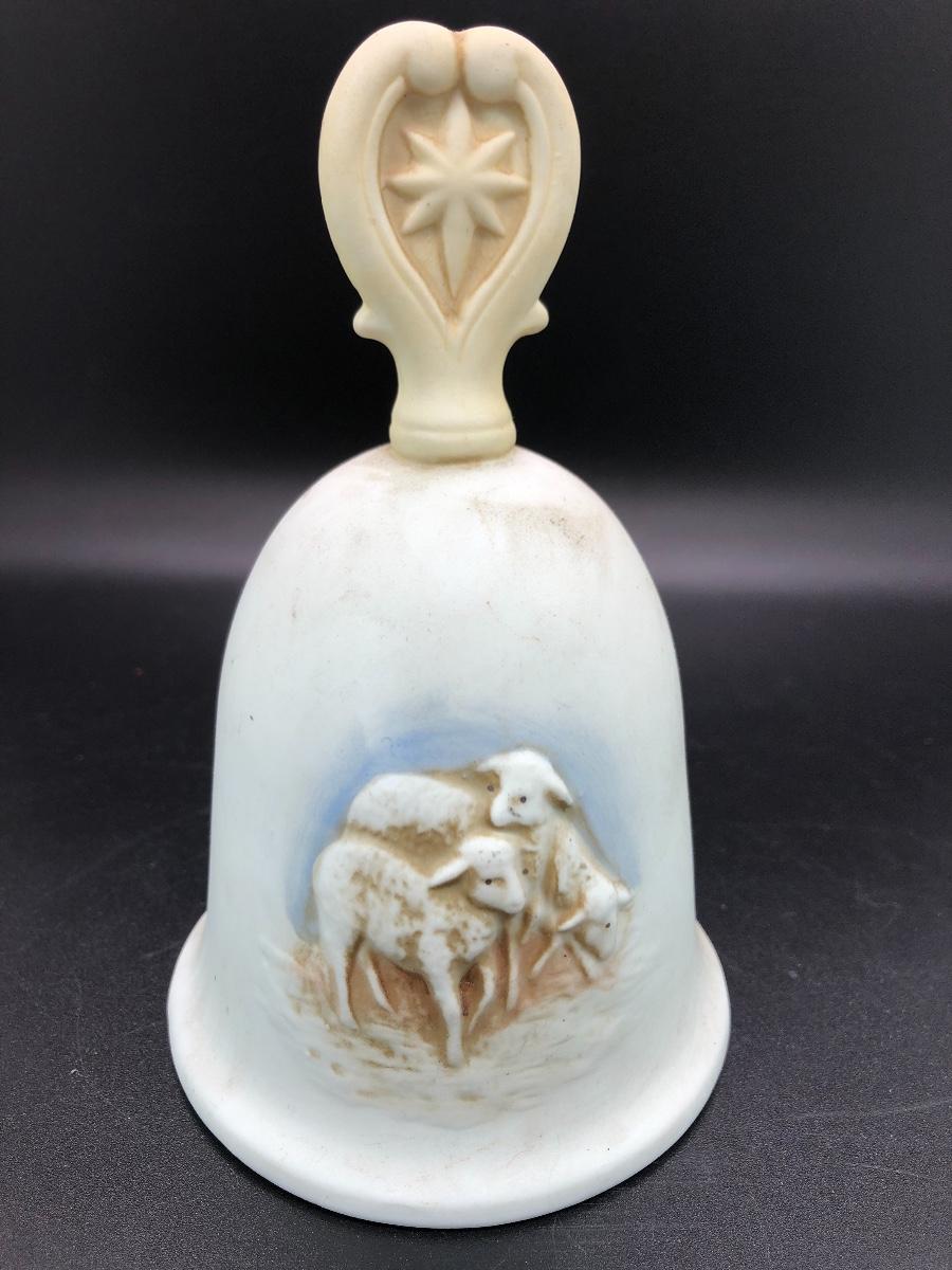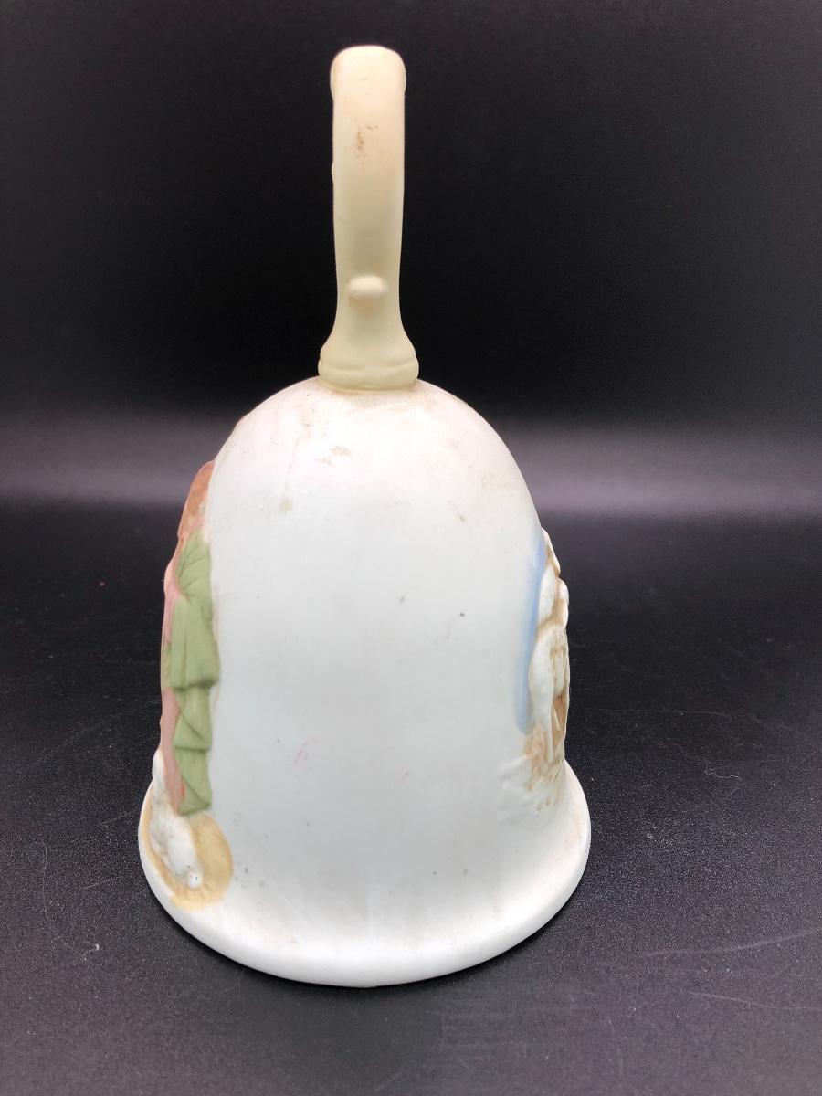 Ceramic Christmas holiday bell features a Nativity scene on one side. Under 6" size.
