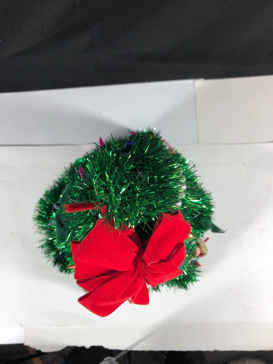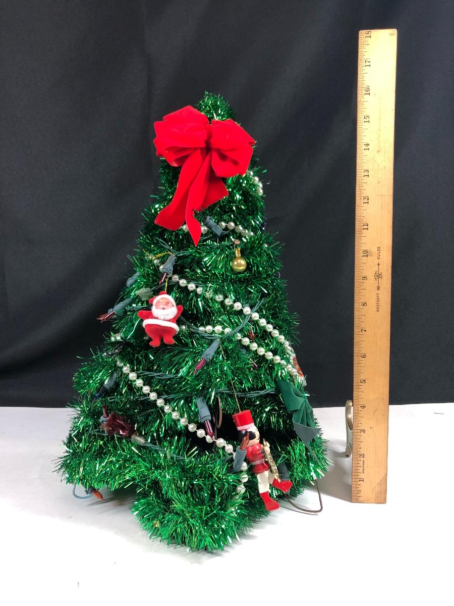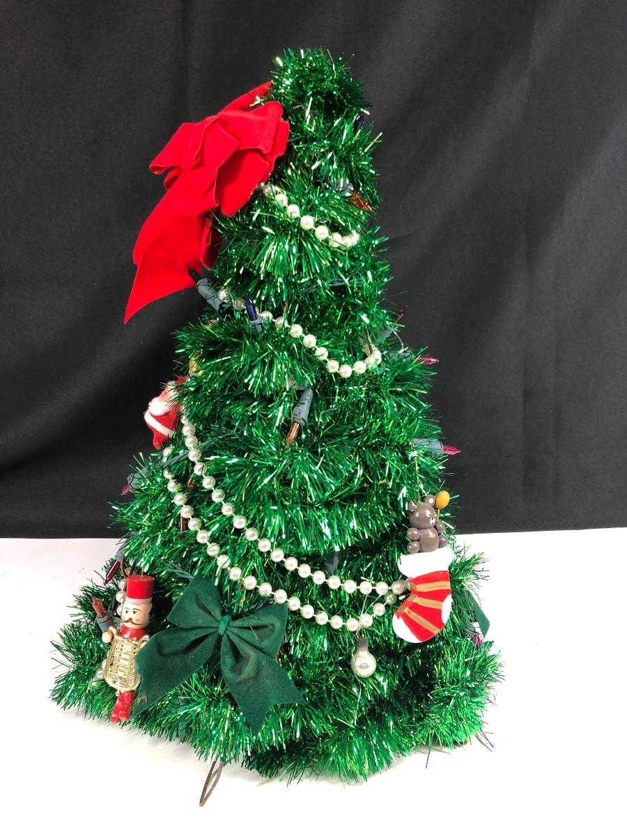 Fully decorated and lighted table top Christmas Tree, bright green, approx. 12” tall.
