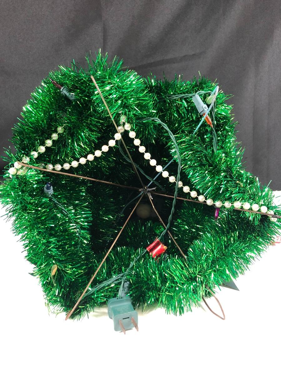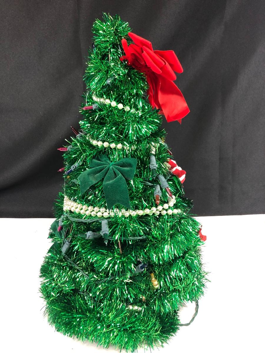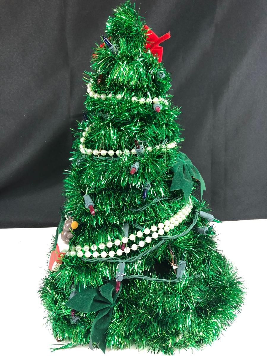 Fully decorated and lighted table top Christmas Tree, bright green, approx. 12” tall.