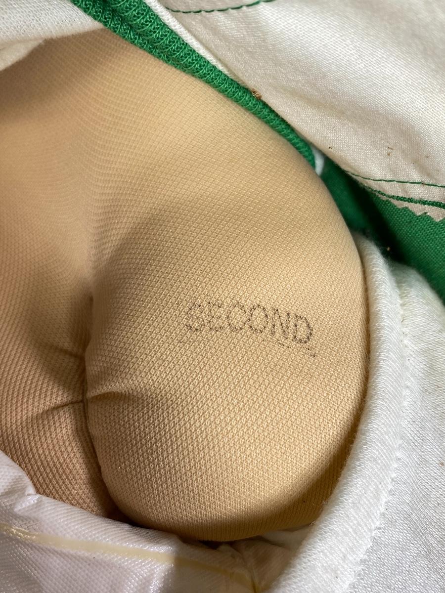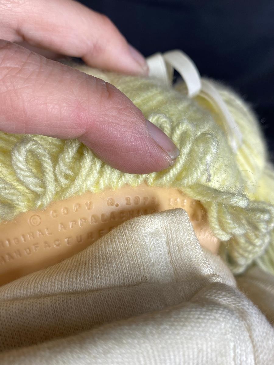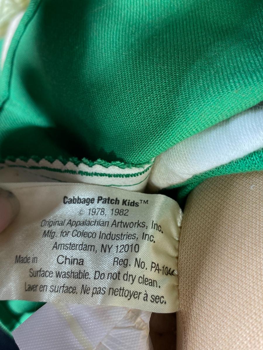Vintage original Cabbage Patch Kid doll. Blonde hair blue eye girl doll in a green and white cheerleader outfit. Outfit is discolored from age and display, not sure how clean it would come if washed. Doll looks to be in good condition.