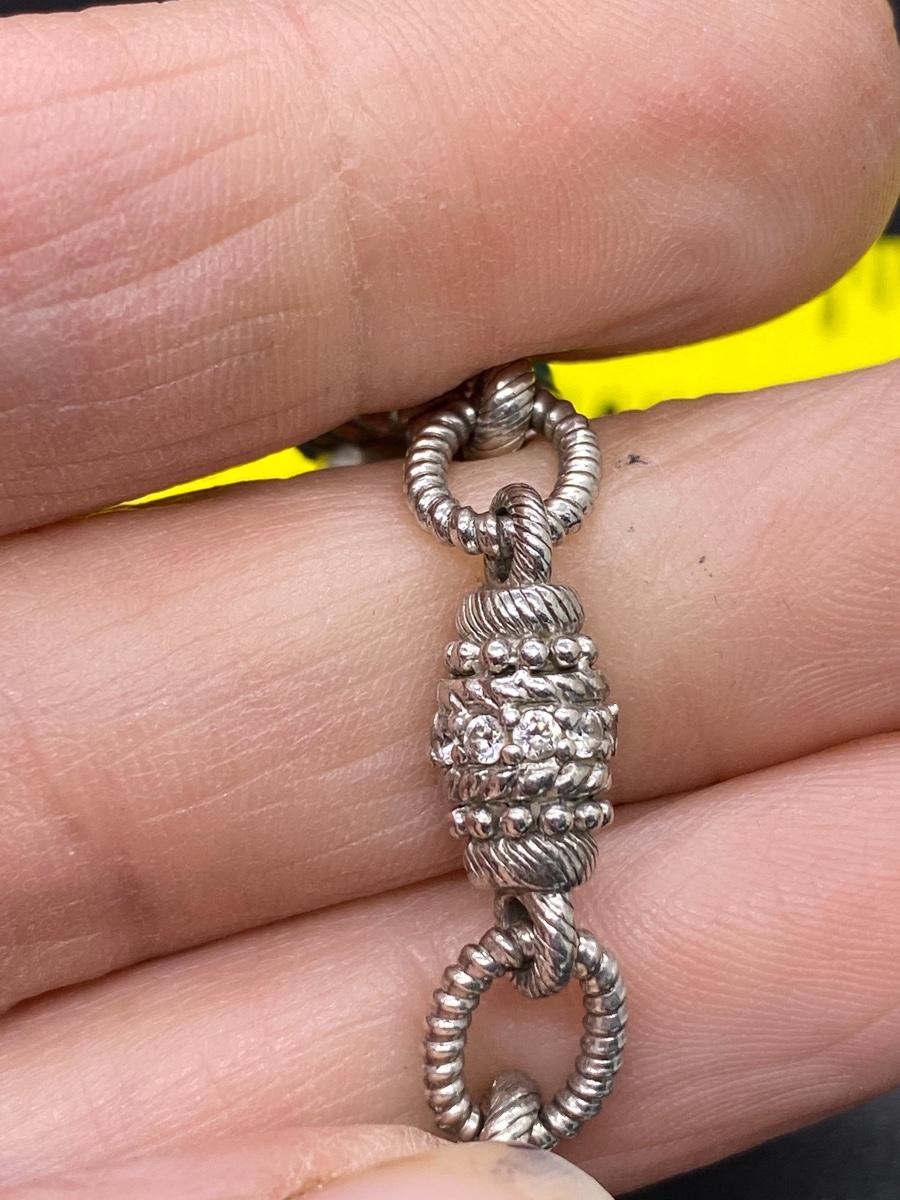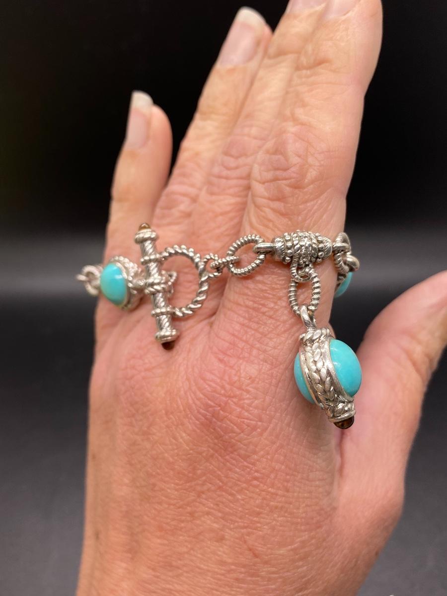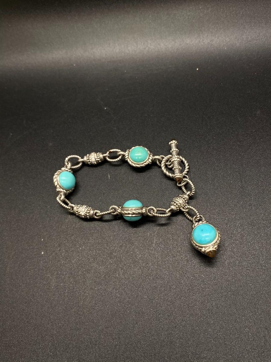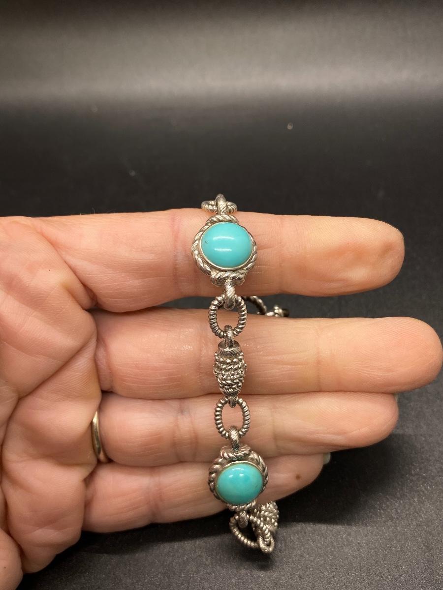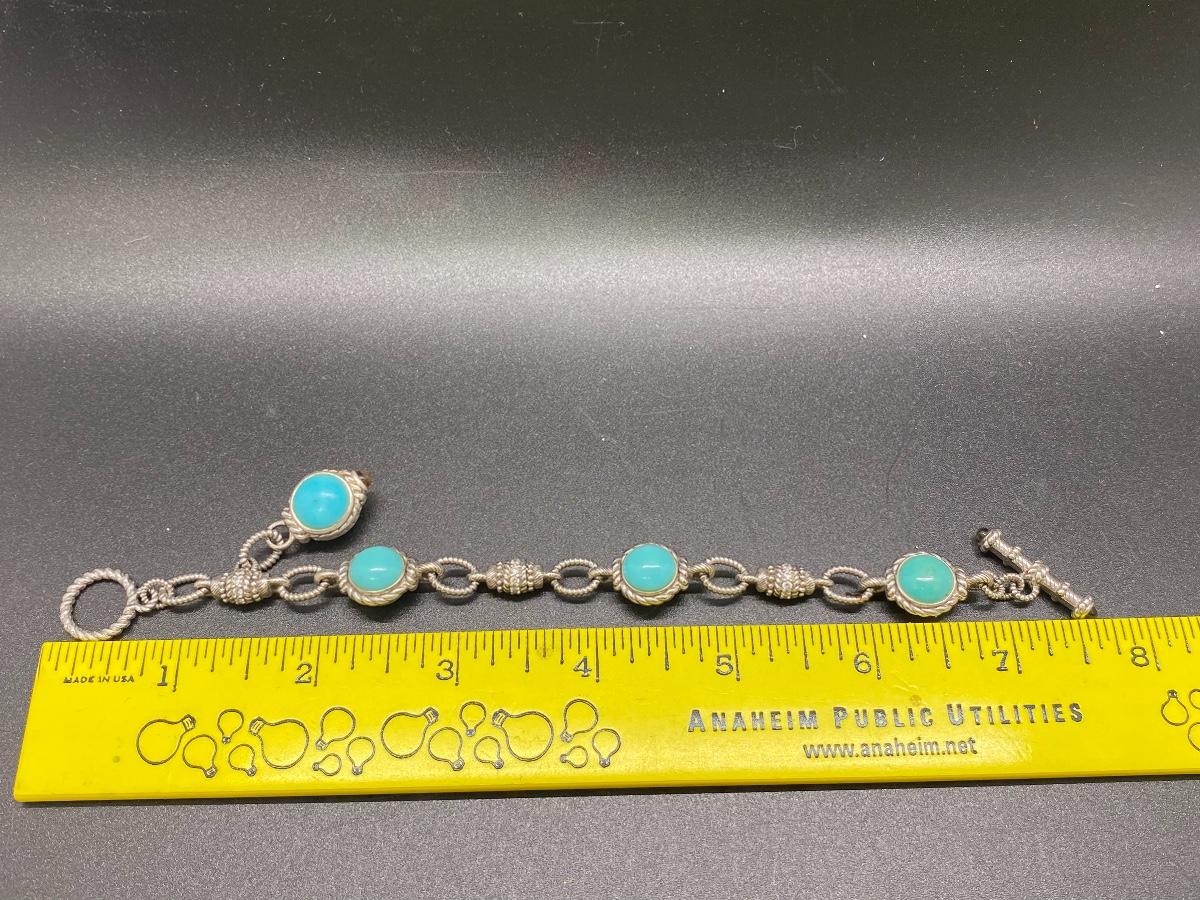 Vintage silvertone & faux turquoise cabochon link bracelet. Toggle clasp. Rhinestone covered bead accents. About 7" length. No stamps or marks.
