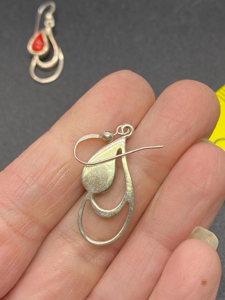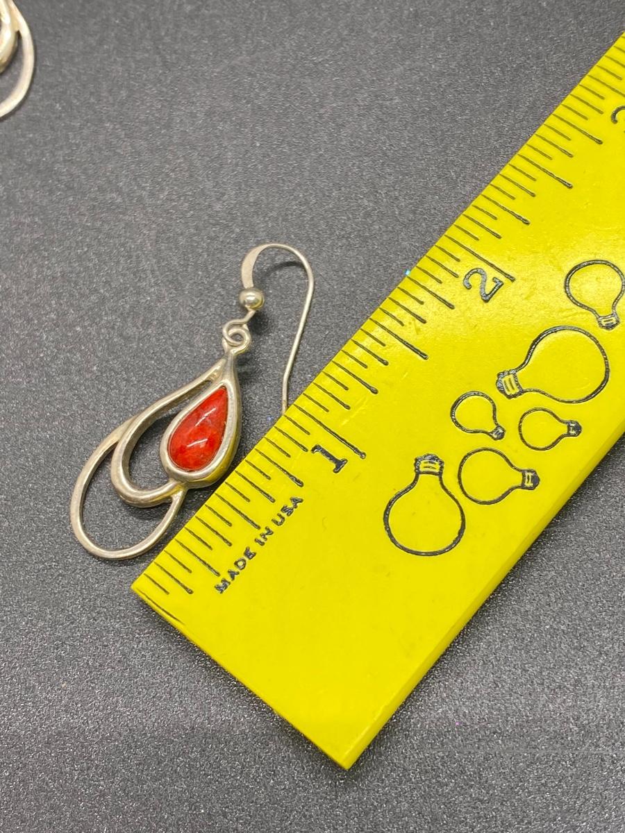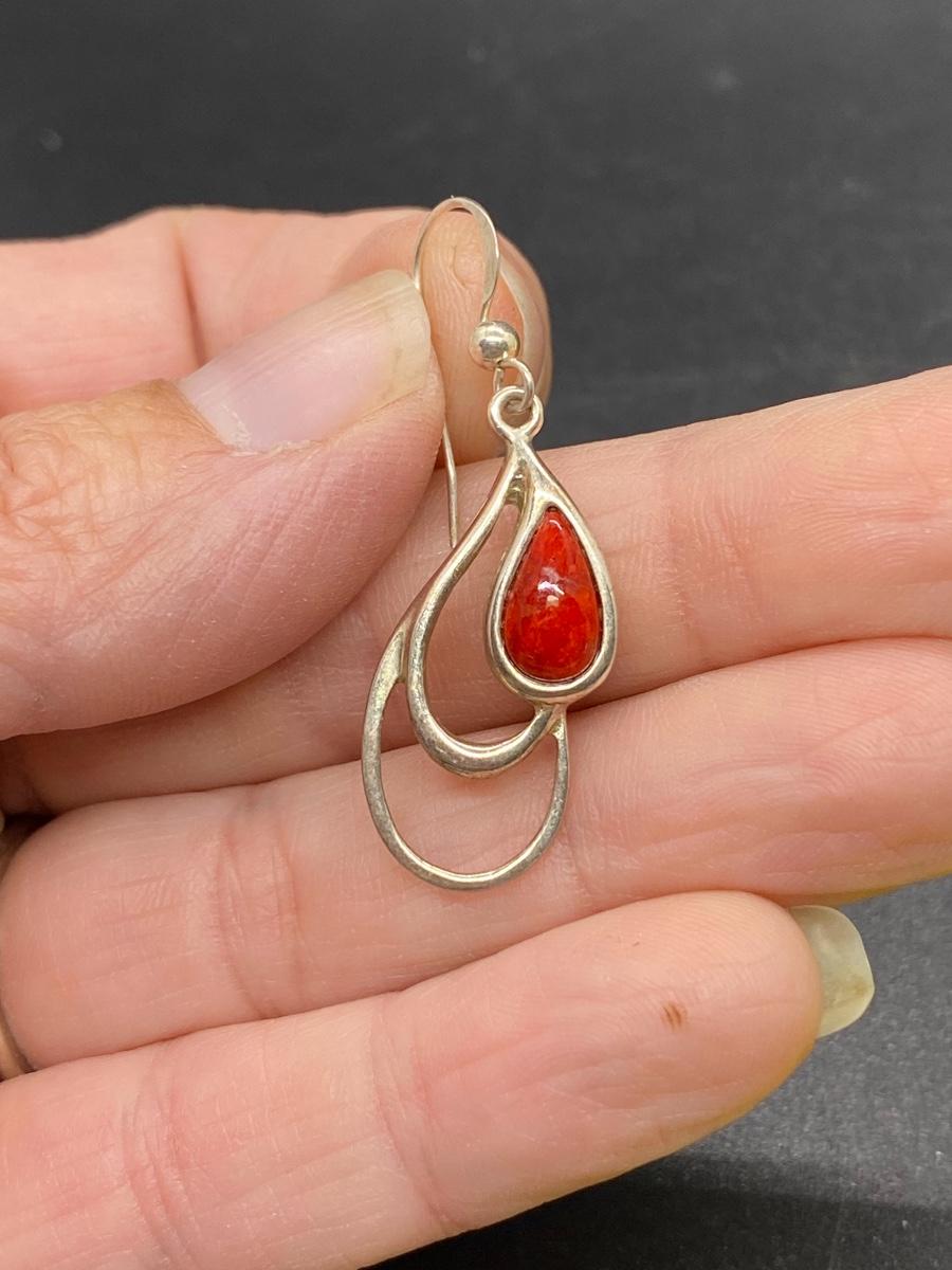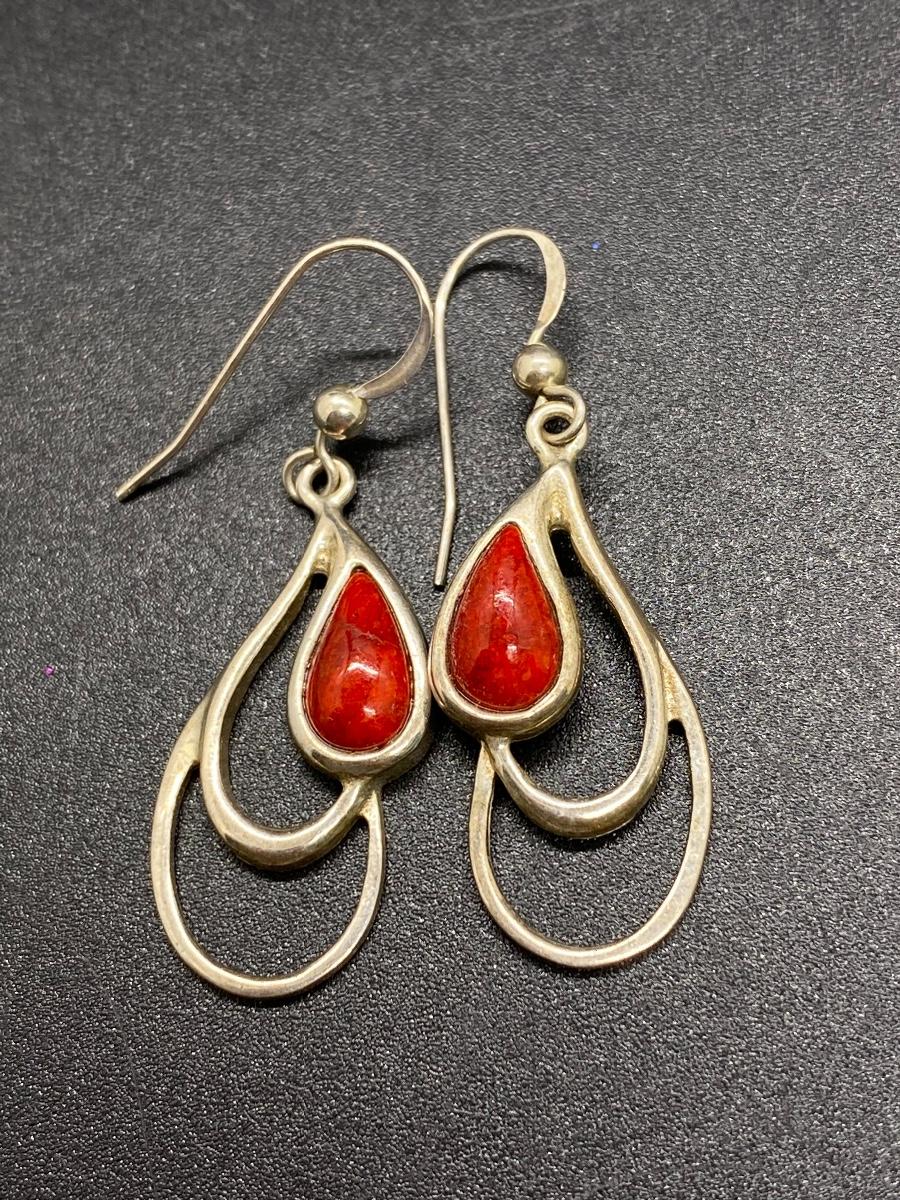 Silvertone drop dangle earrings with polished red stone accent. No markings or stamps. About 1.5" size.