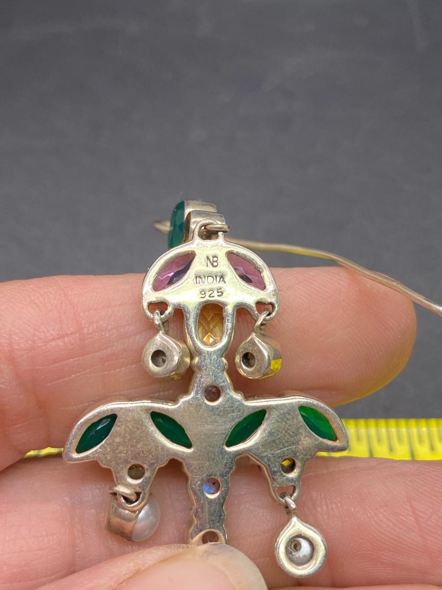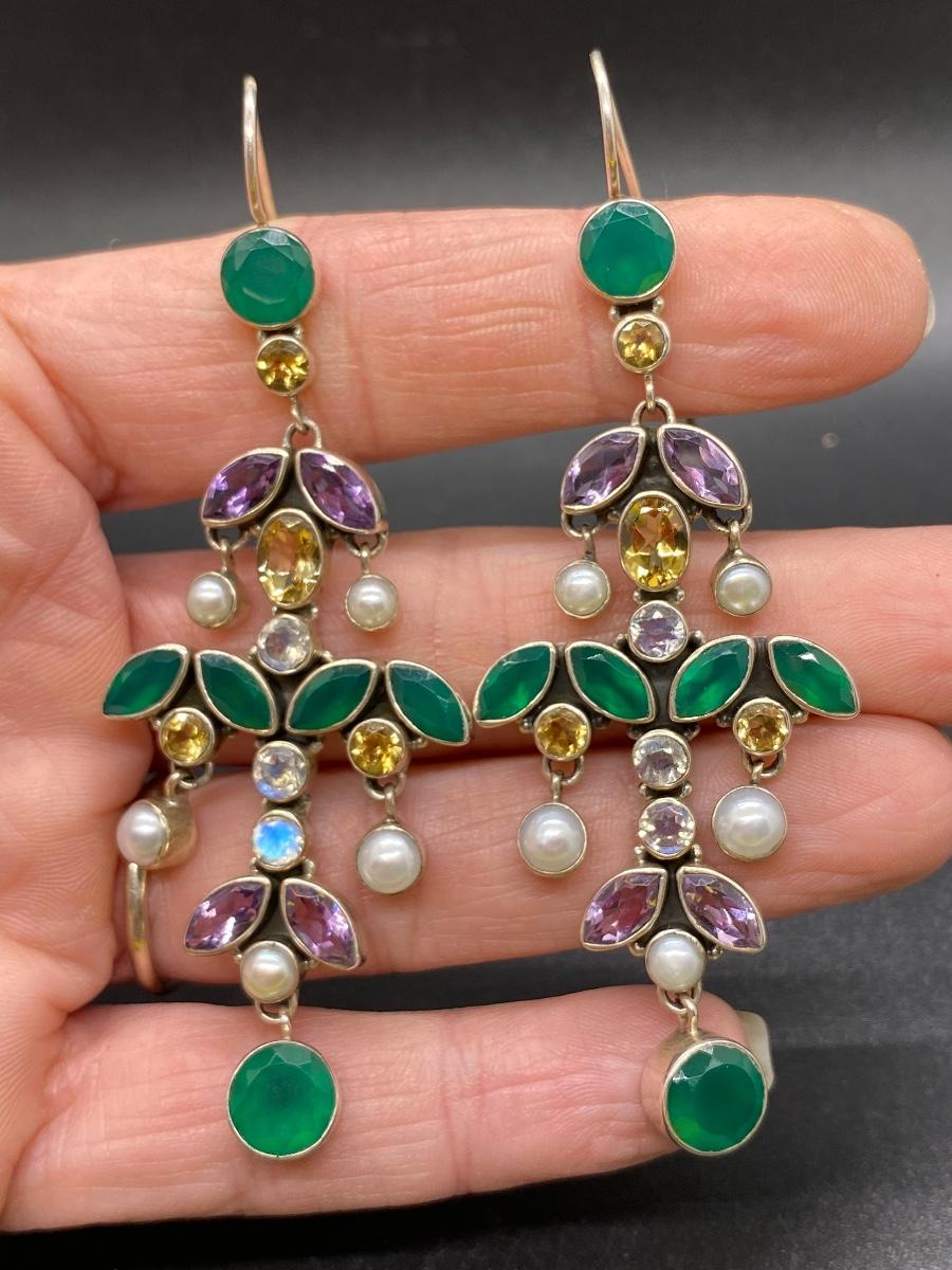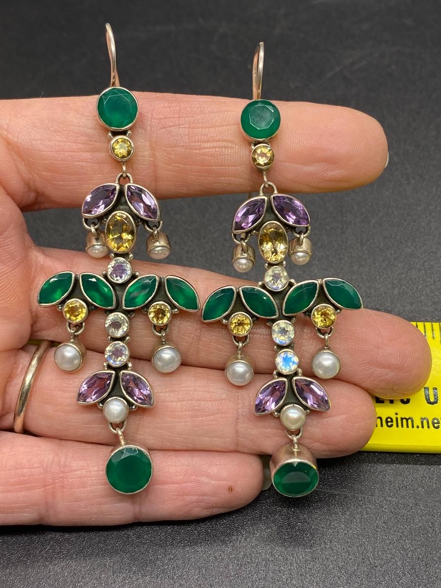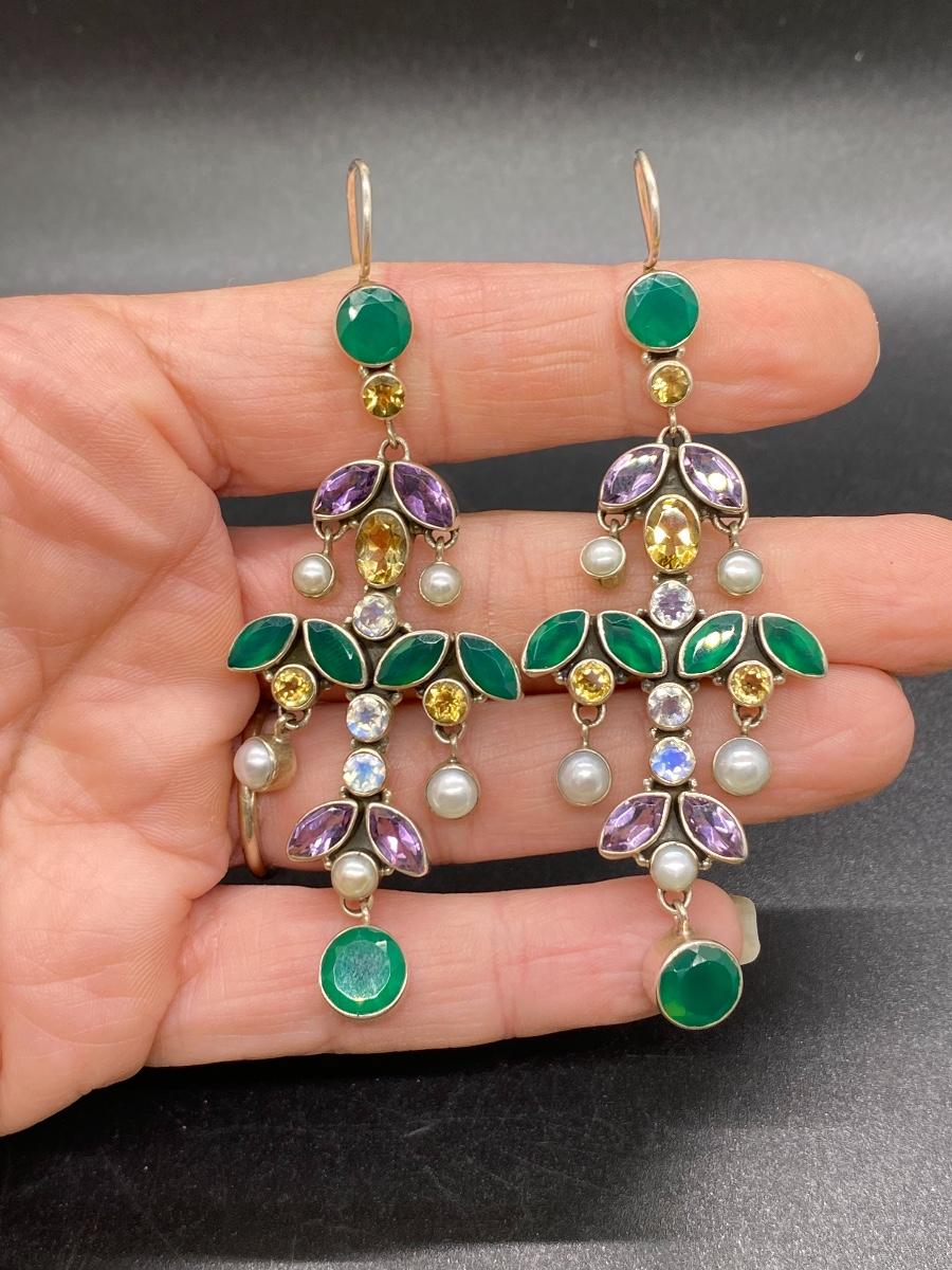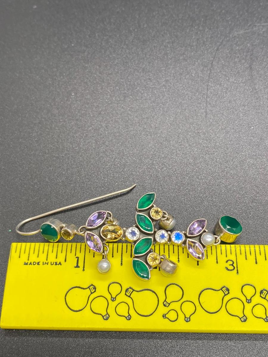 Beautiful Nicky Butler sterling silver and gemstone earrings. Long dangling earrings about 3" length. Gems look to be citrine, emerald, amethyst, faux pearl, and CZ. Made in India. Stamped on the back.