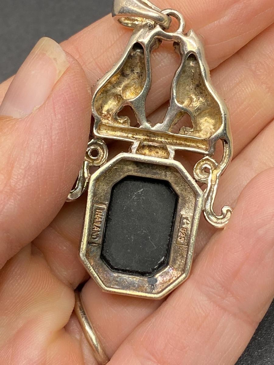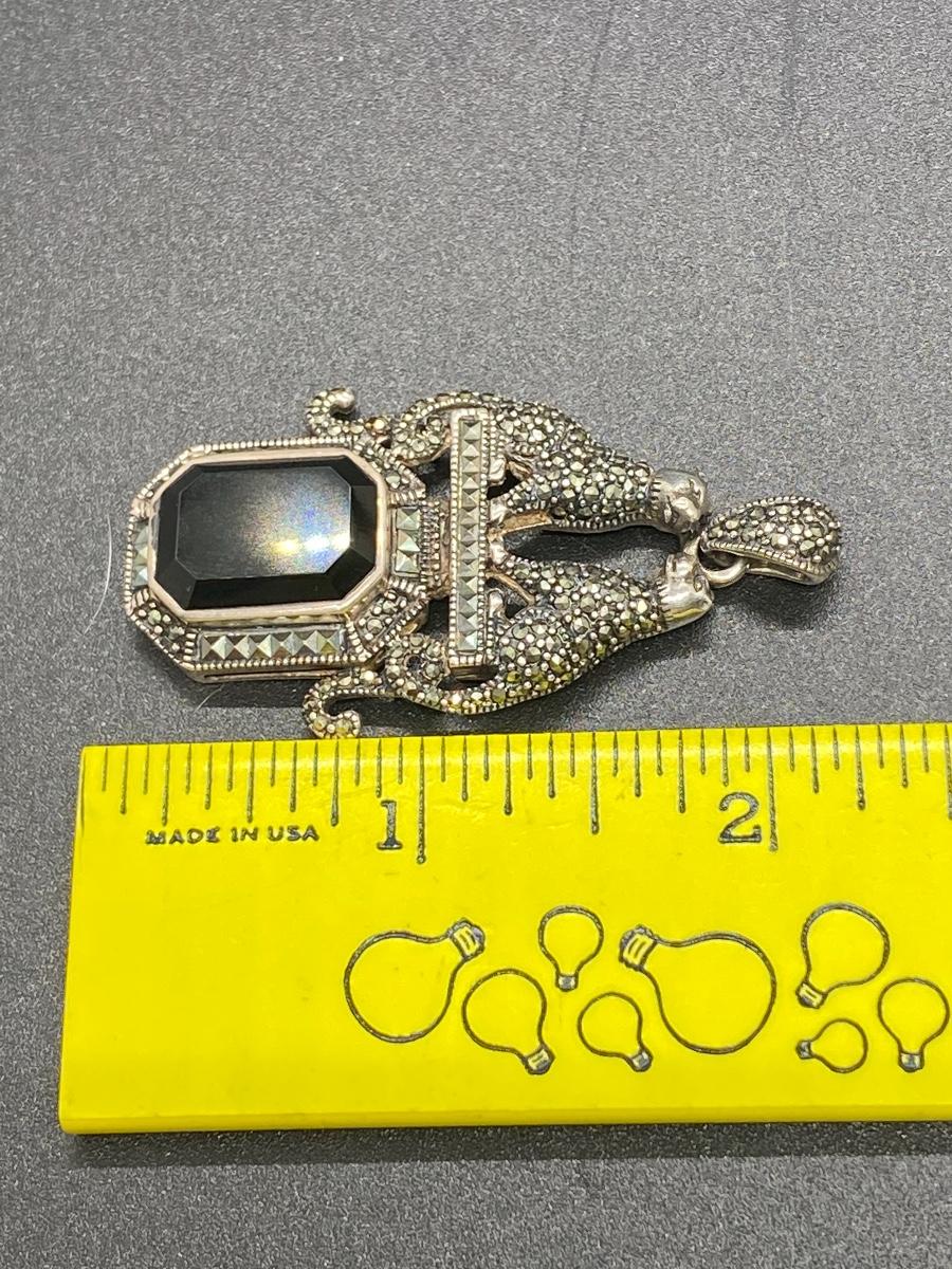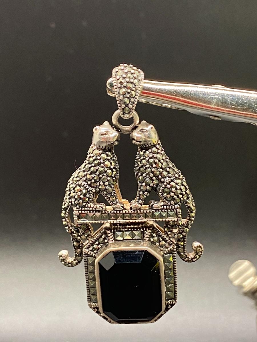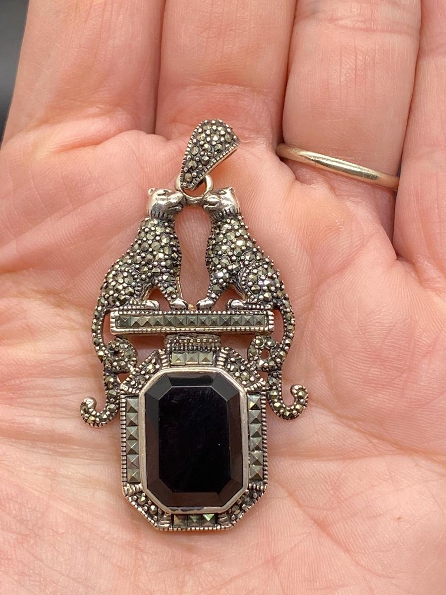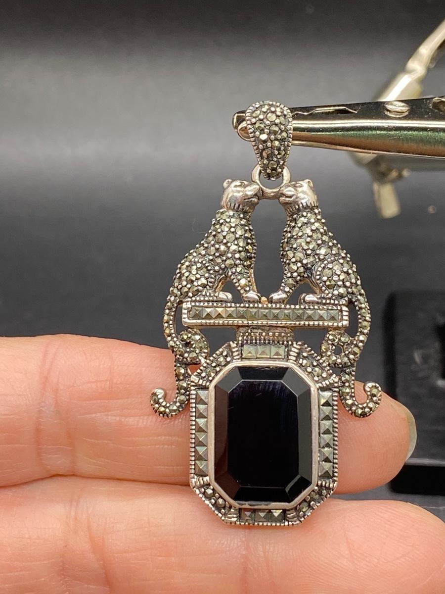 Sterling silver cat pendant. Large cut onyx center with marcasite accents. Large 2.25" length. Stamped on the back.