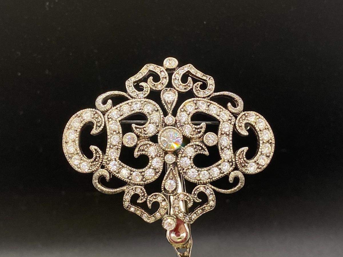 Vintage style Camrose & Kross JBK Jackie Bouvier Kennedy rhinestone brooch. Crystal clear stones in silvertone setting. Stamped on the back. About 2.75" size.