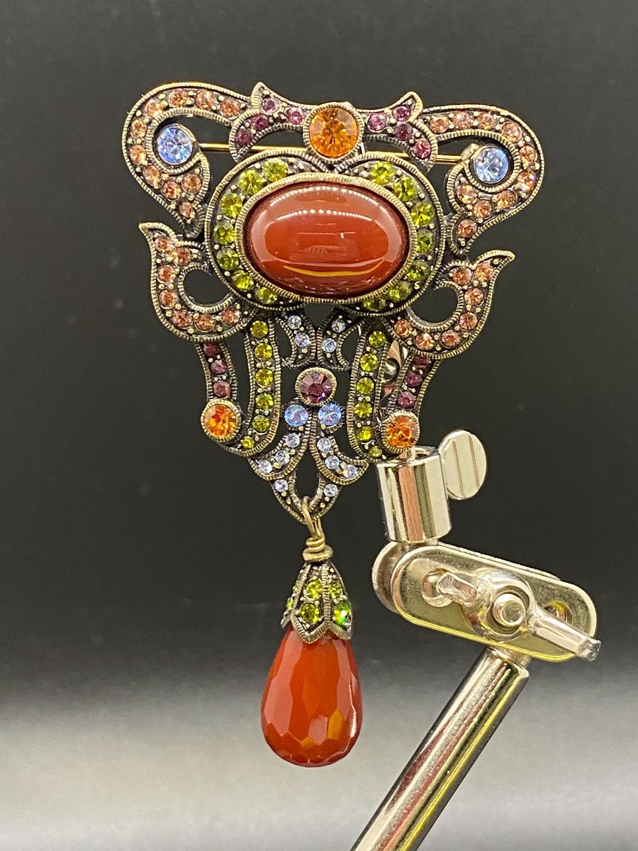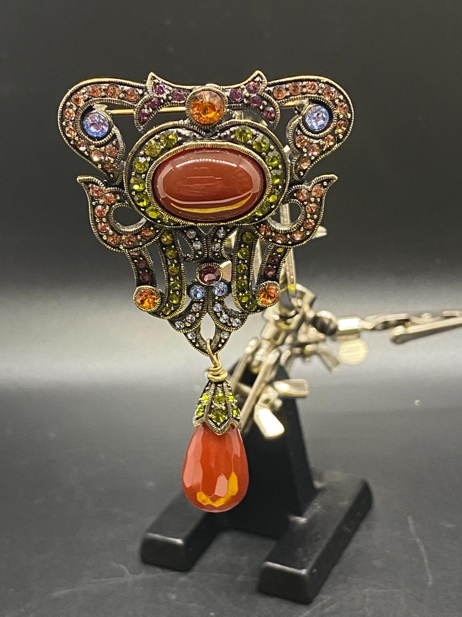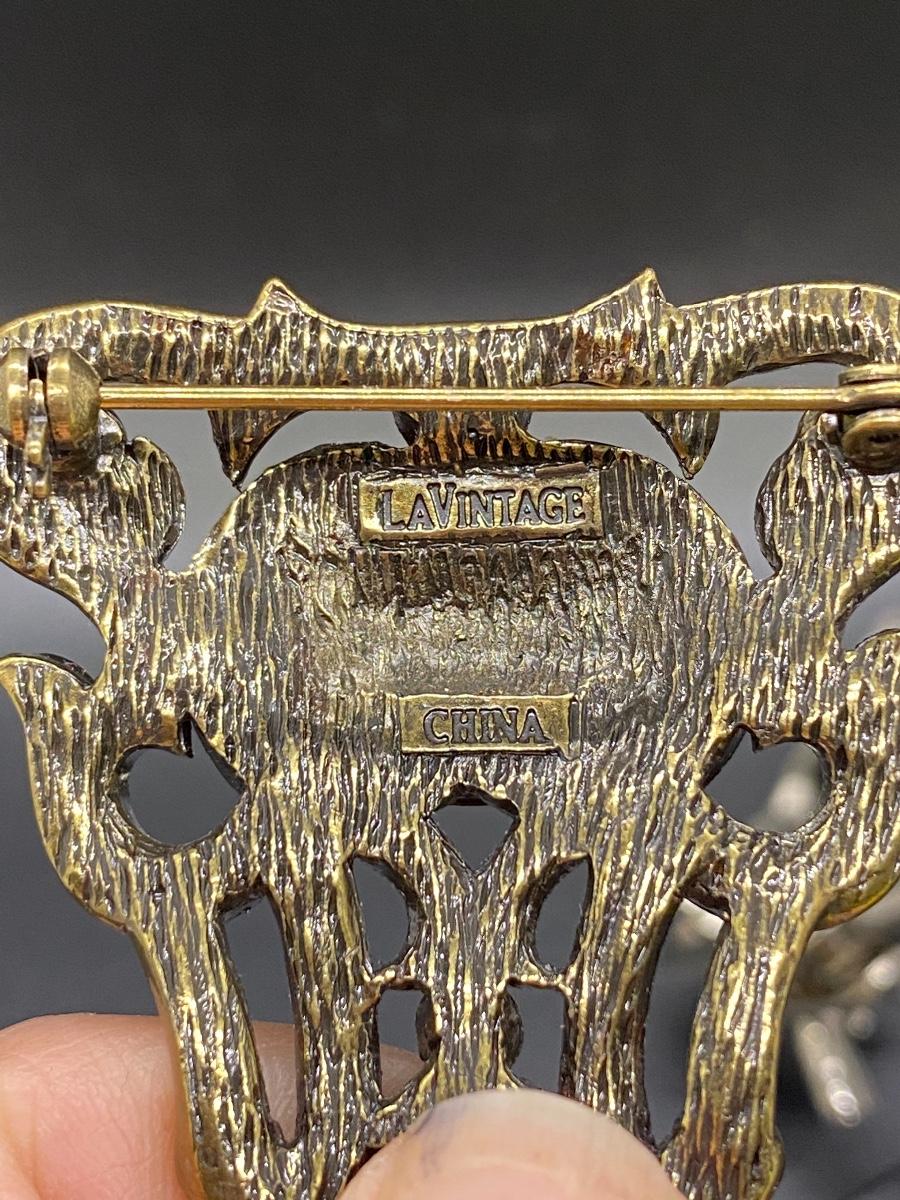 LA Vintage statement brooch. Colorful rhinestone brooch about 3" size. Dark goldtone setting. Stamped on the back.