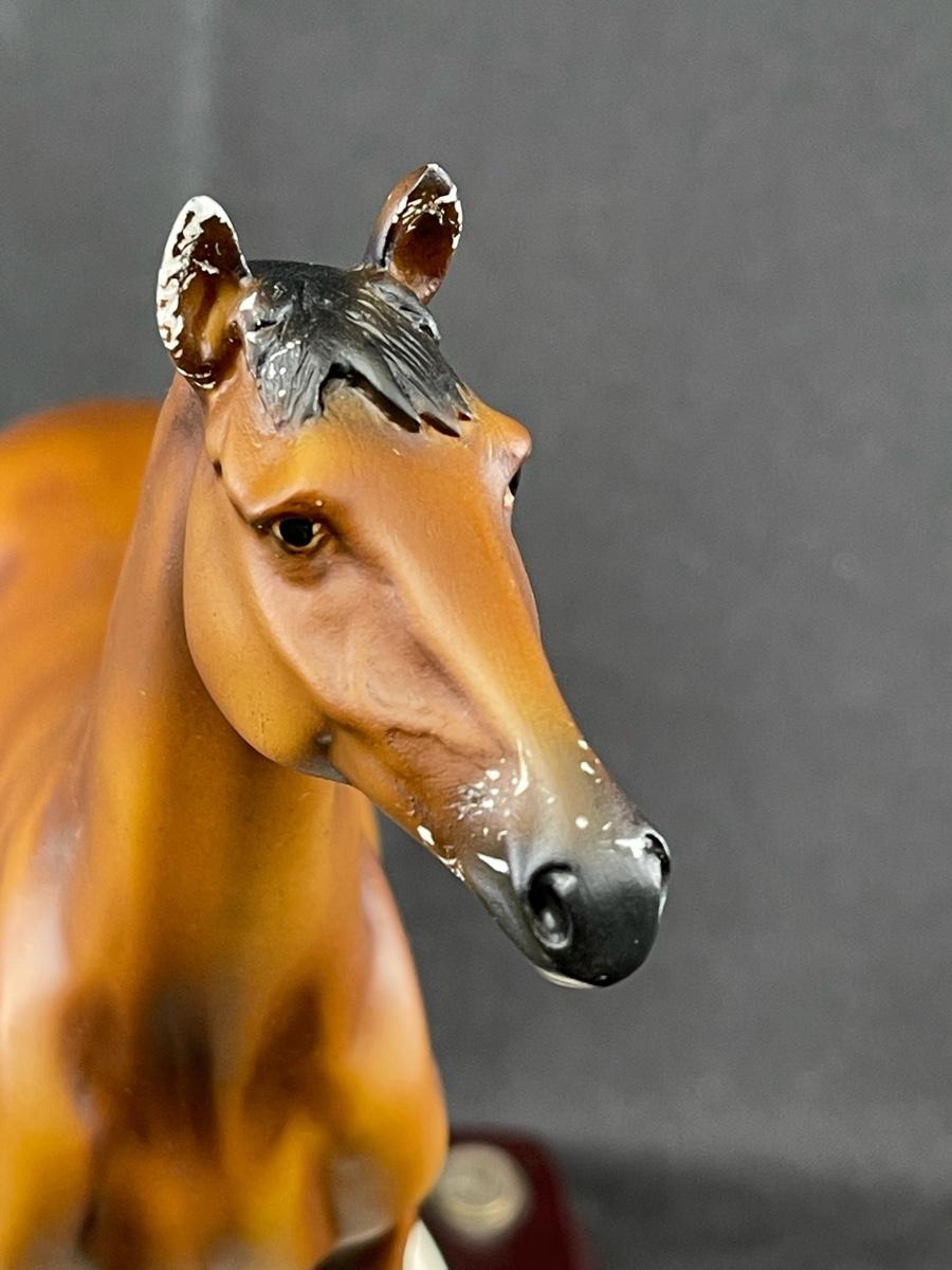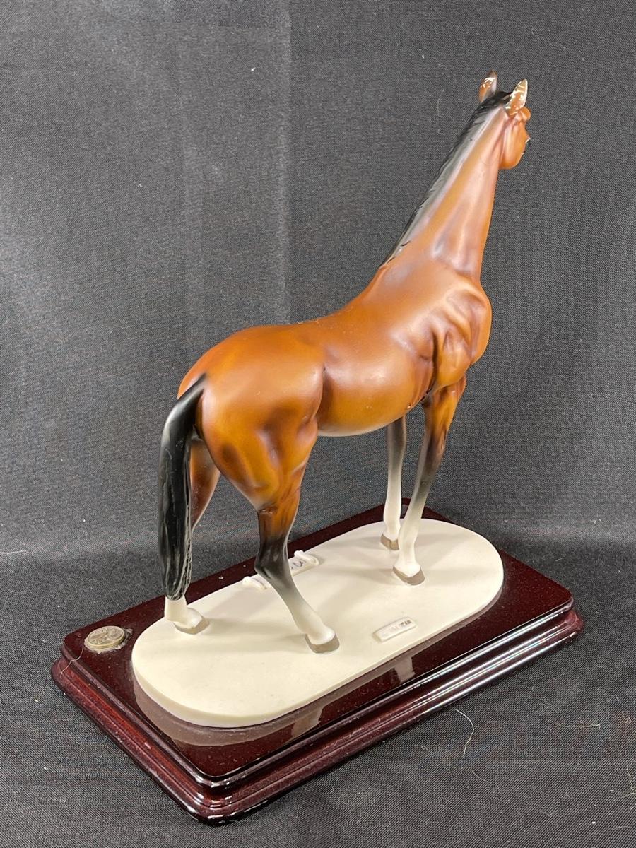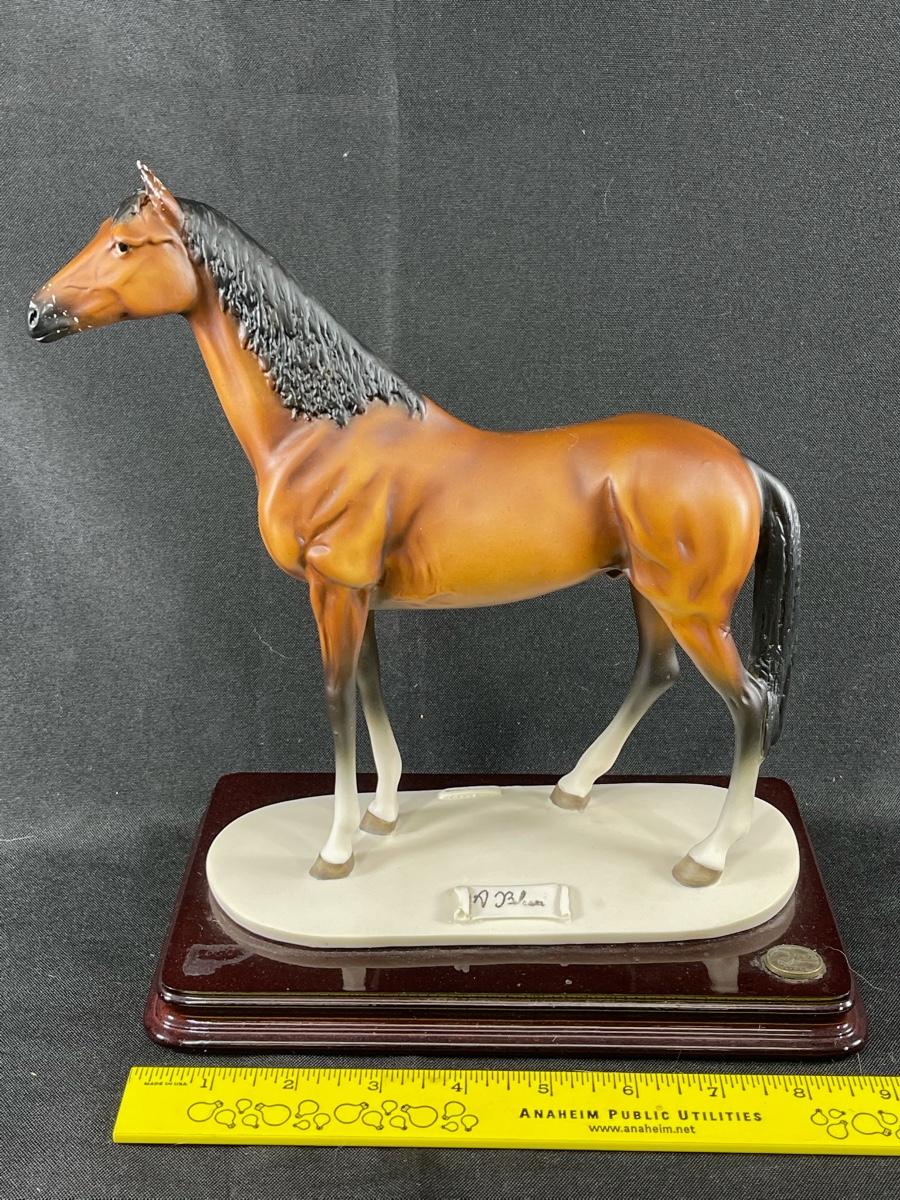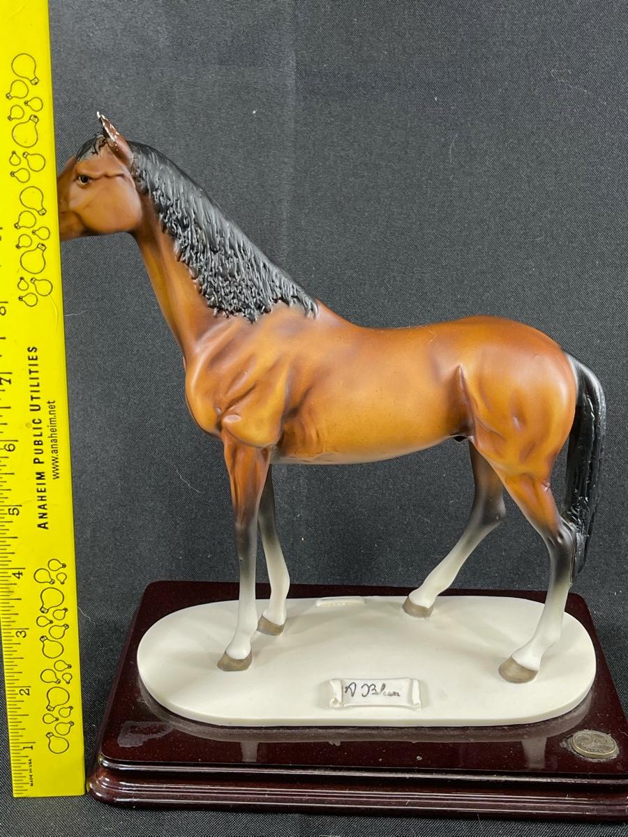 Realistic horse statue on wood base. Made in Italy, artist signed. About 11" size.