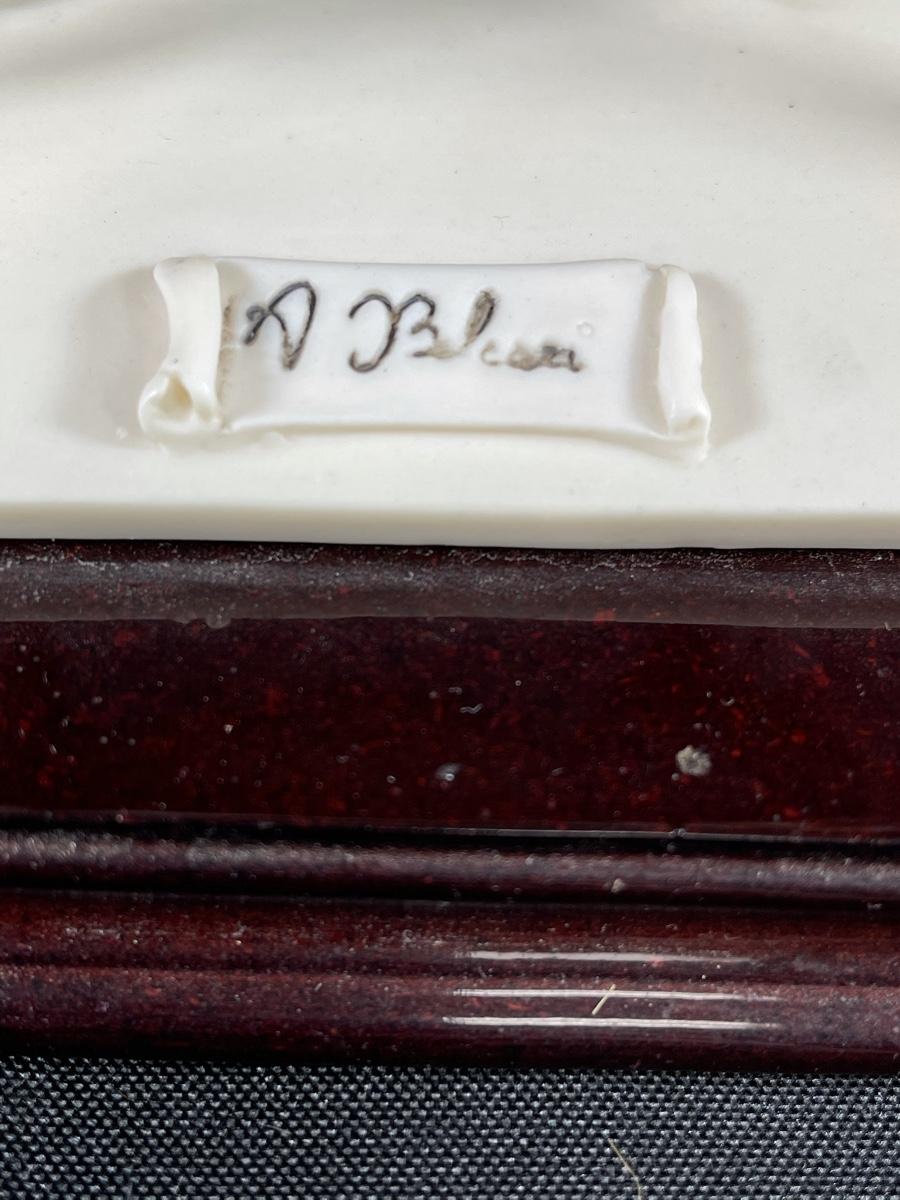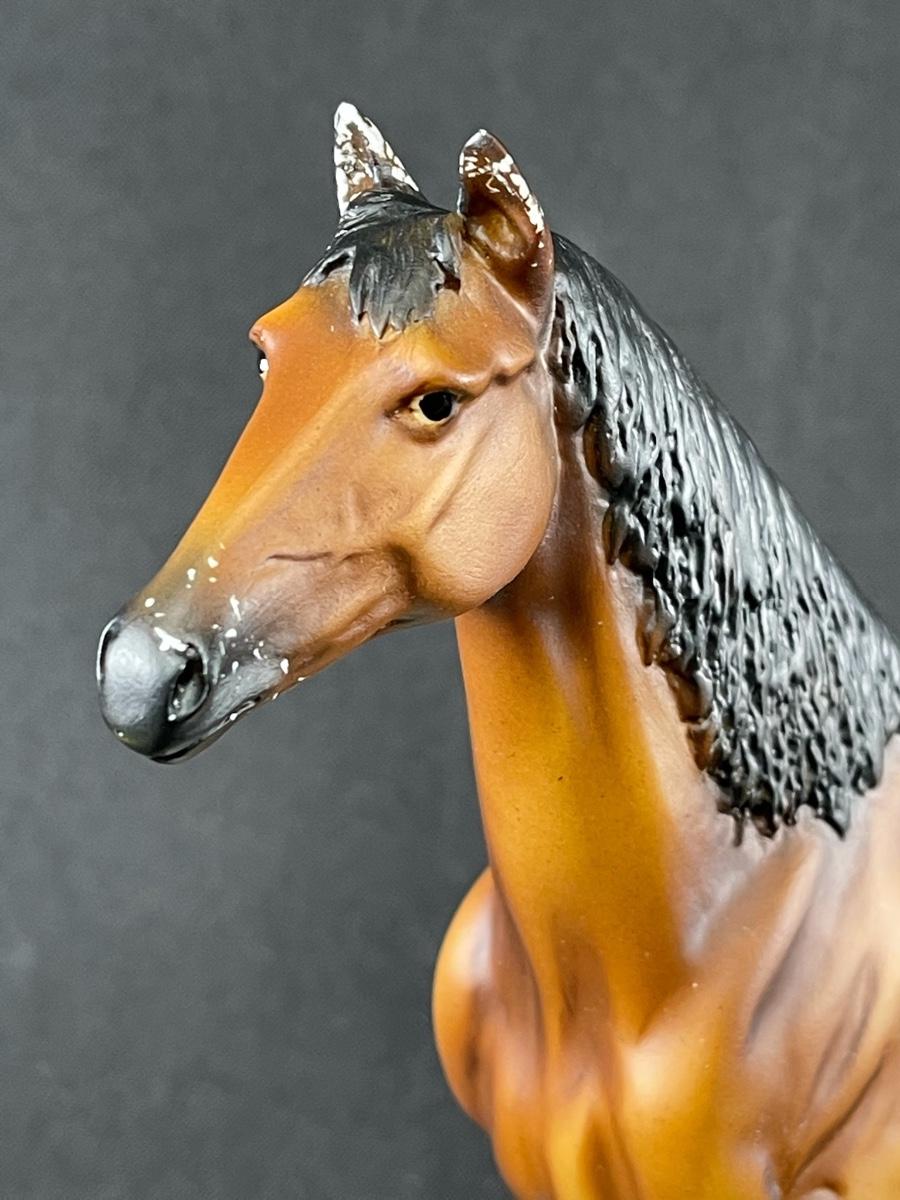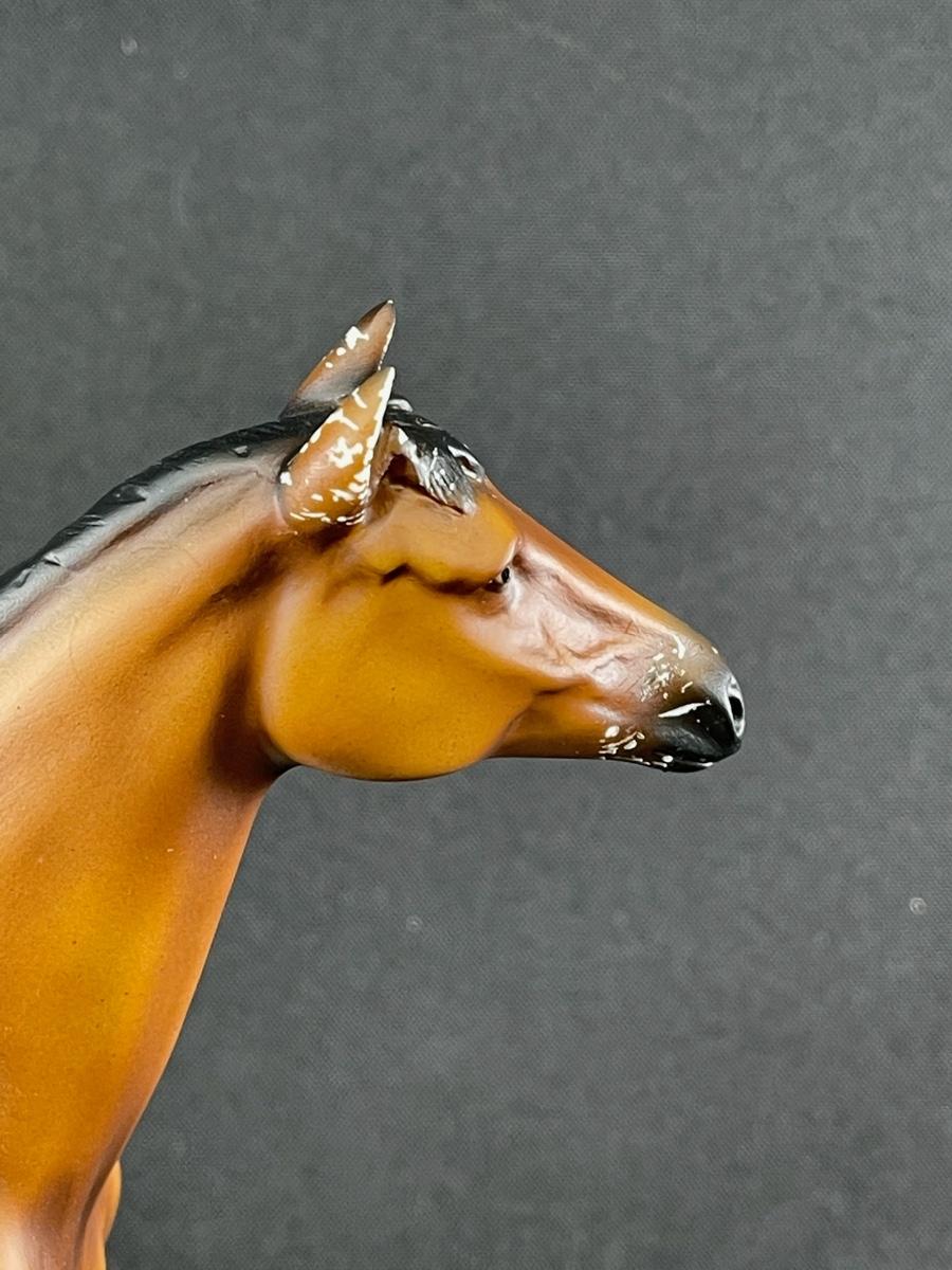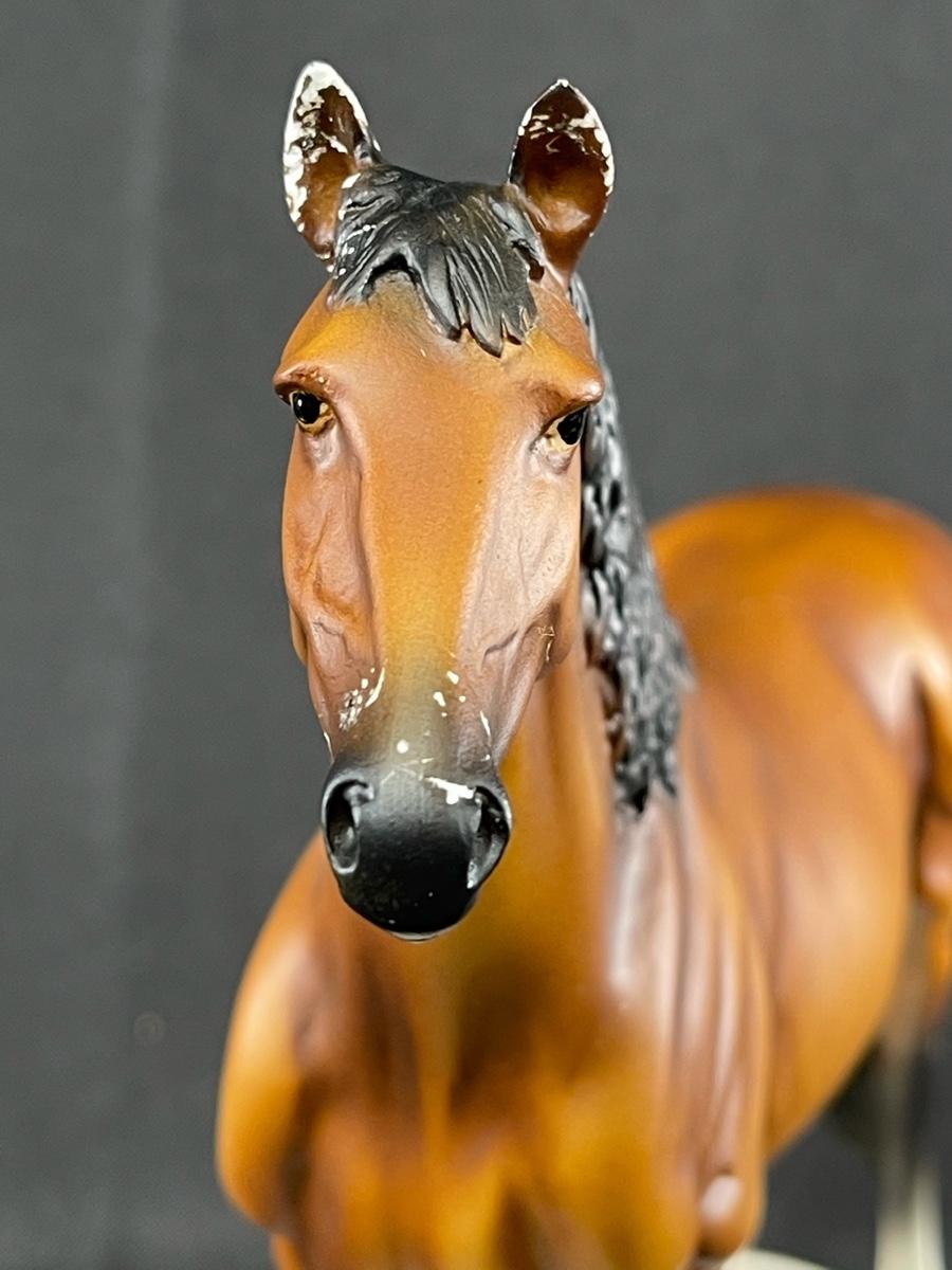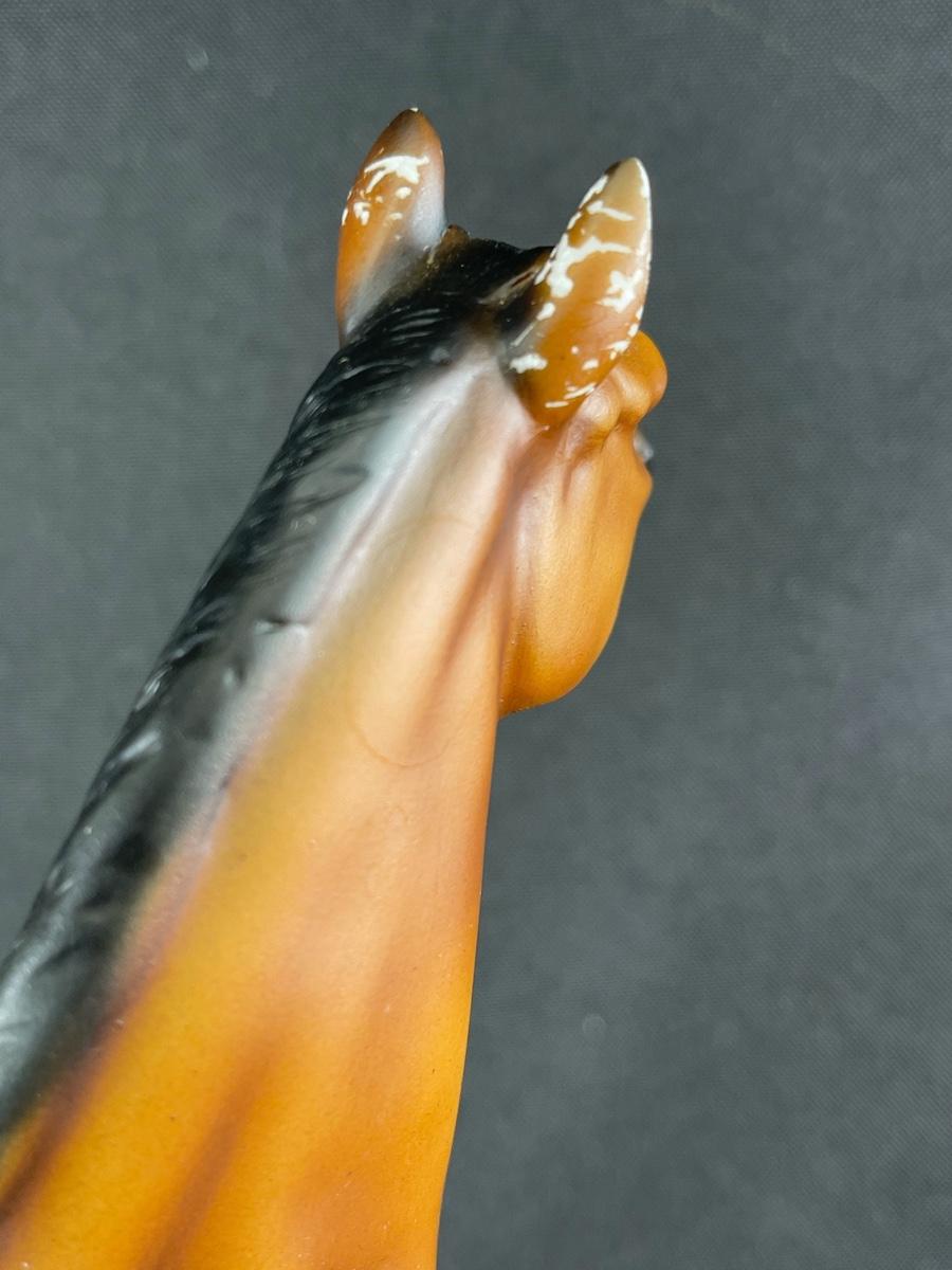 Realistic horse statue on wood base. Made in Italy, artist signed. About 11" size.