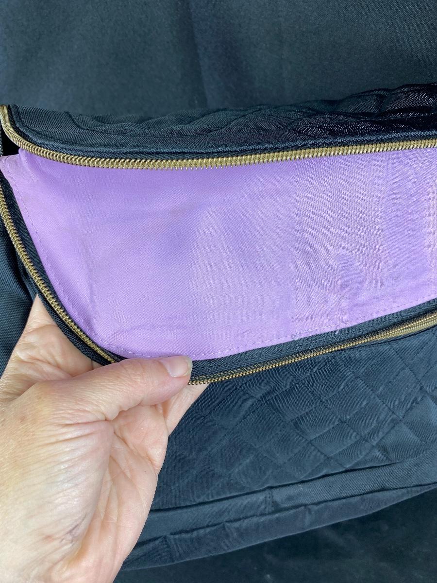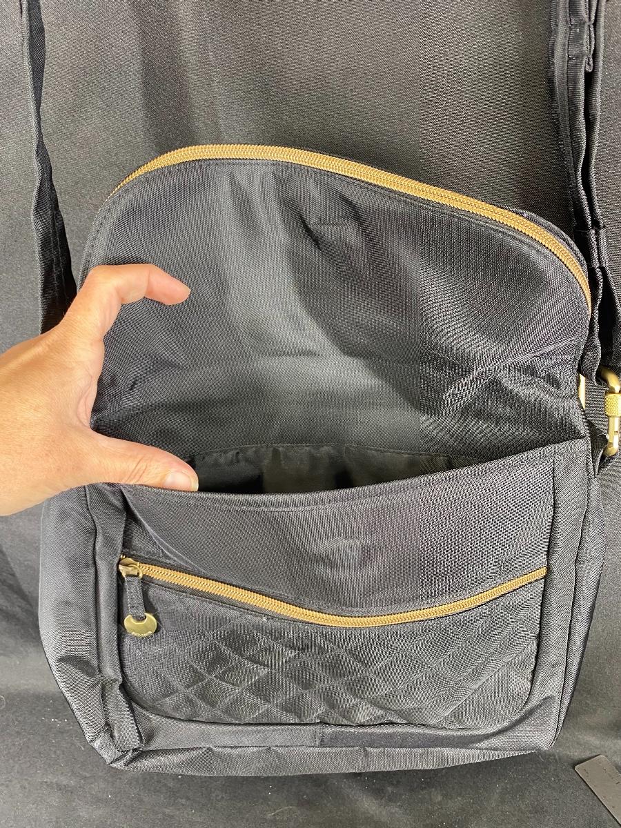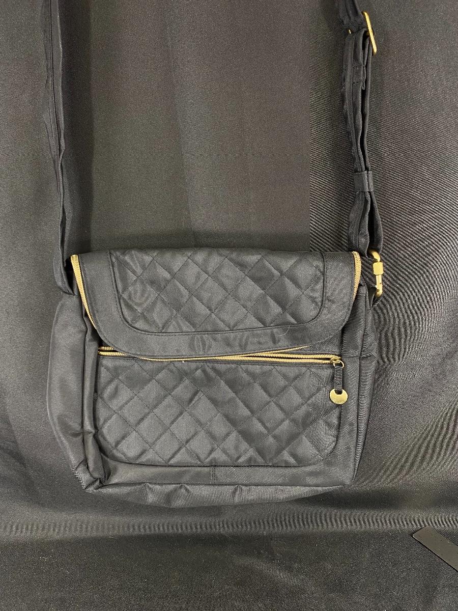 Black quilted crossbody handbag by Travelon. Multiple zipper pockets. Great for vacations, has anti-theft properties to it.