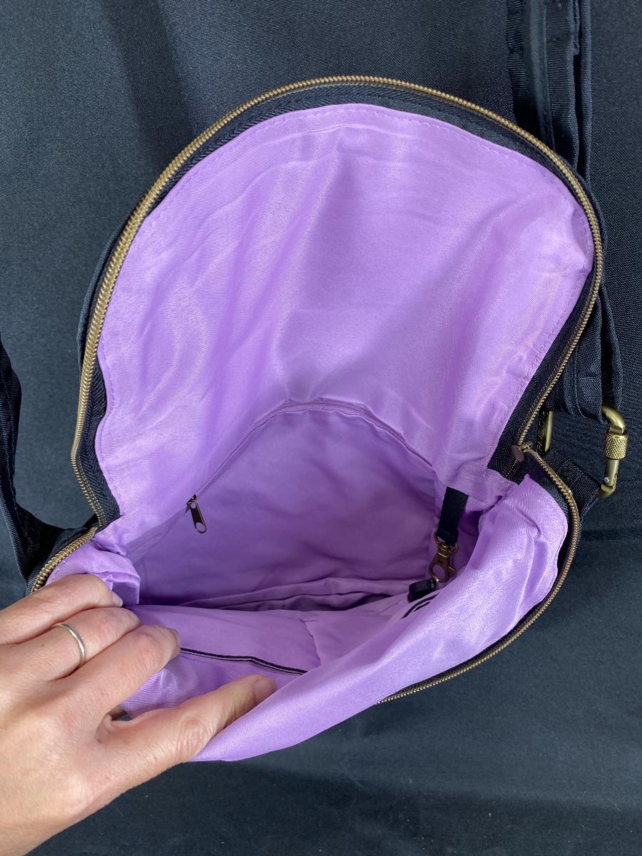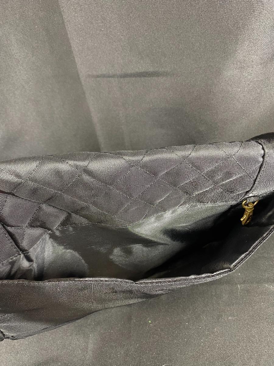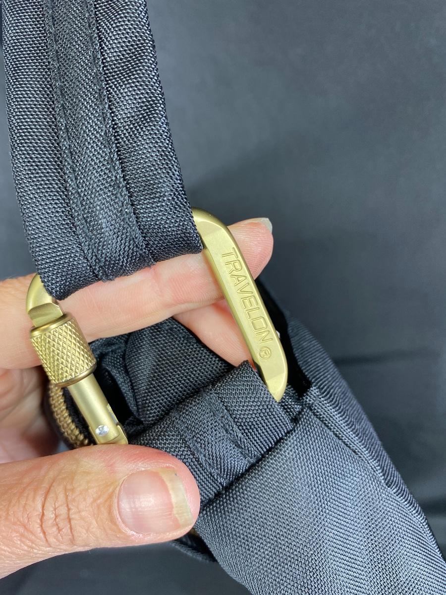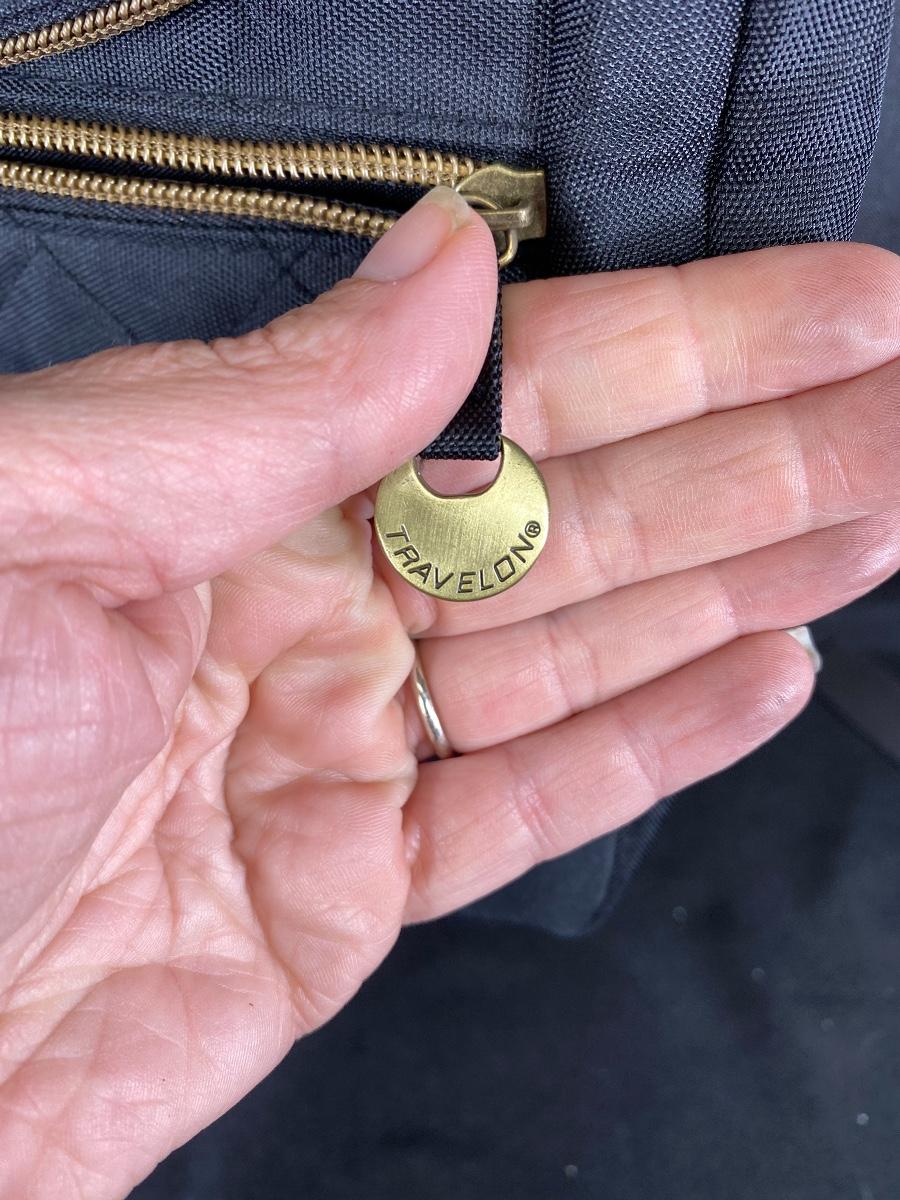 Black quilted crossbody handbag by Travelon. Multiple zipper pockets. Great for vacations, has anti-theft properties to it.