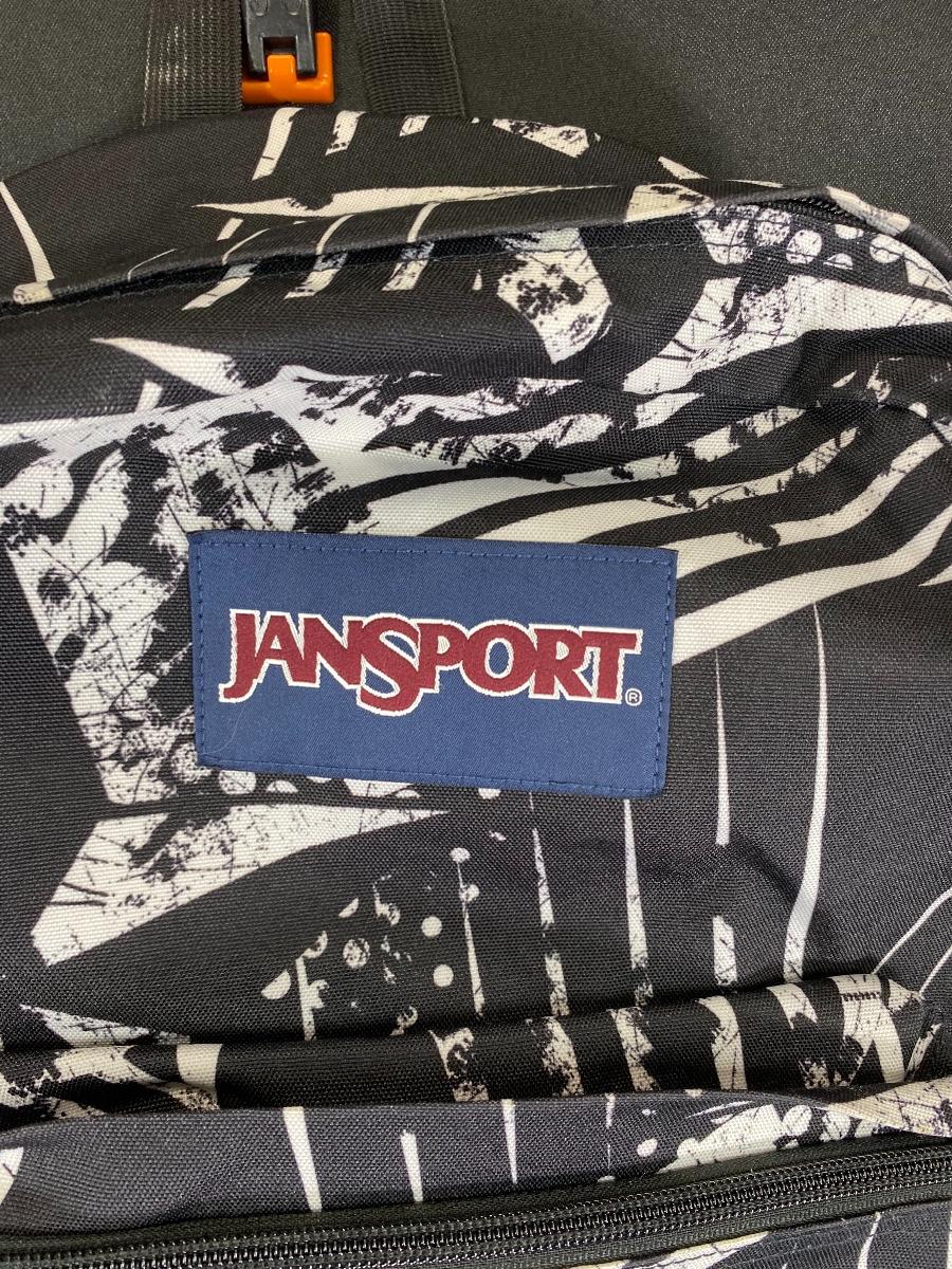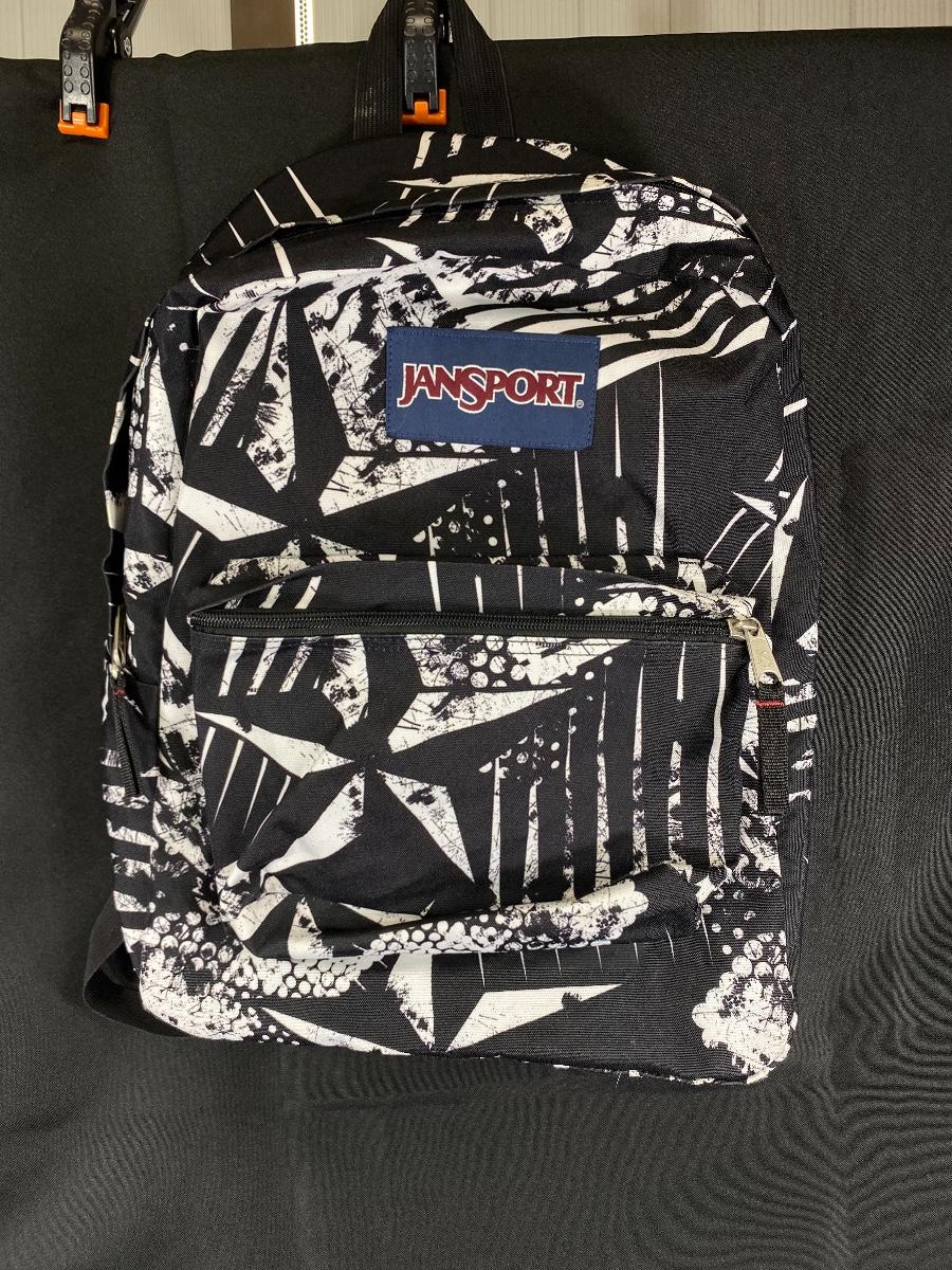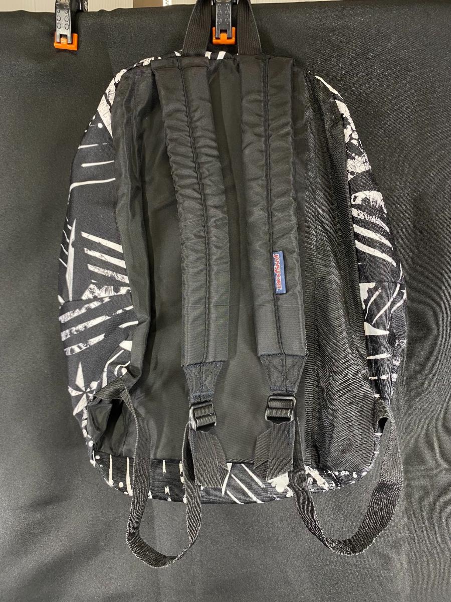 JanSport black & white abstract design backpack. Two zipper pockets, lightweight. Good used condition.