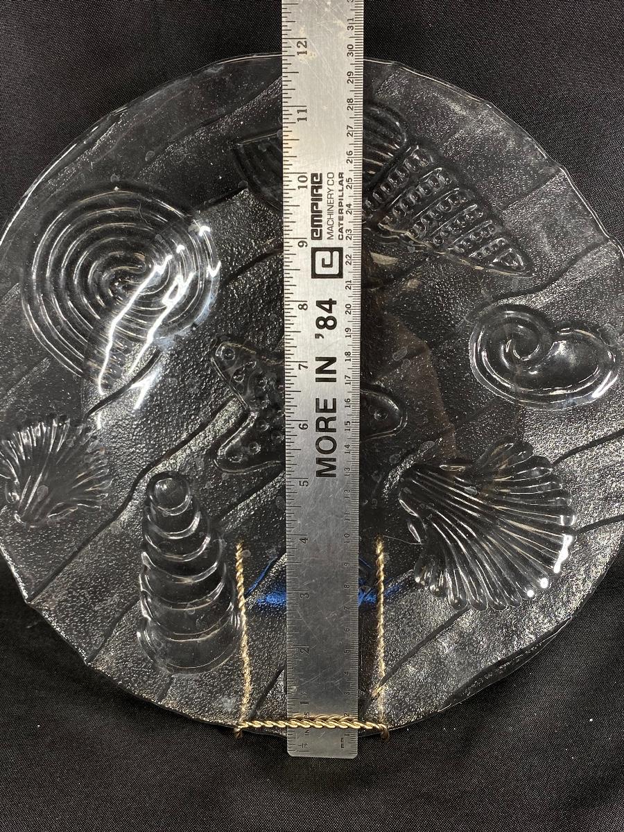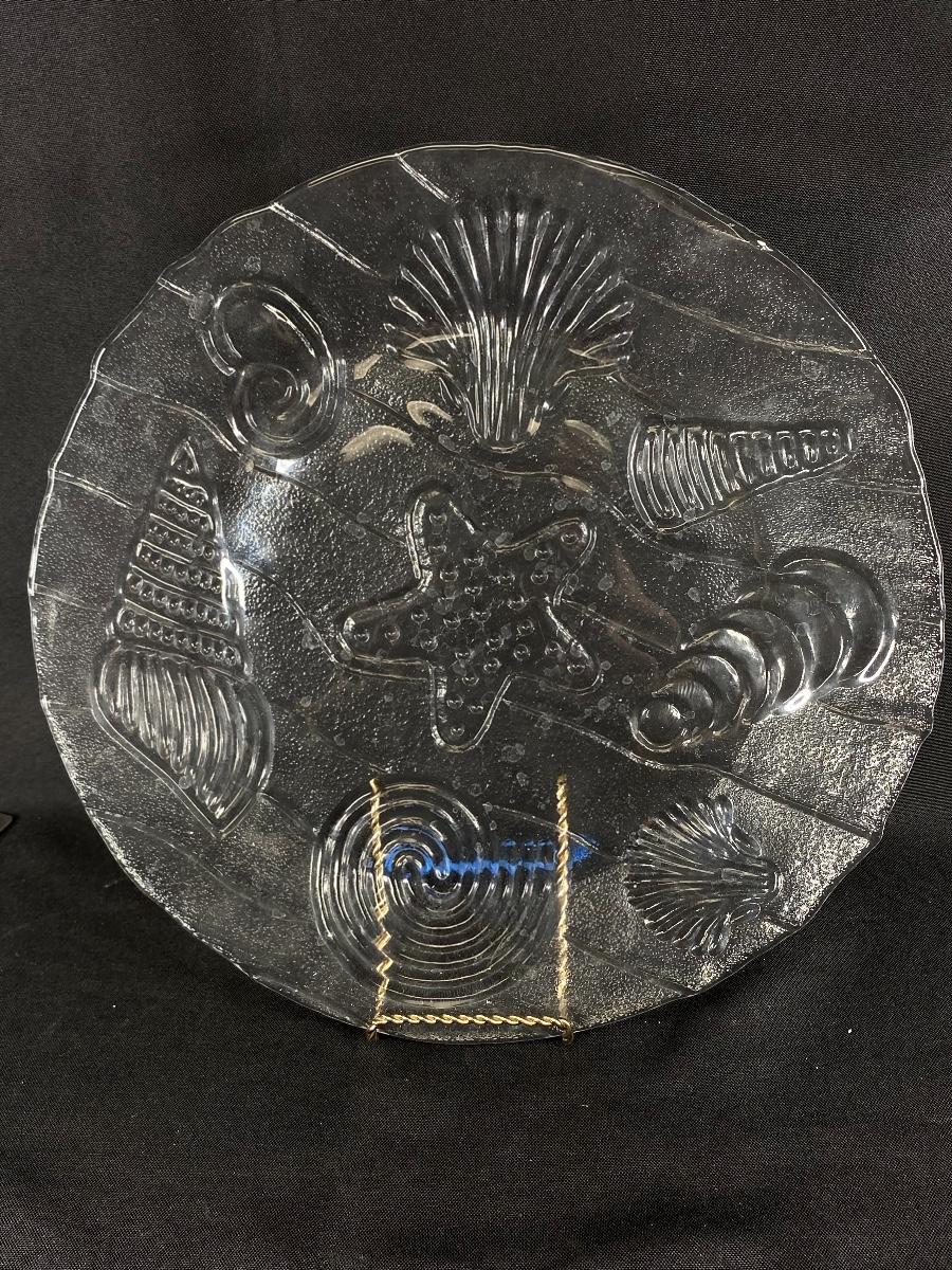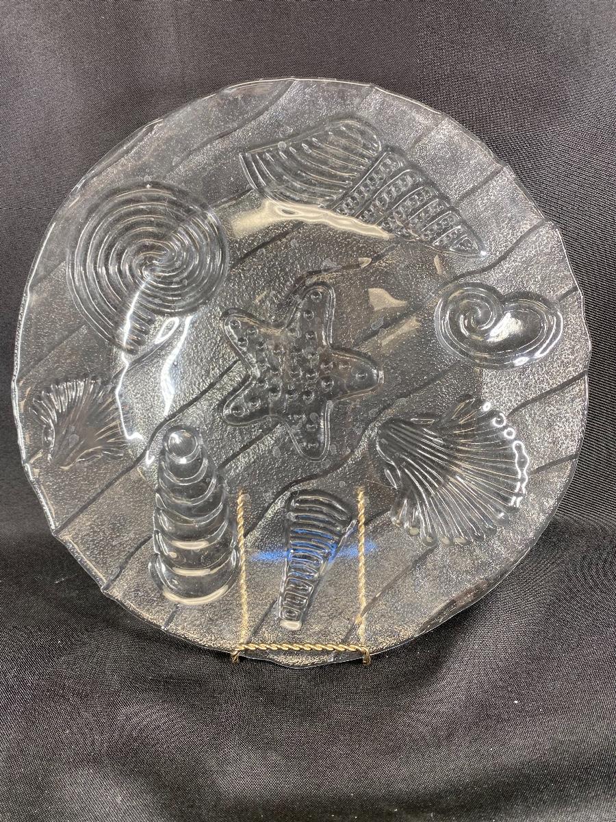 Seashell embossed glass serving plate. Great for summertime BBQ's. Good condition. About 12" size.