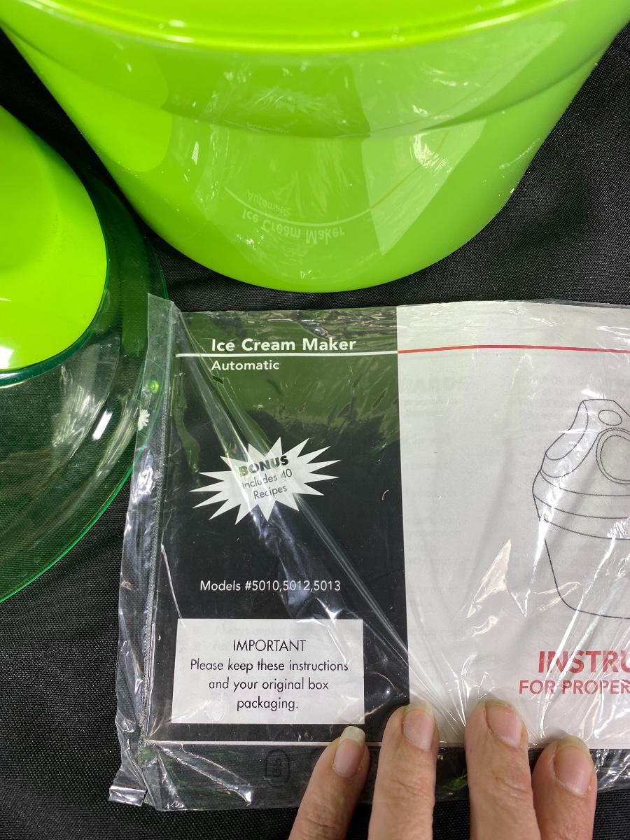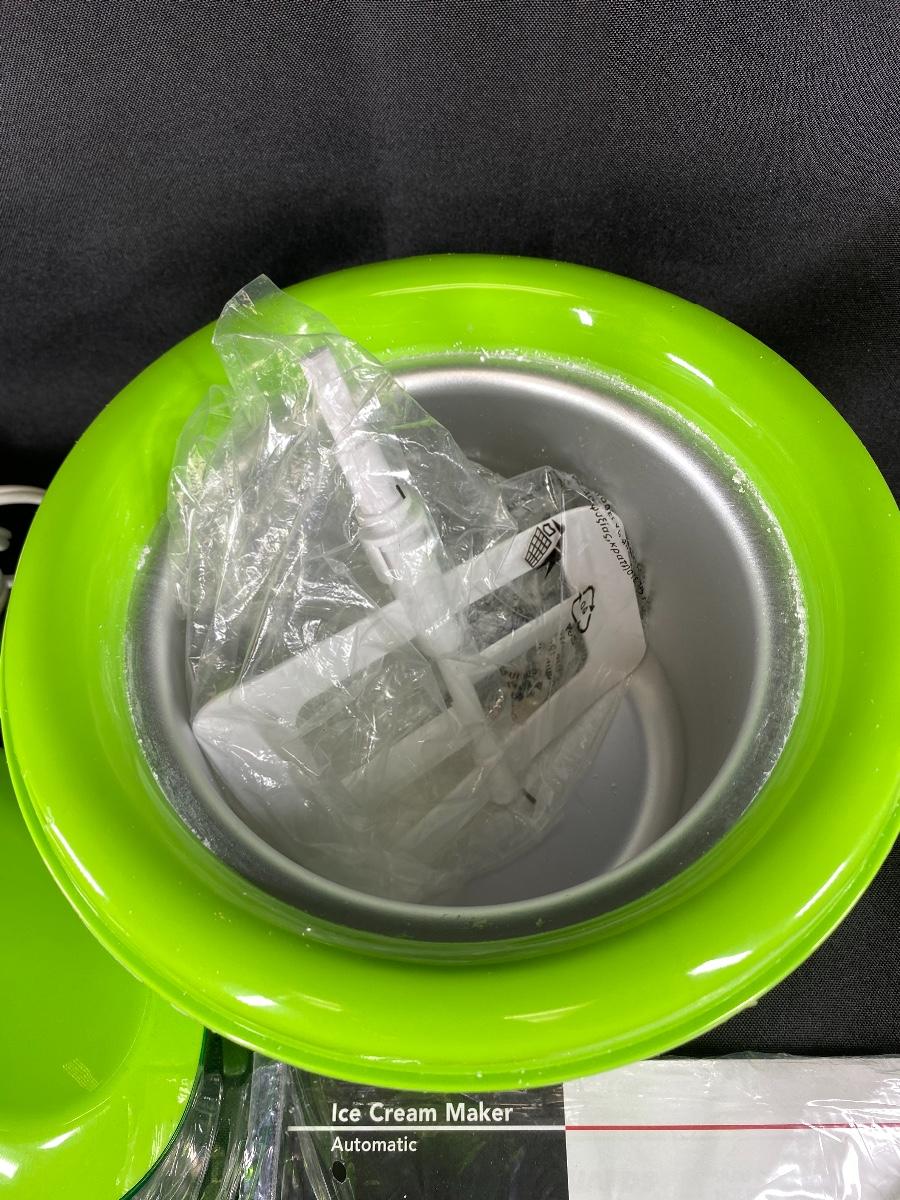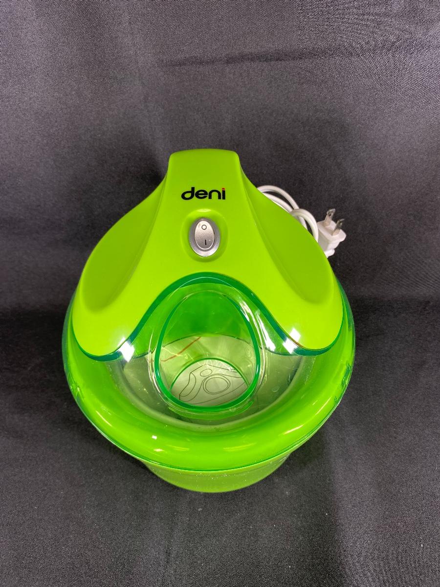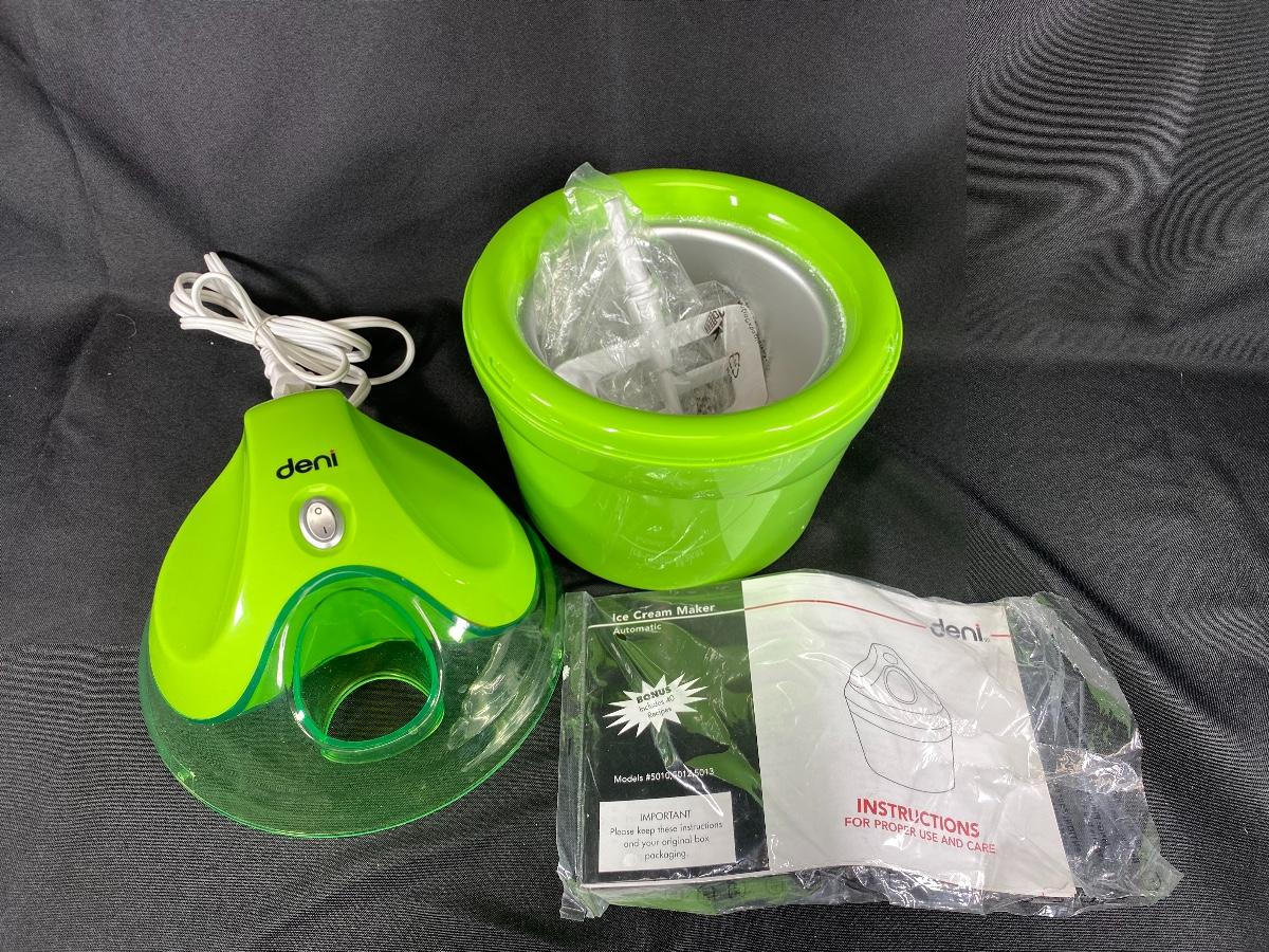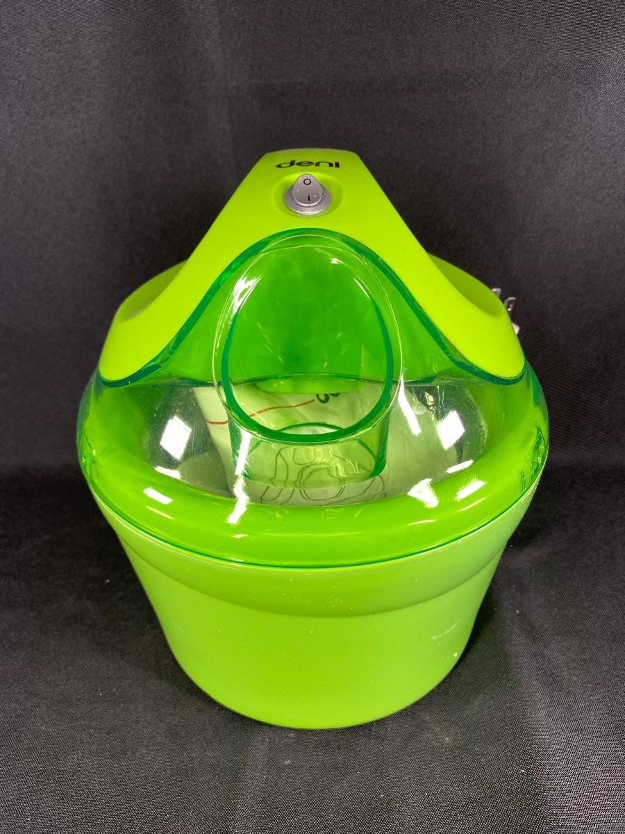 Bright green ice cream machine from Deni. Electric machine. Looks unused, manual and blade are in plastic still. Small size, maybe a 1.5 quart.