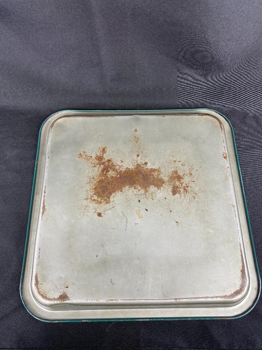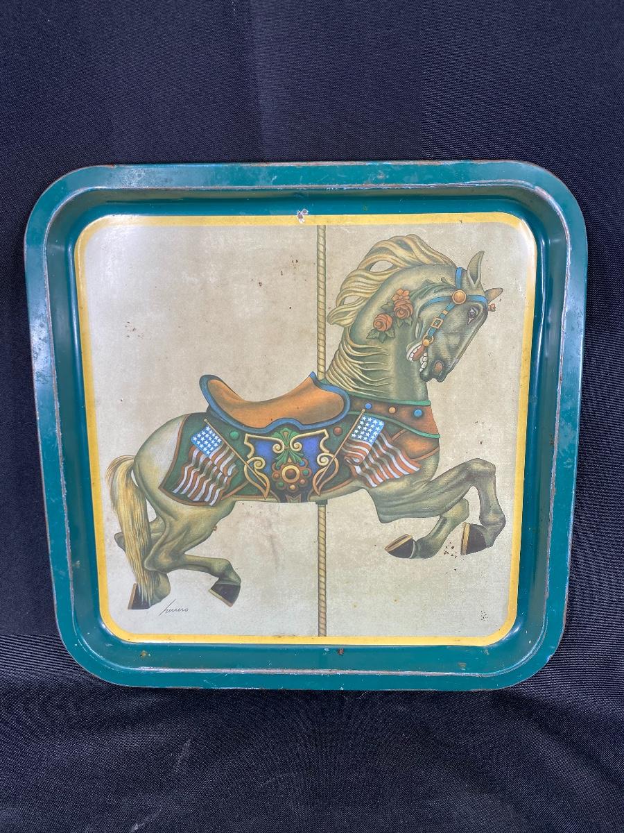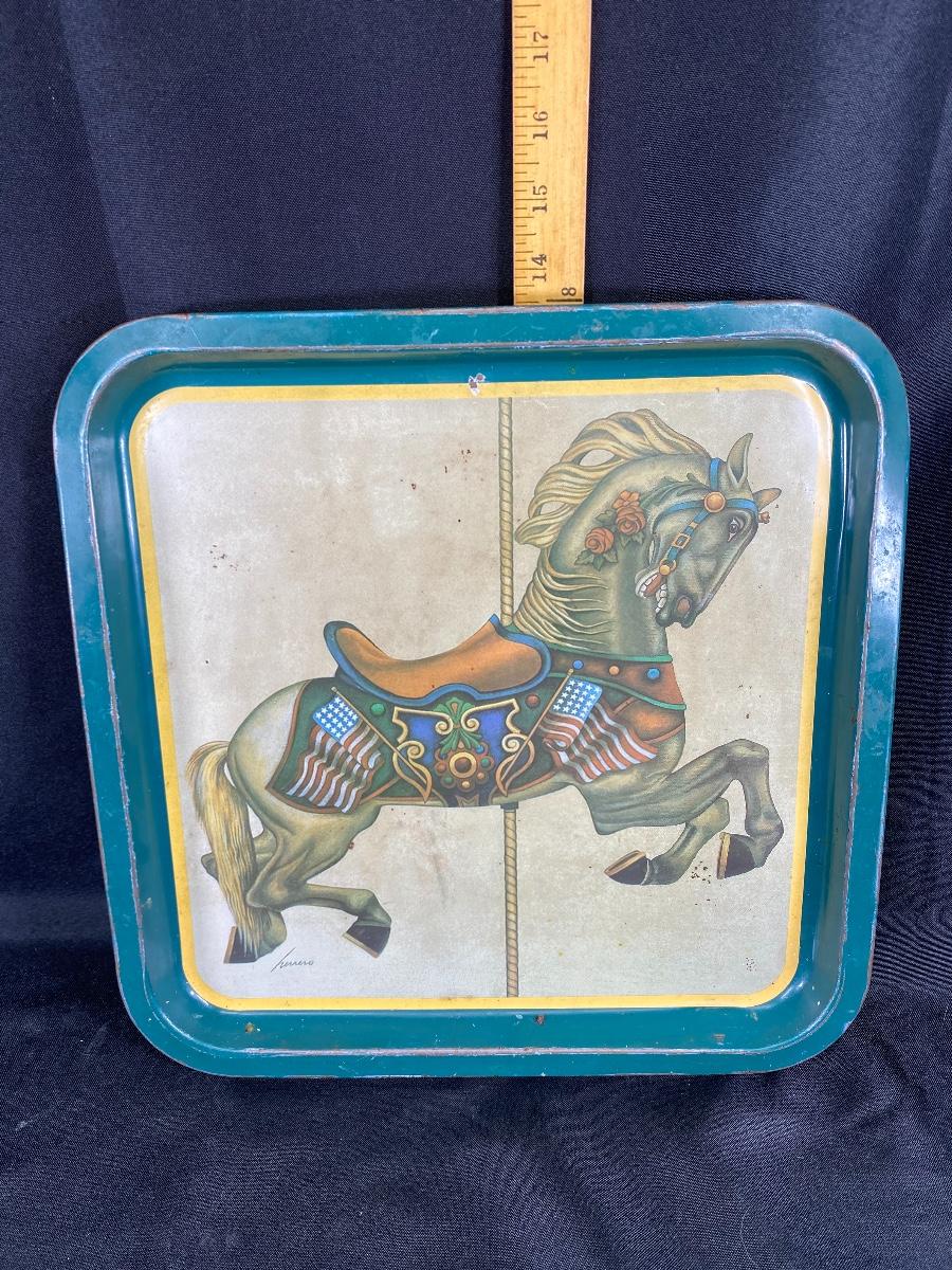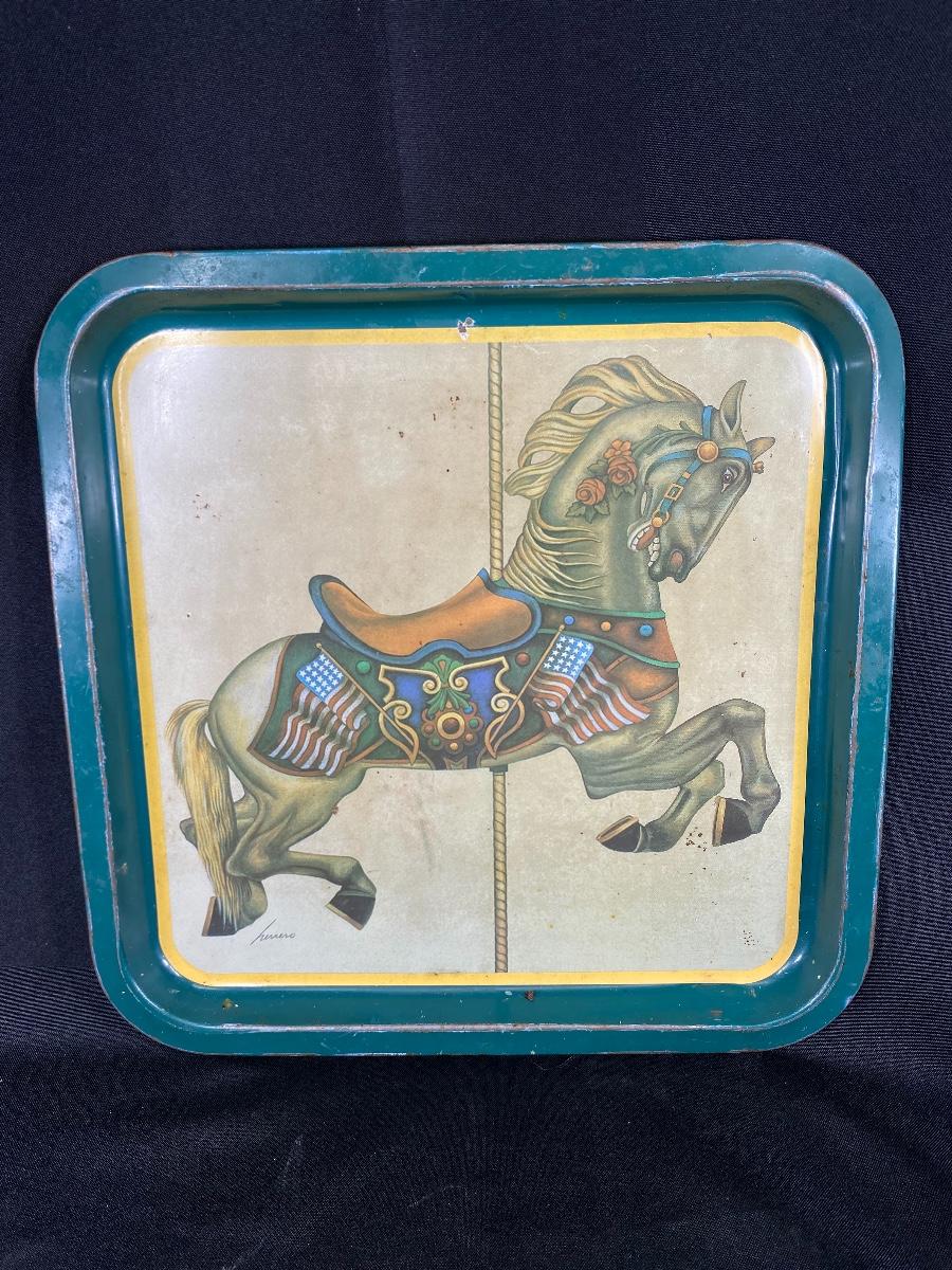 Vintage carousel horse print metal tray. Square shape. Does have signs of age, scratches, rust. Good for display. About 14" size. Made by Vandor, Japan.