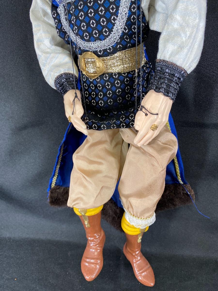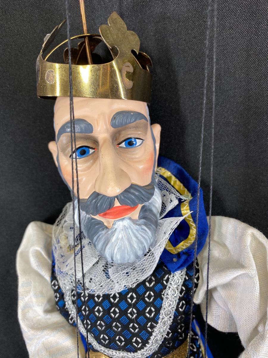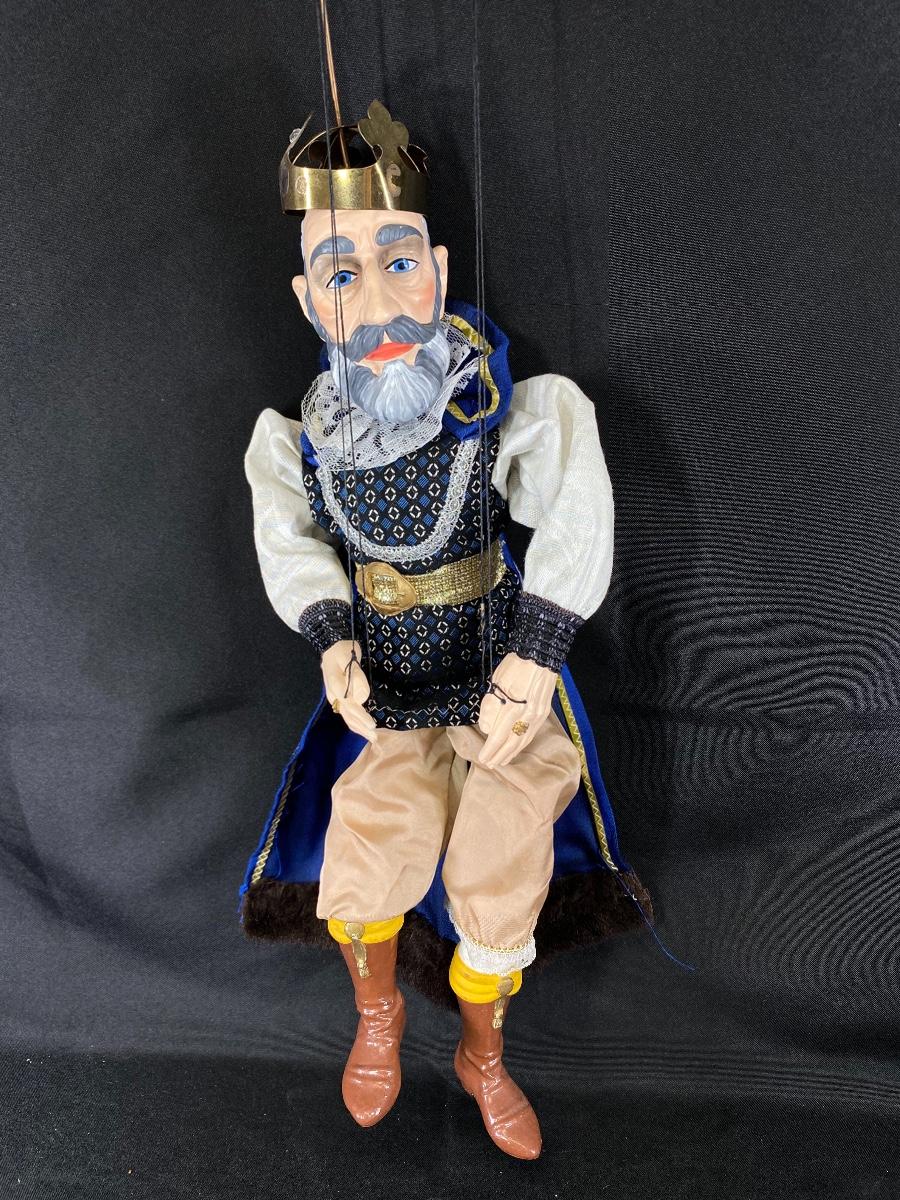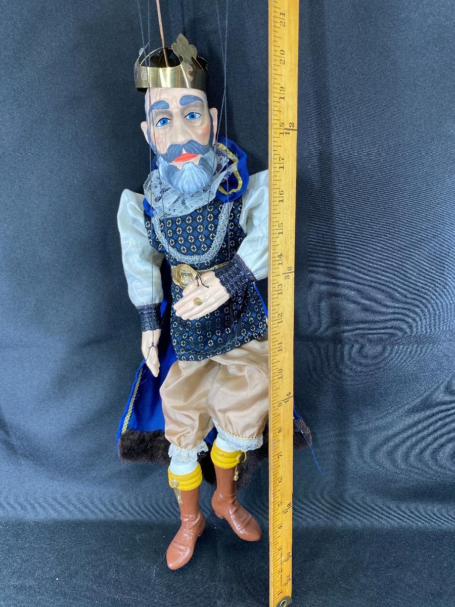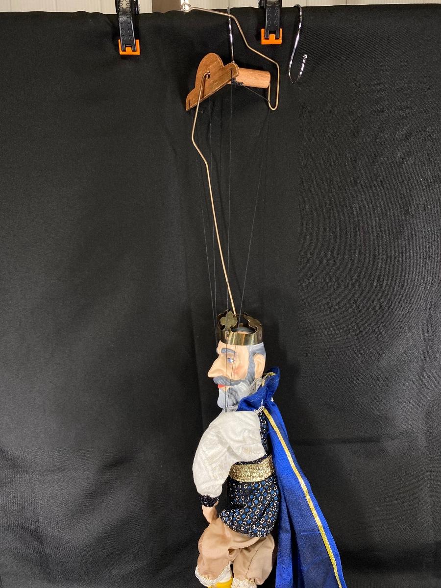 Vintage King Friday marionette string puppet. Easy control with a rod connected. No maker marks. In good condition, a little dusty from display. Almost 36" total length with rod.