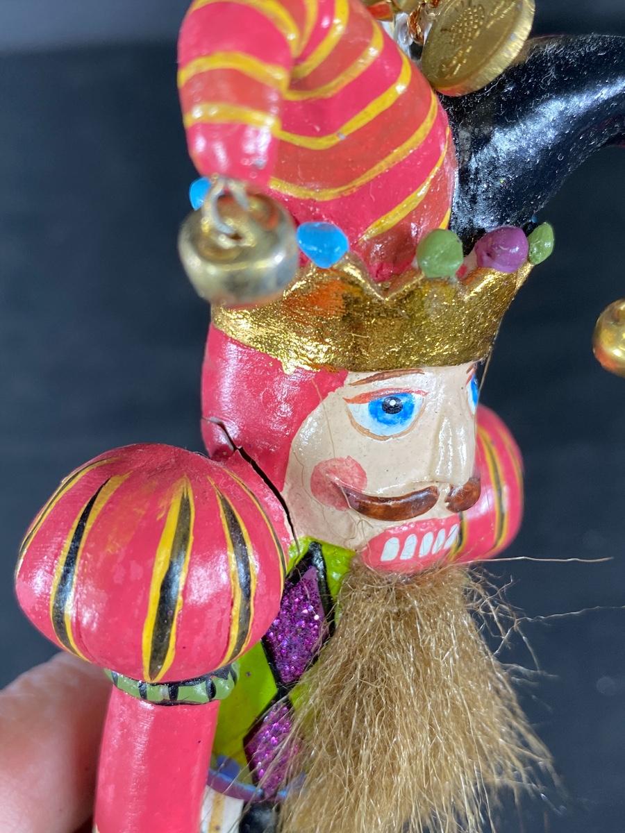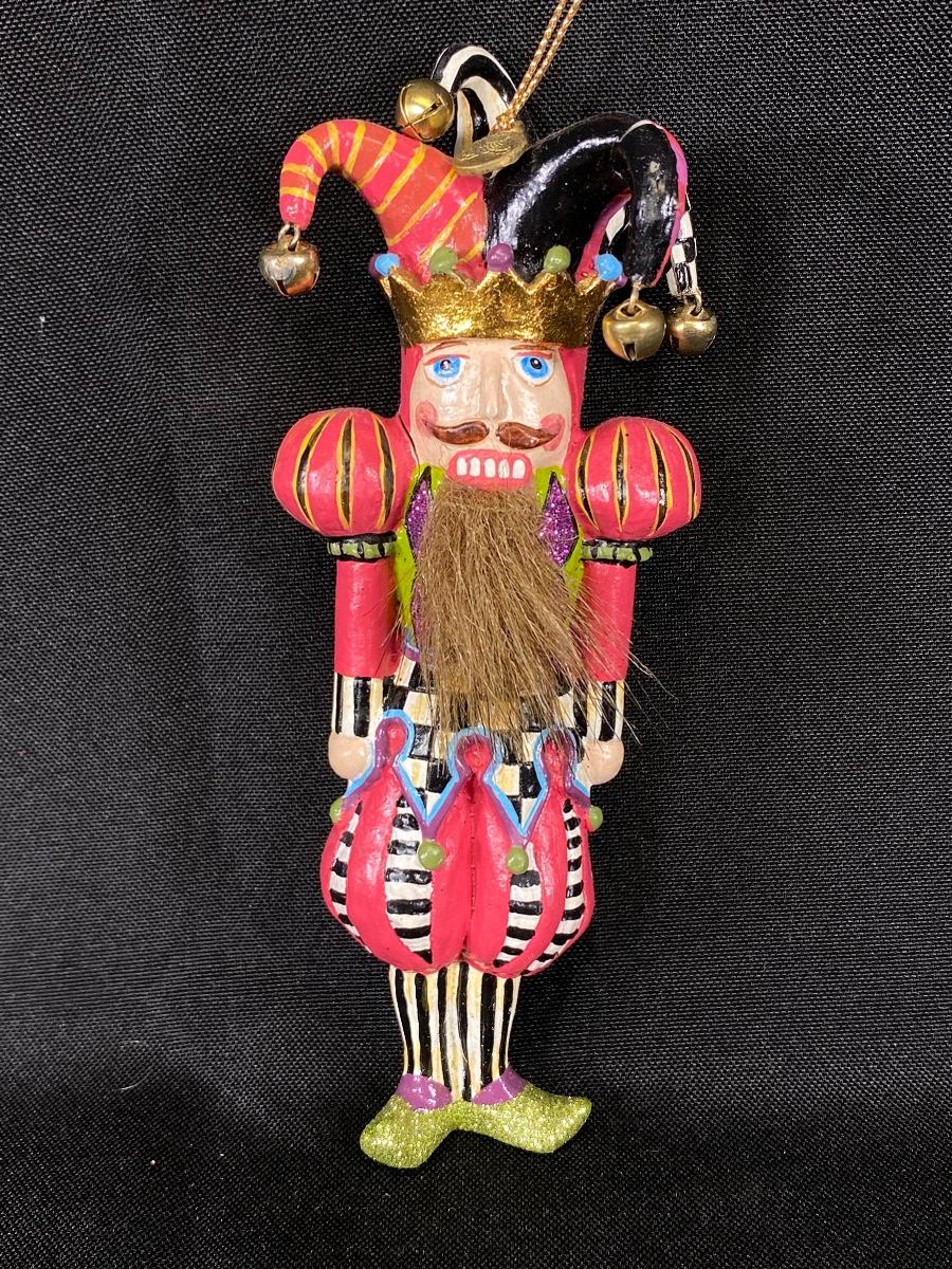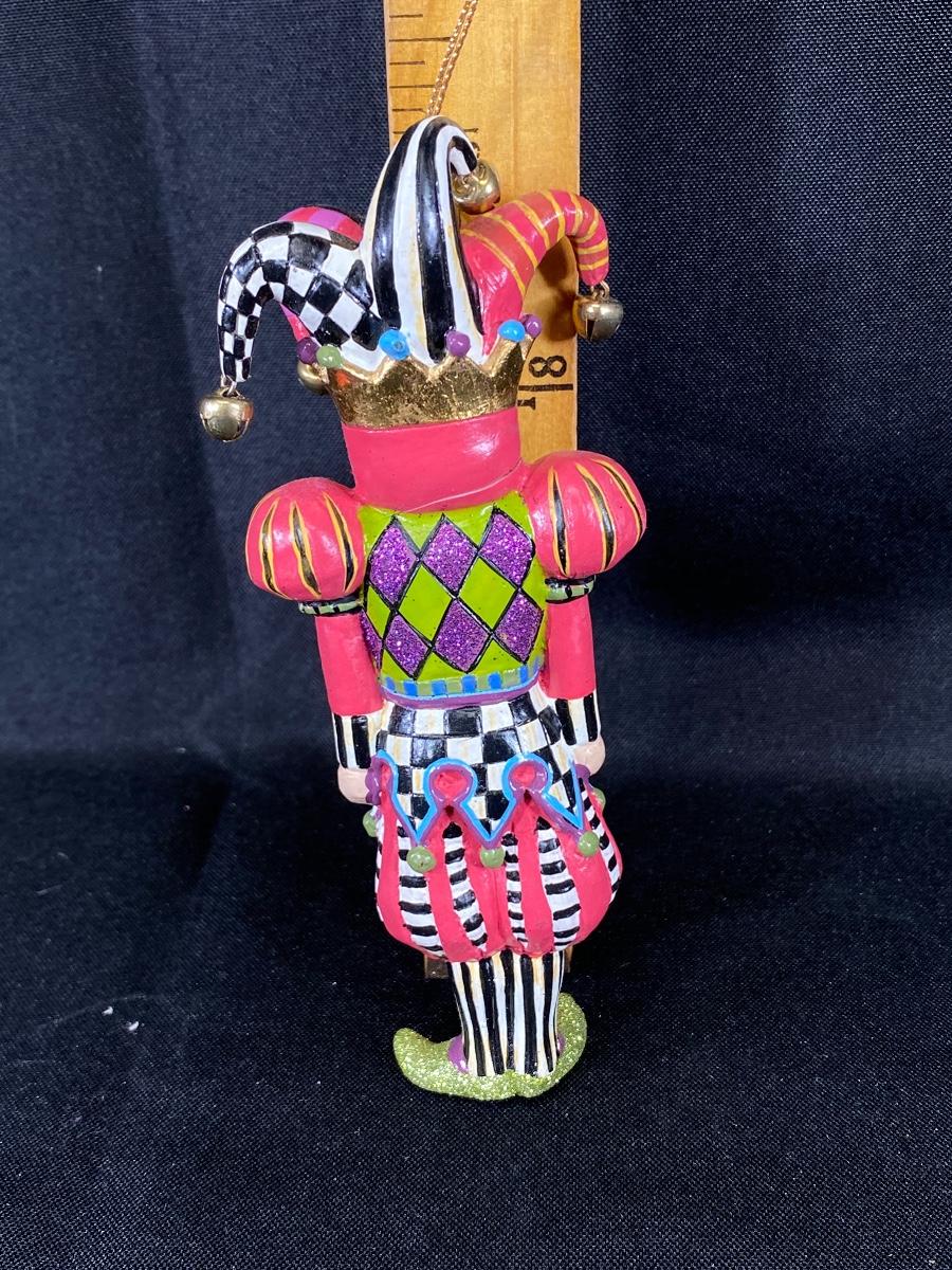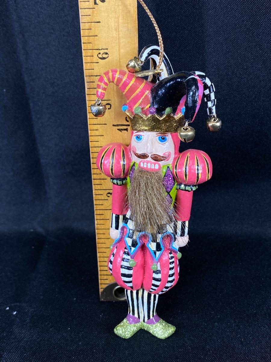 6" nut cracker soldier court jester ornament. Colorfully painted. Has a crack at one shoulder but displays nice.