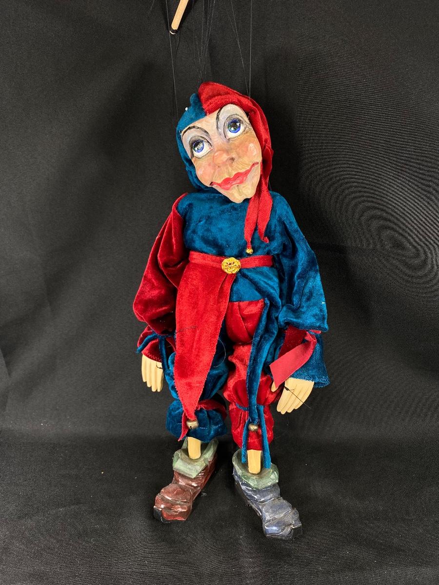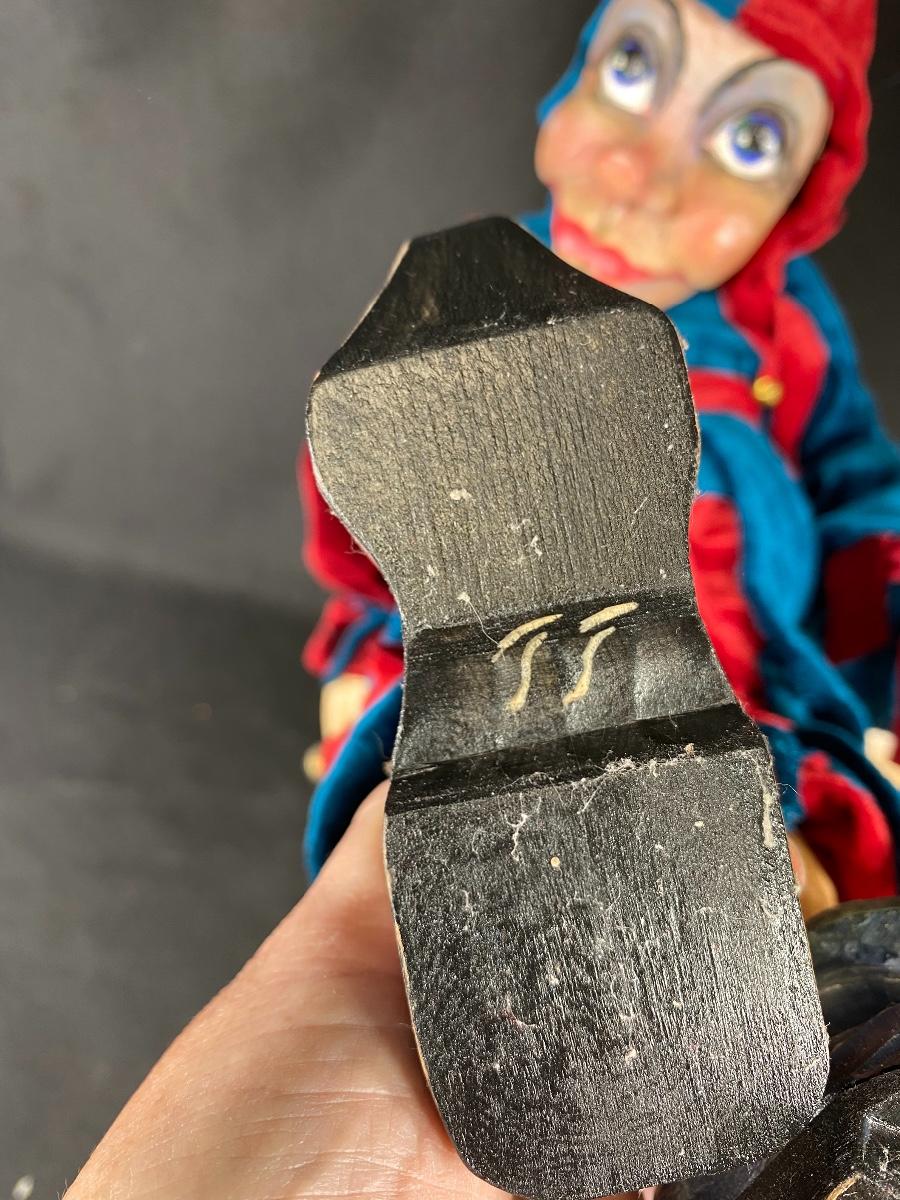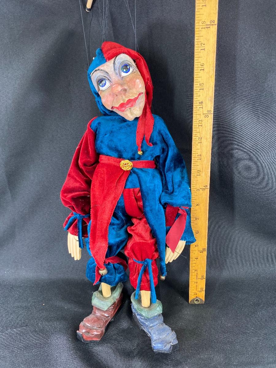 Wood court jester string puppet marionette. Red and blue outfit. Good condition but strings are tangled. There is a maker mark on the bottom of one shoe. About 15" size without strings.