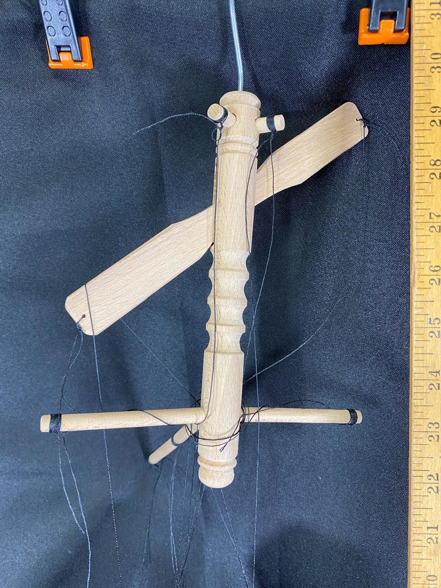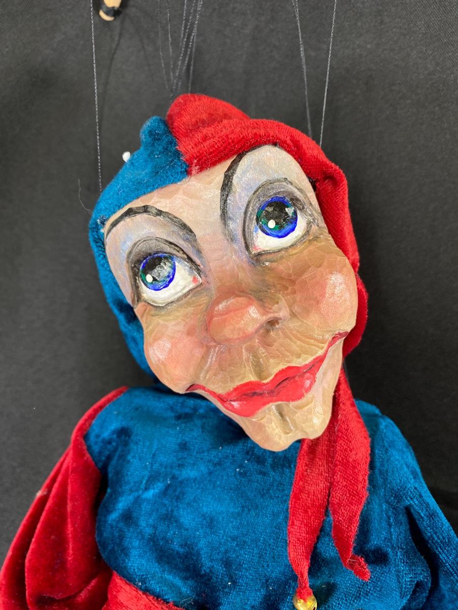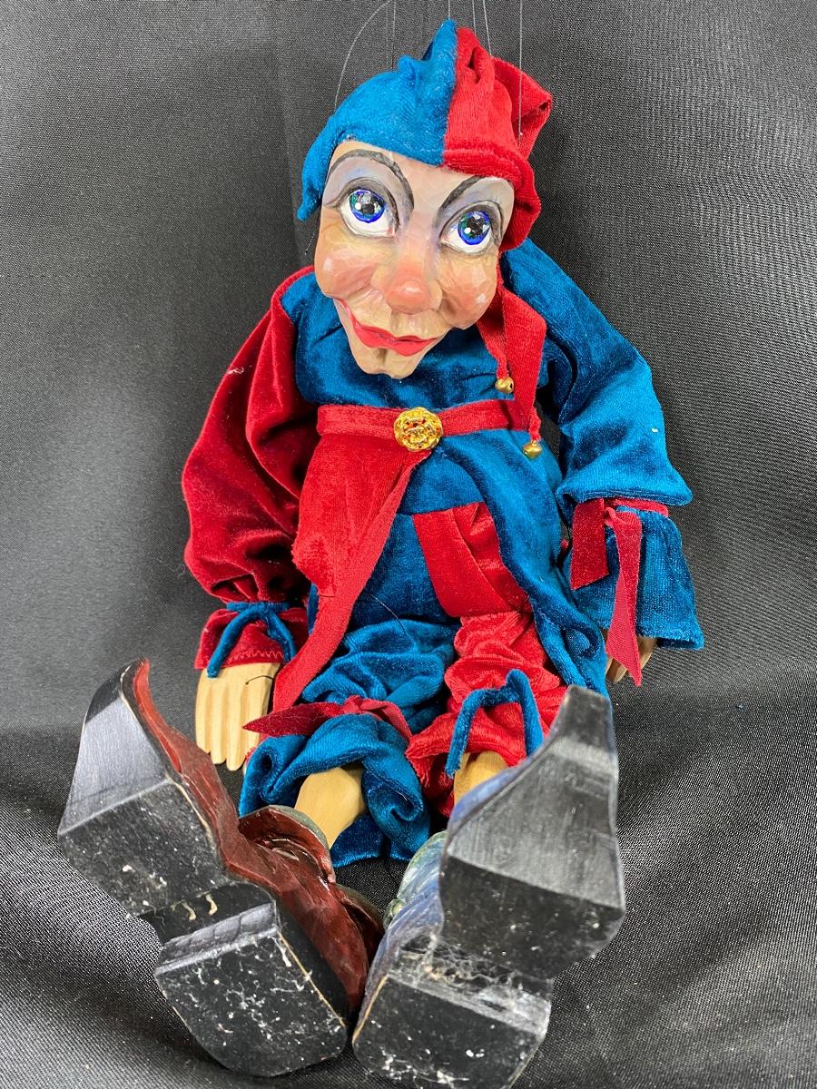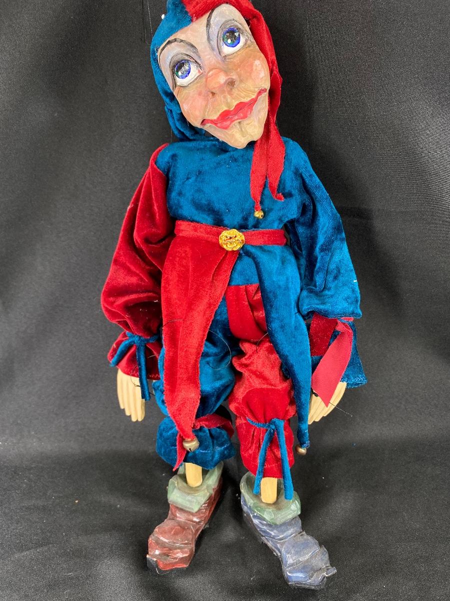 Wood court jester string puppet marionette. Red and blue outfit. Good condition but strings are tangled. There is a maker mark on the bottom of one shoe. About 15" size without strings.