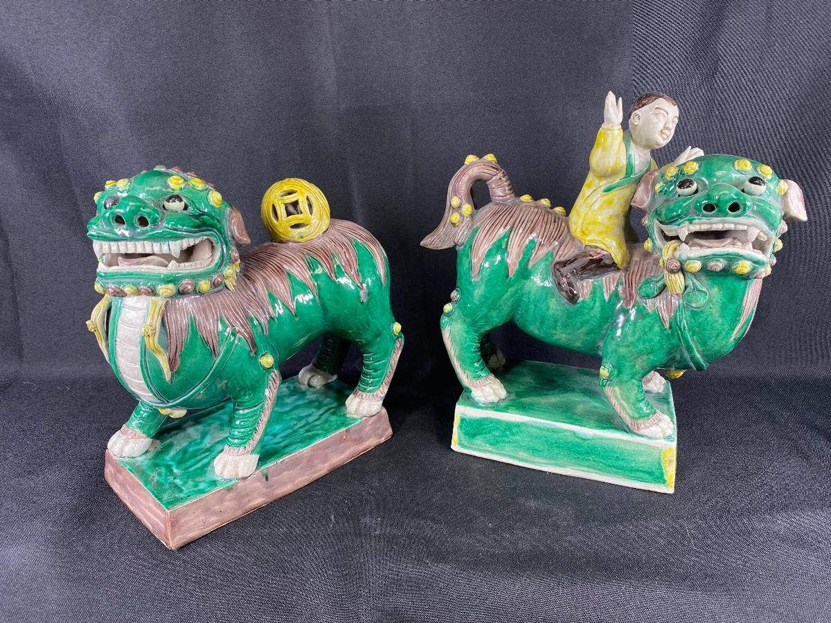 Pair of yellow and green Foo Dog figurine statues. Similar in colors. Could be used as bookends, heavy. About 10" height. No maker marks.