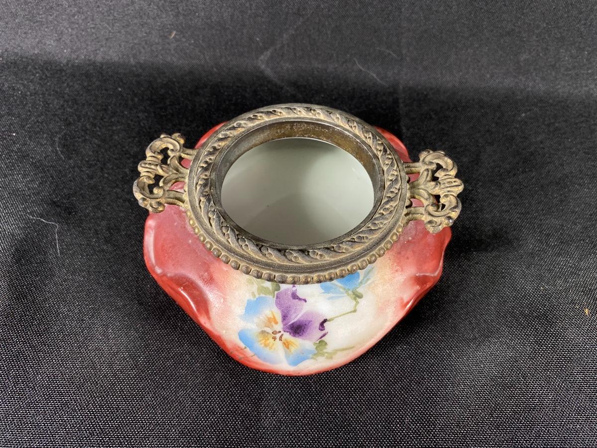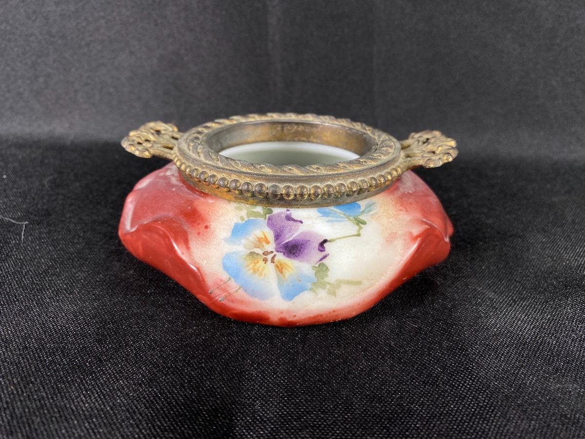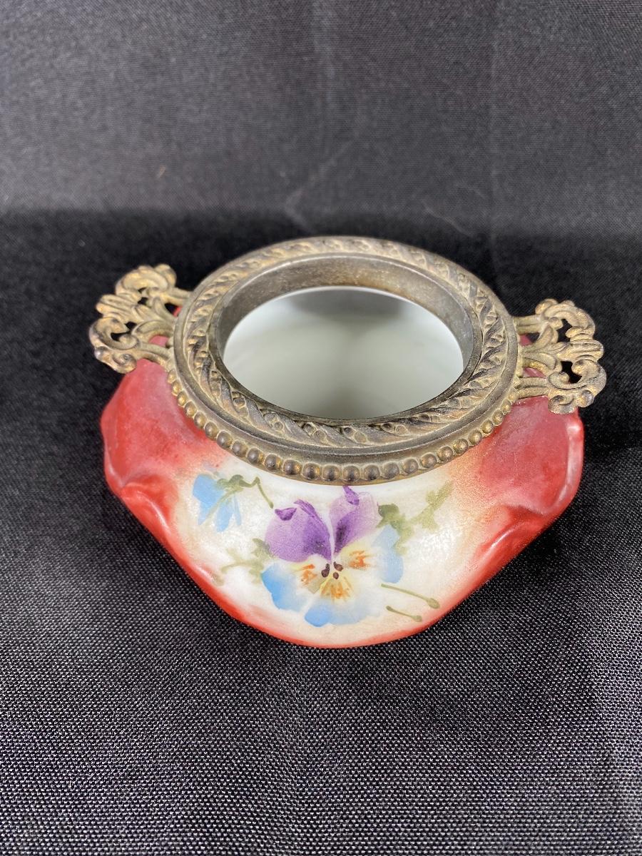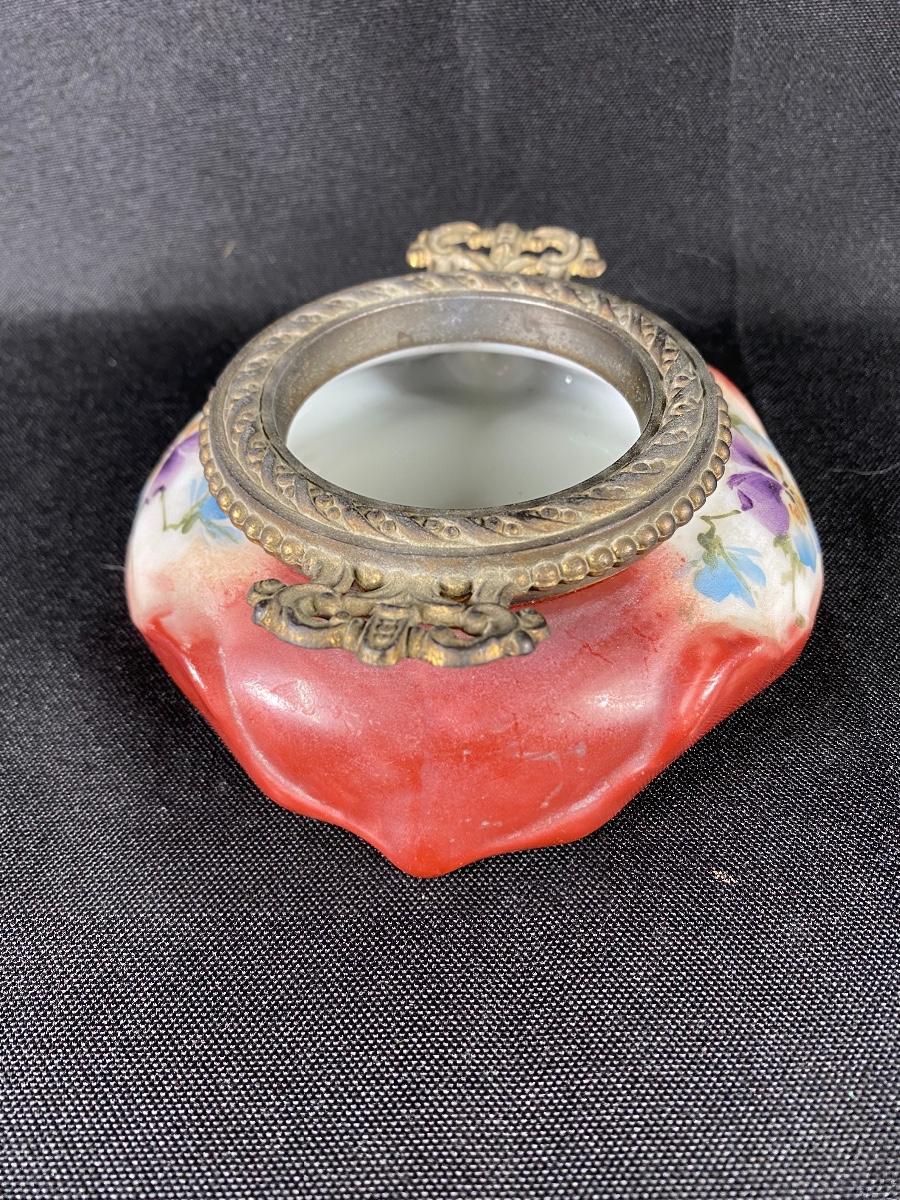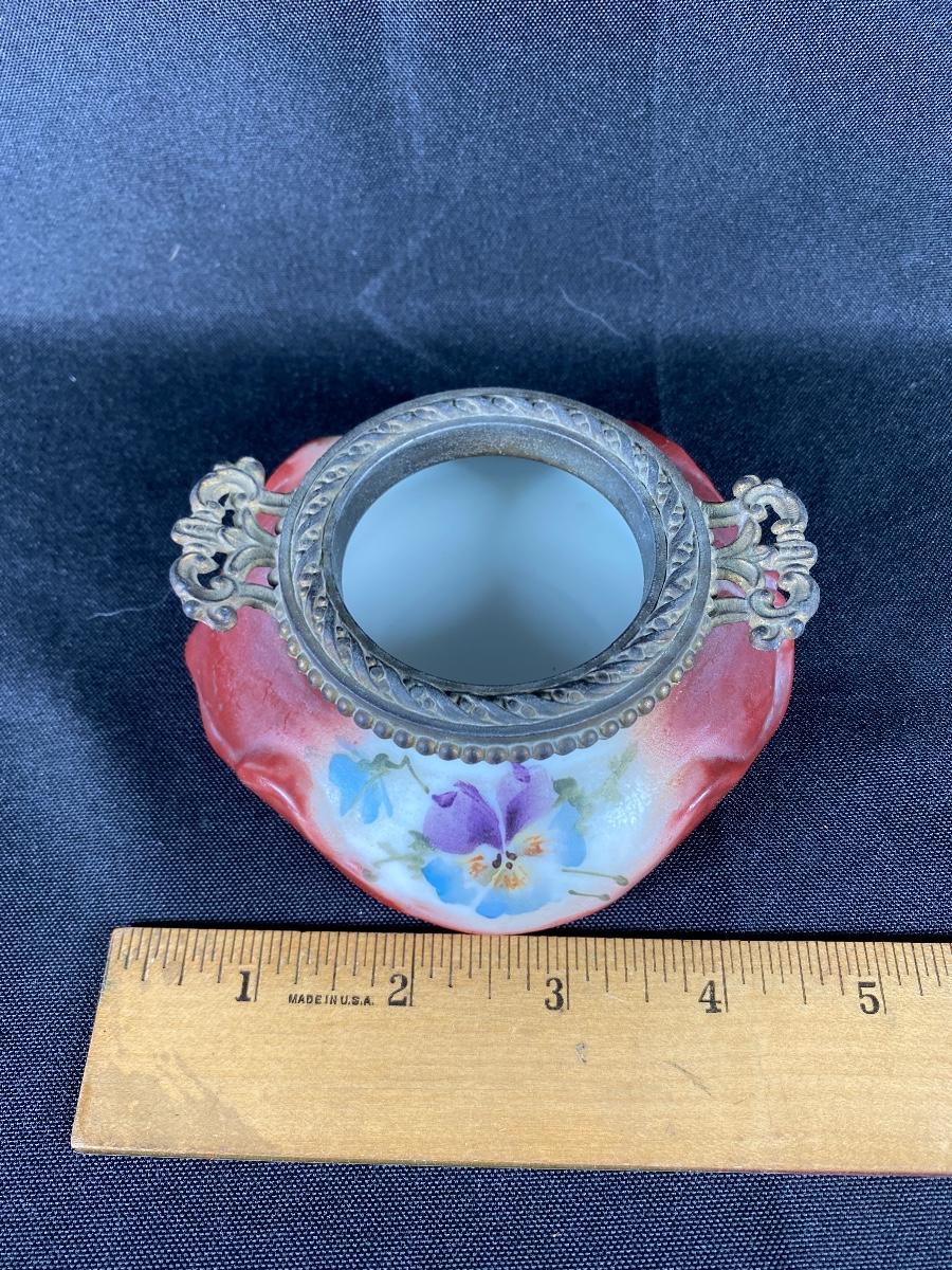 Antique Wave Crest glass dresser jar. Great for trinkets or jewelry. Red with a pansy flower on each side. The sides with handles are not identical, has an asymmetrical shape to it. In good antique condition, no chips just some fade. About 5" across and under 3" tall
