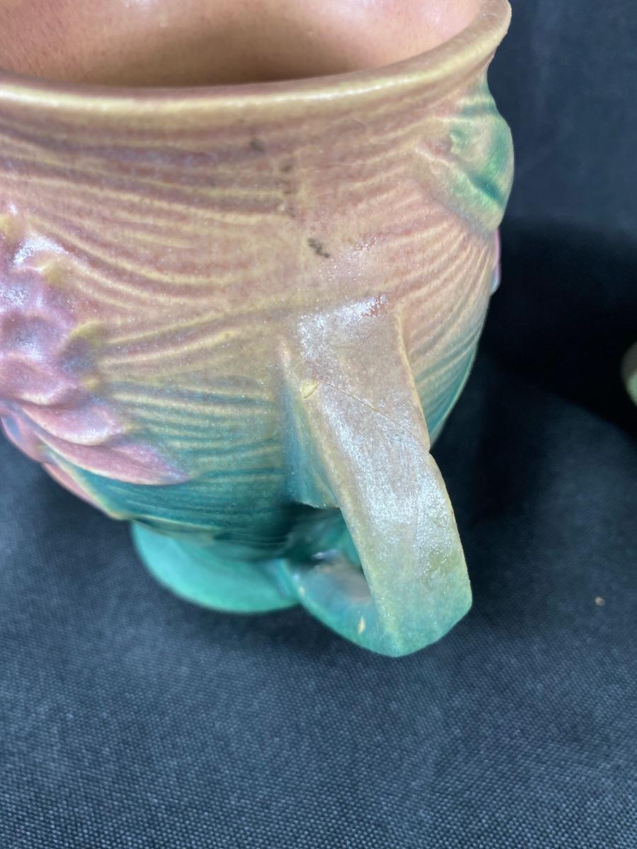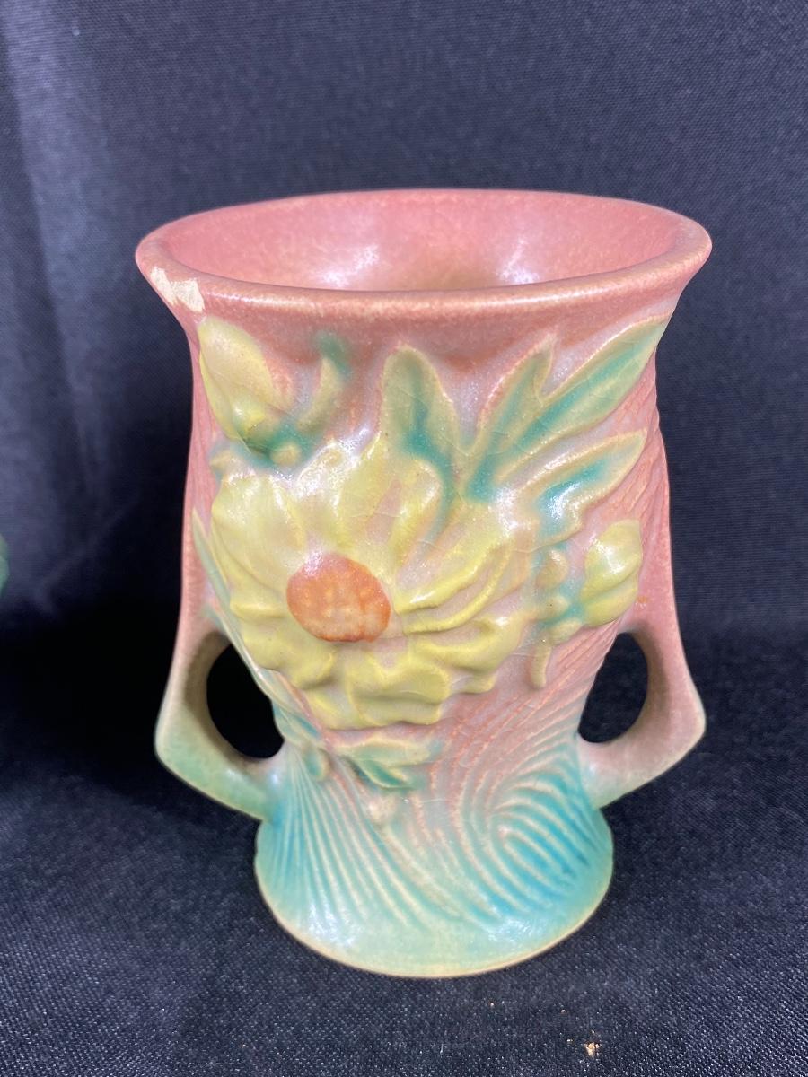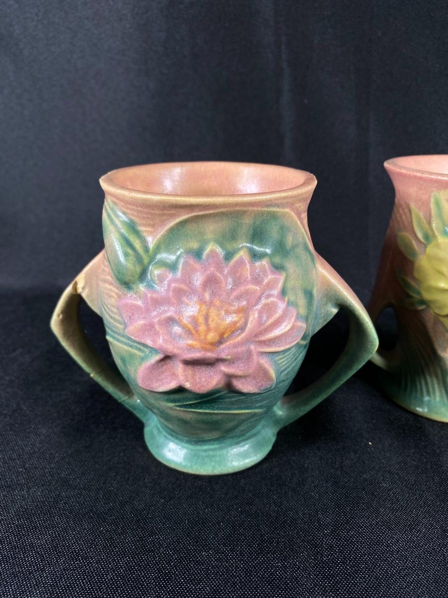 Vintage pair of Roseville pottery urn vases. Each is about 4" size. Double handle. Flower pattern on both. The one with the pink water lily flower has a repaired handle. The yellow daisy flower one has a chip in the edge. Both display nicely.