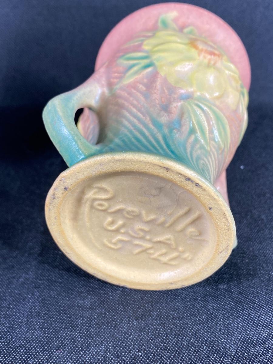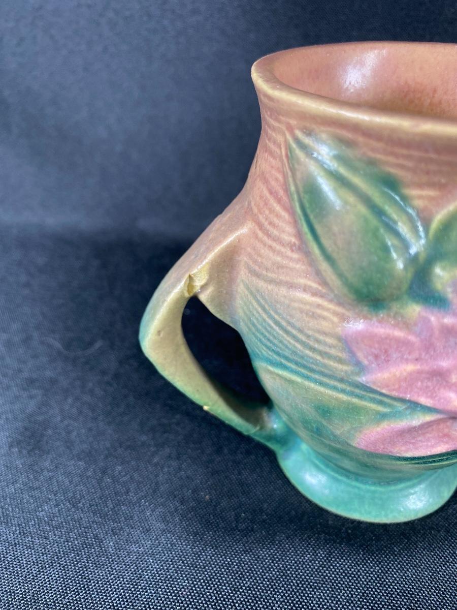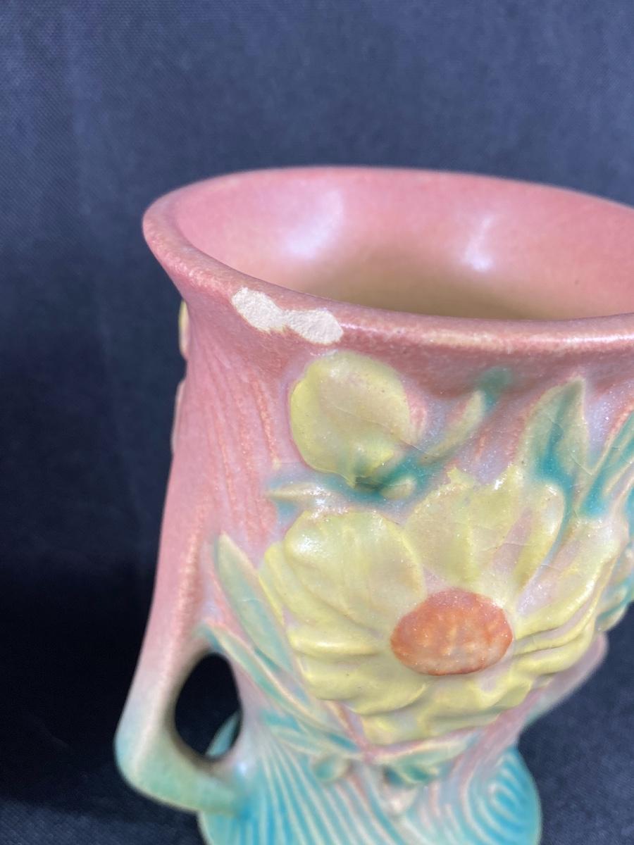Vintage pair of Roseville pottery urn vases. Each is about 4" size. Double handle. Flower pattern on both. The one with the pink water lily flower has a repaired handle. The yellow daisy flower one has a chip in the edge. Both display nicely.