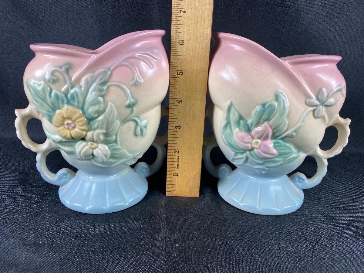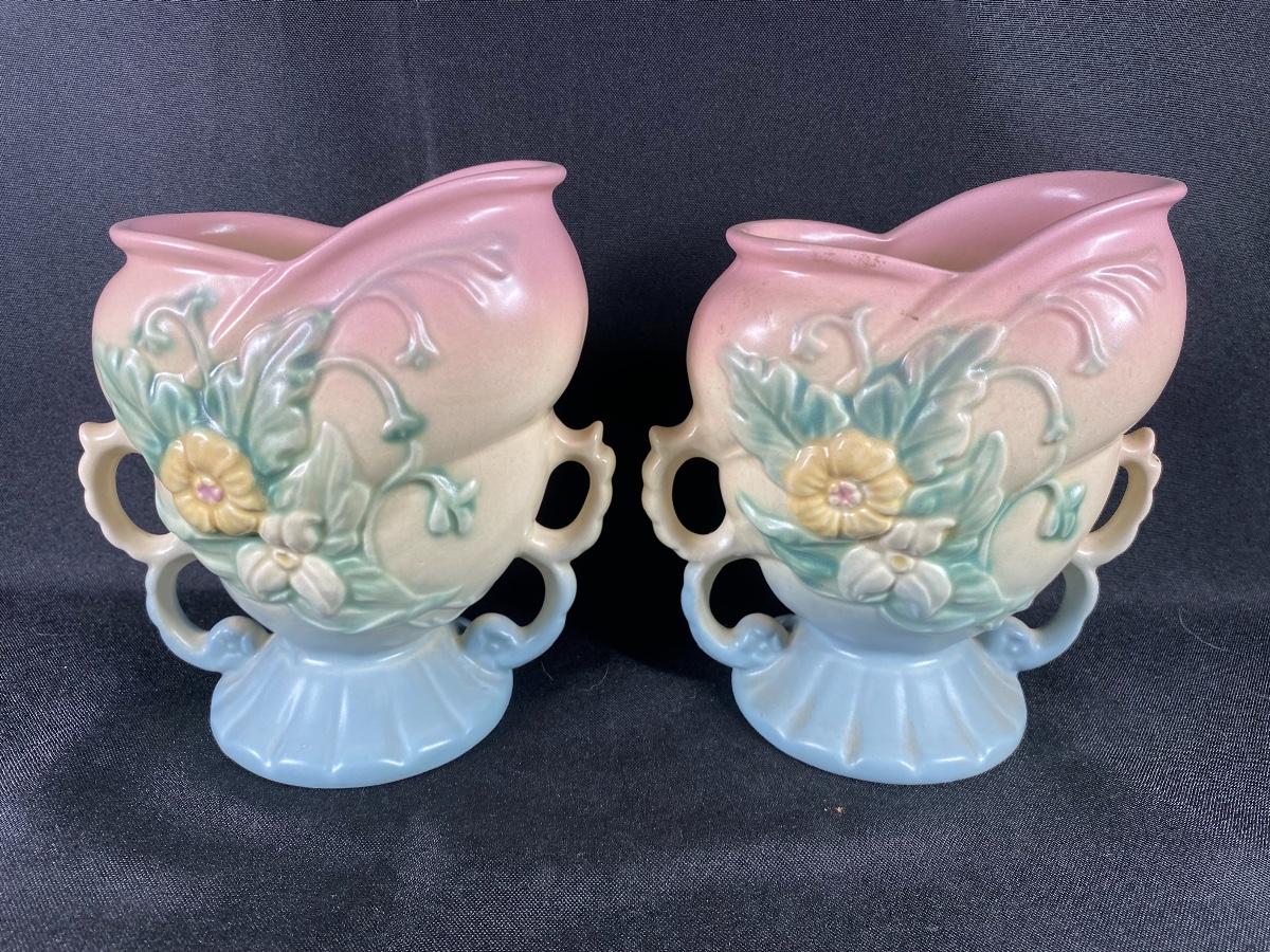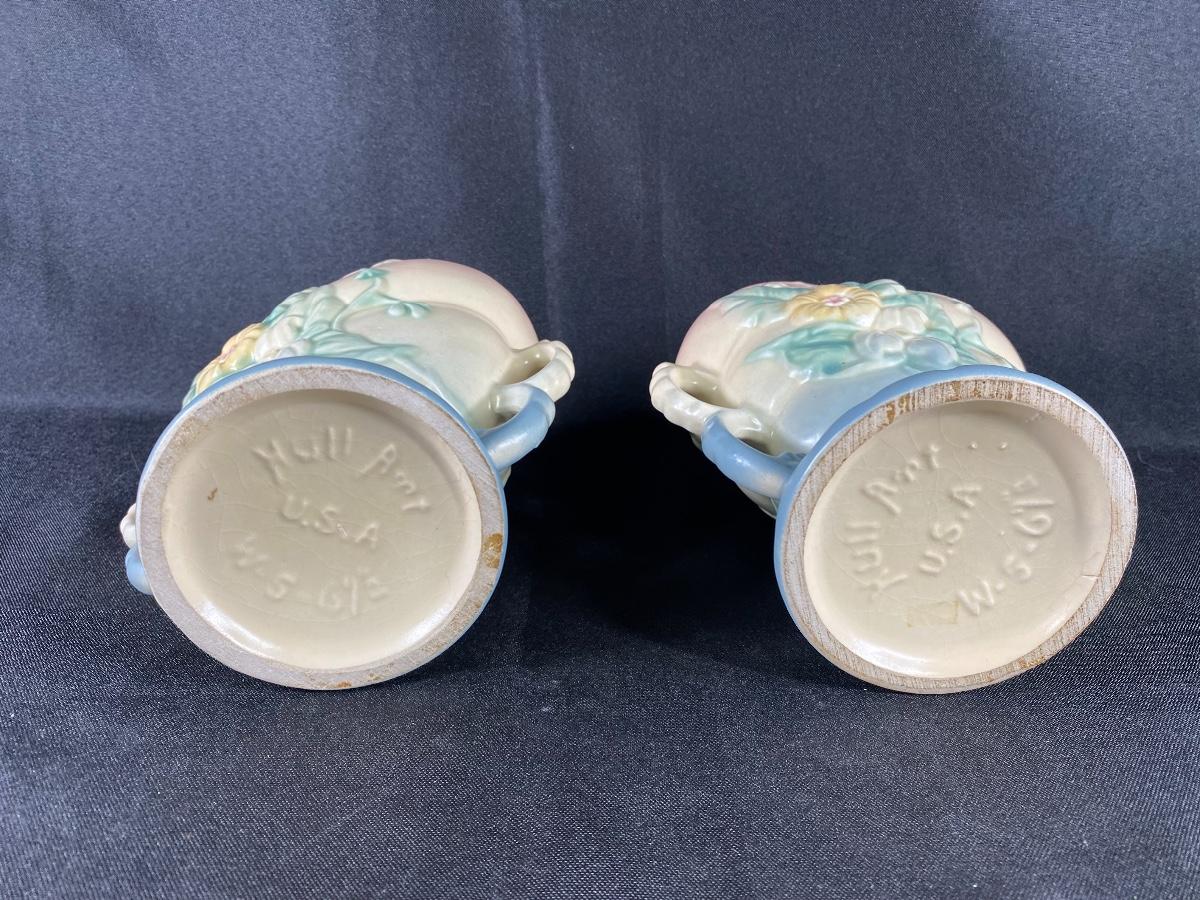 Vintage matching Hull Pottery wildflower urn vases. Double handle. Powder pink to baby blue with a flower pattern on each side. One side is a pink flower the other yellow. In great vintage condition, no damage noticed. Marked on the bottom. About 6.5" tall.