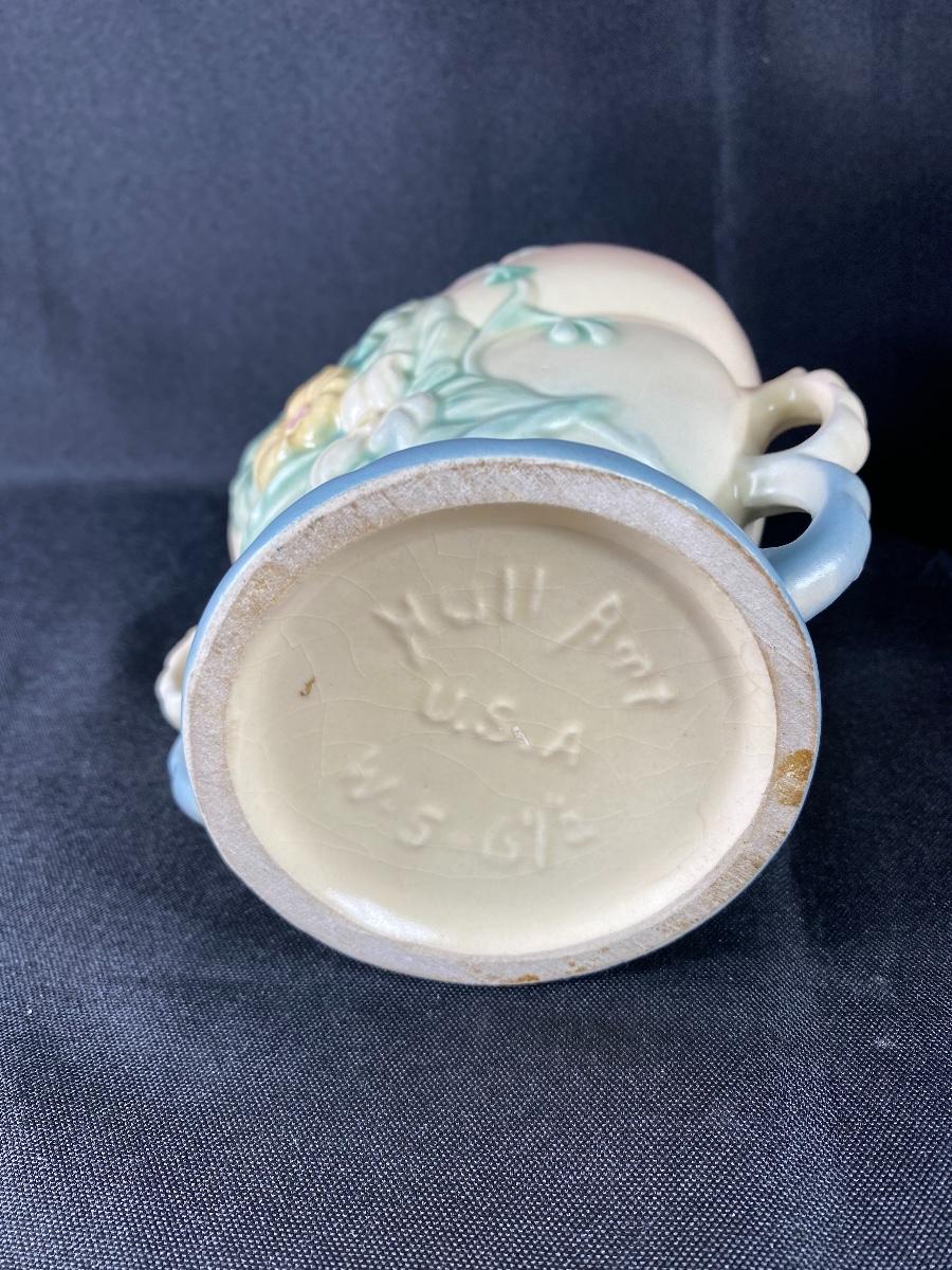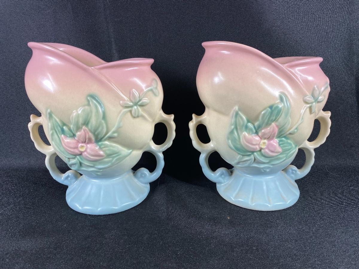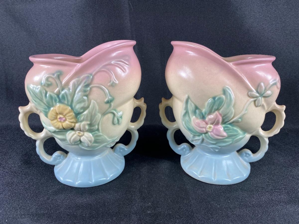 Vintage matching Hull Pottery wildflower urn vases. Double handle. Powder pink to baby blue with a flower pattern on each side. One side is a pink flower the other yellow. In great vintage condition, no damage noticed. Marked on the bottom. About 6.5" tall.