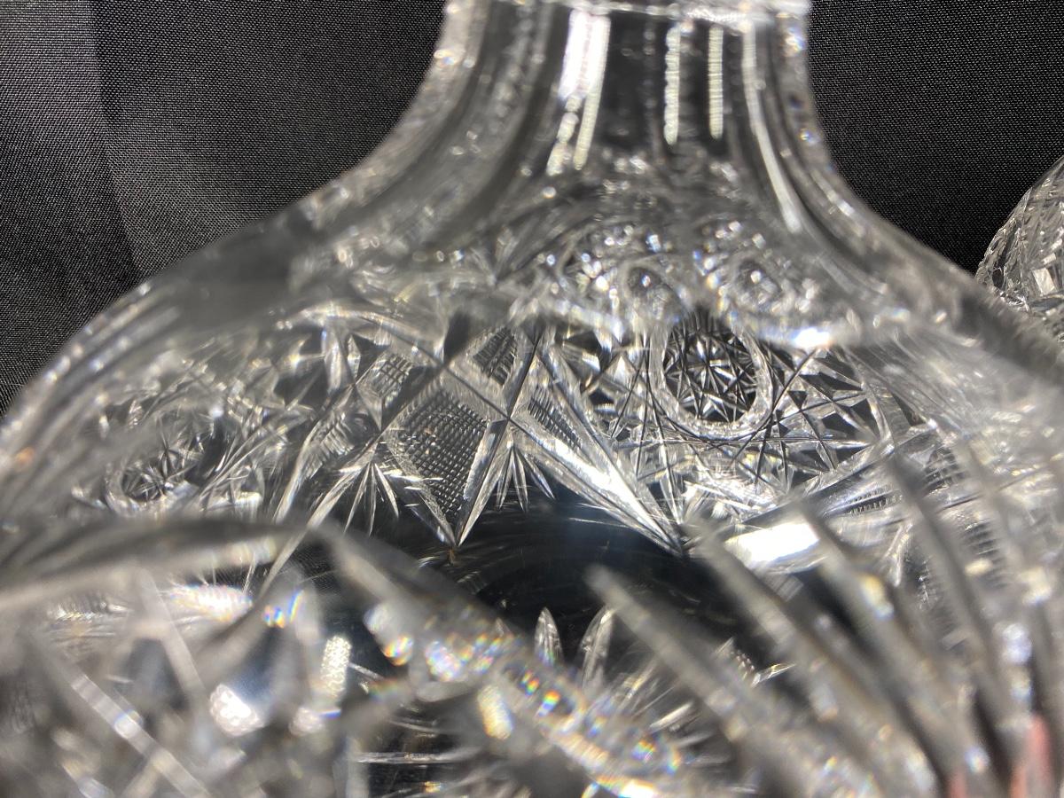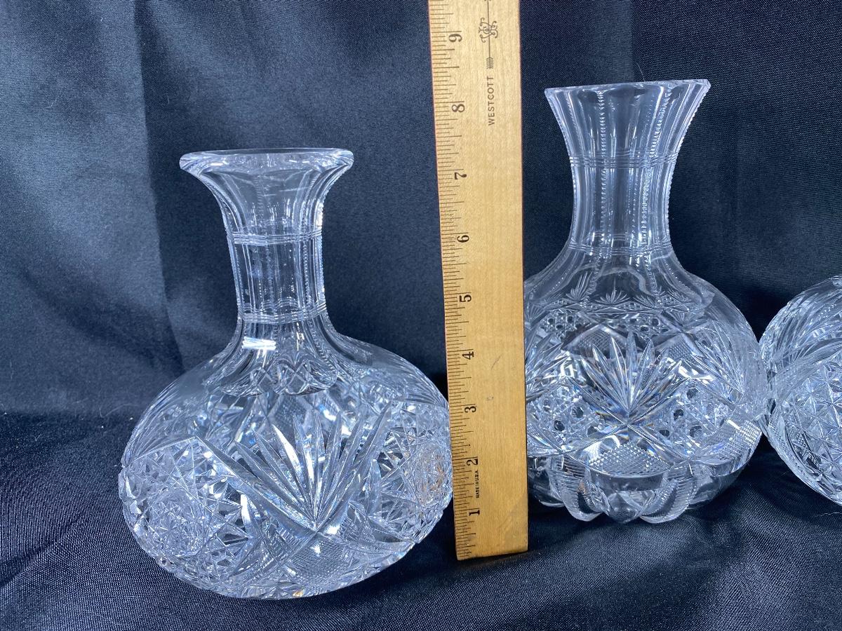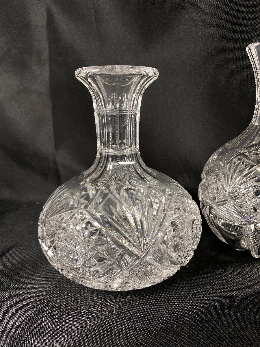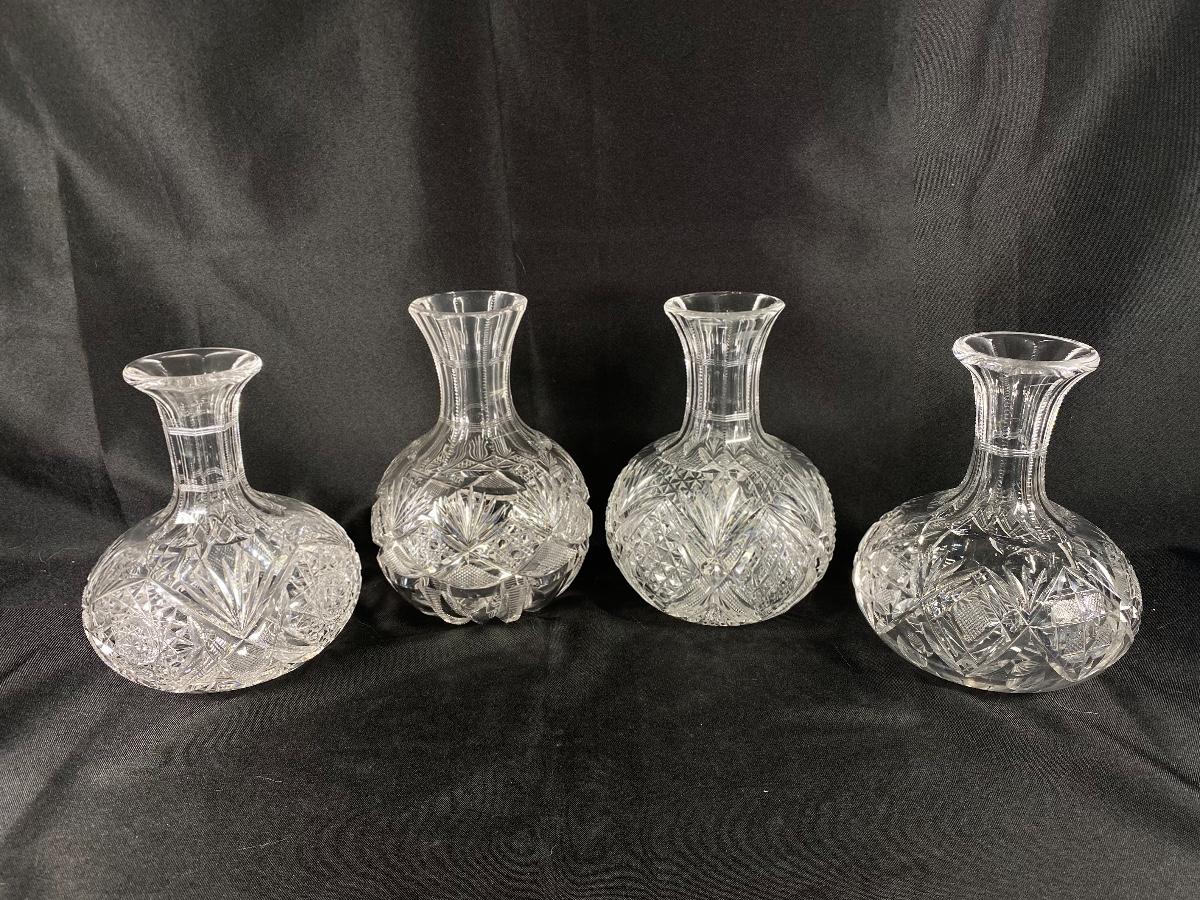 Set of 4 cut crystal decanter bottles. Highly detailed ornate cuts, each one different from the other. Heavy thick glass. None of them have the bottle stopper, would work great as vases. One does have a couple chips in the opening edge, other three do not. About 8" size.